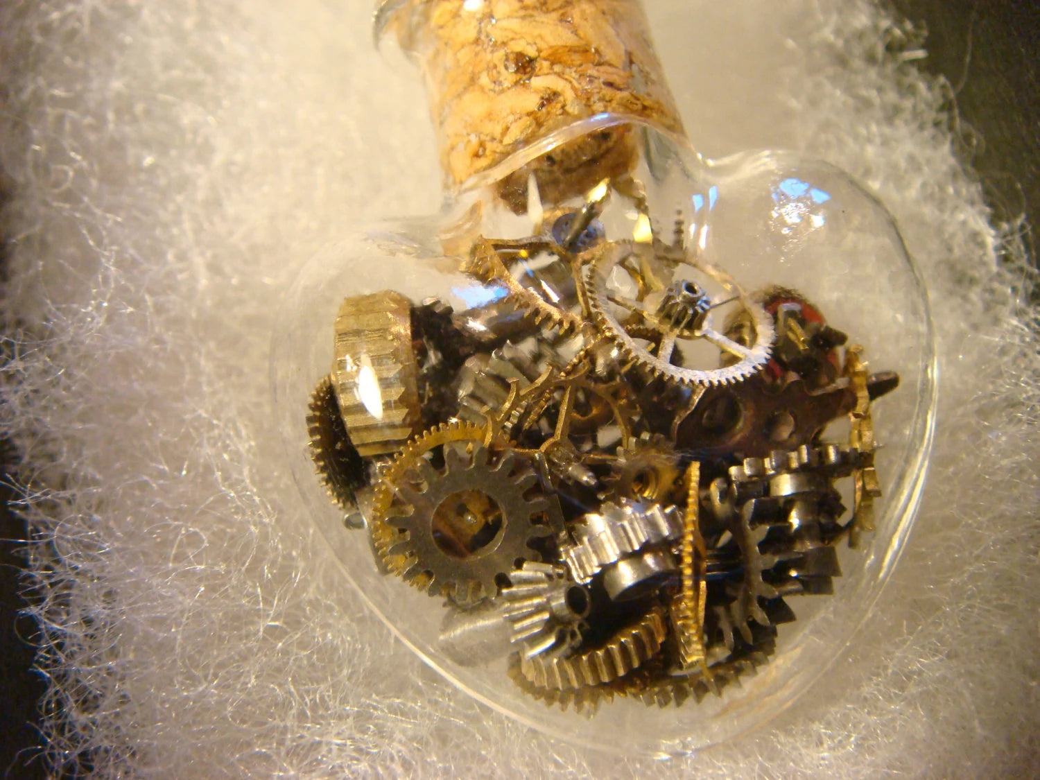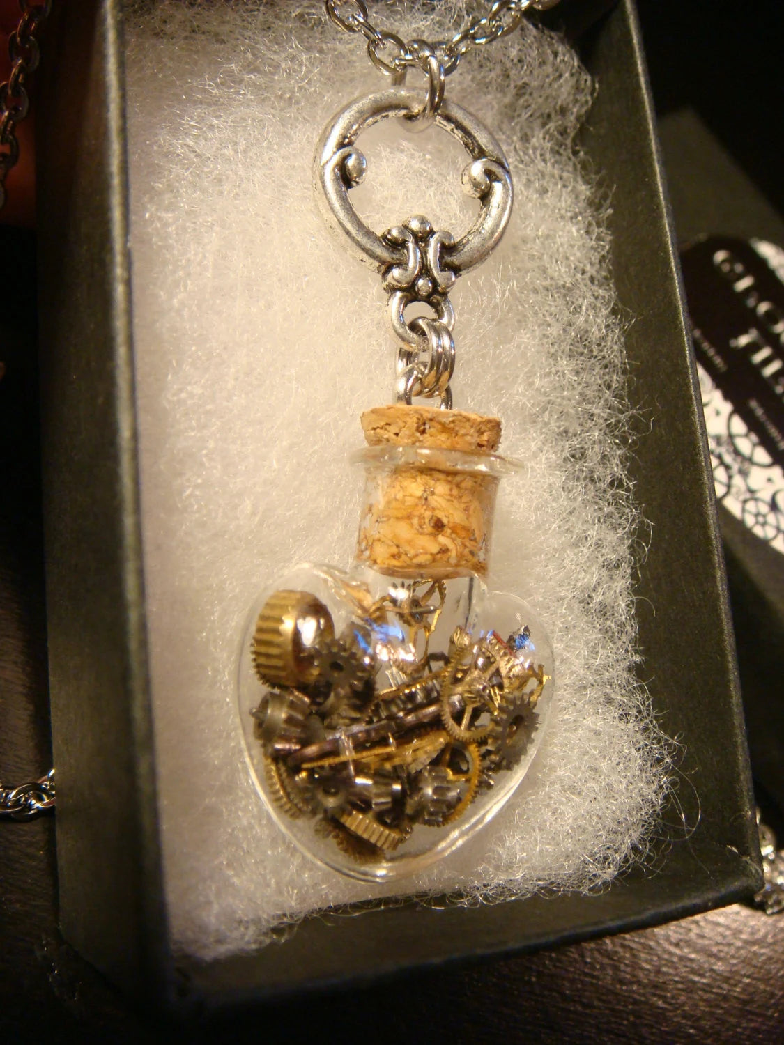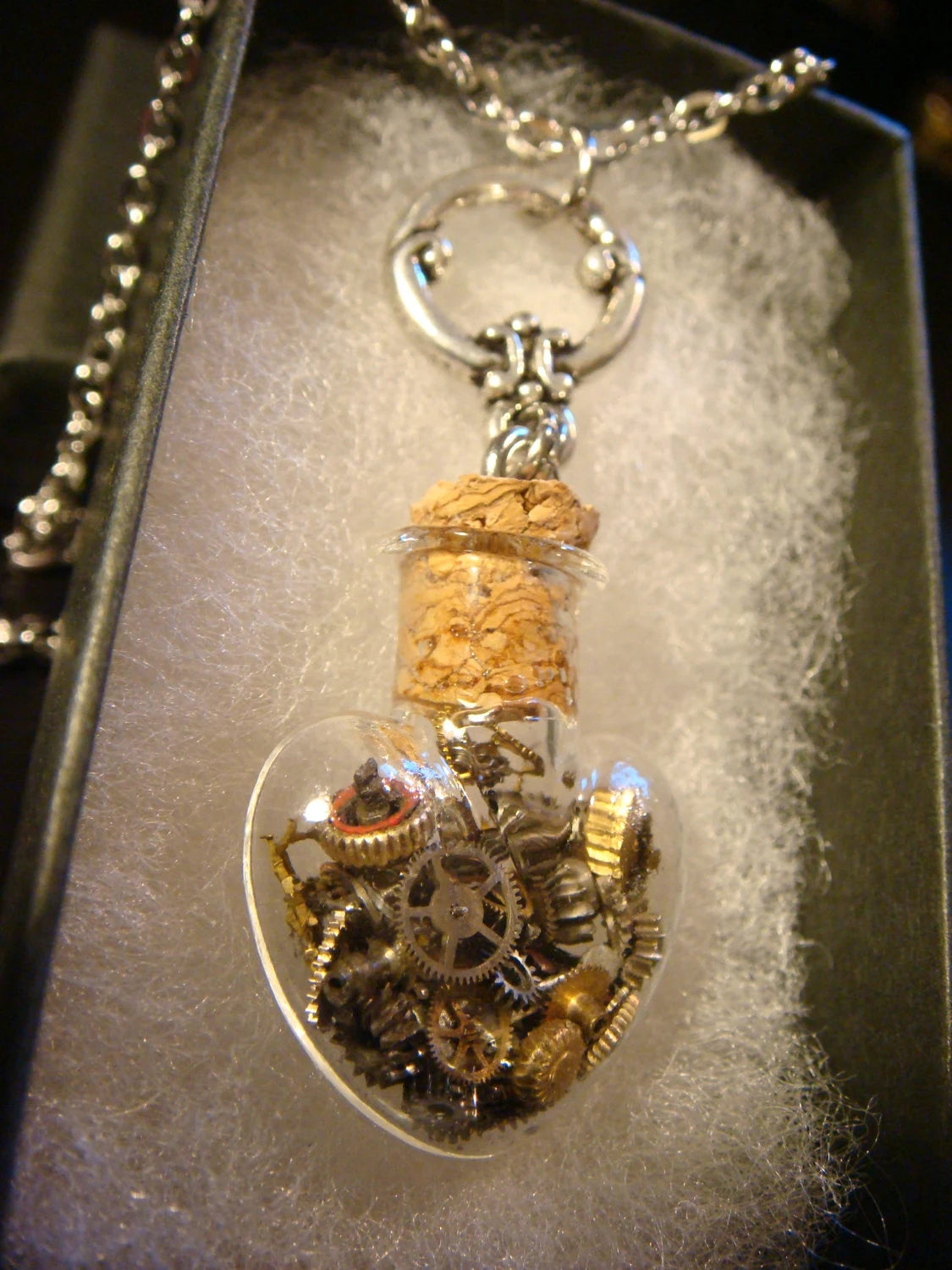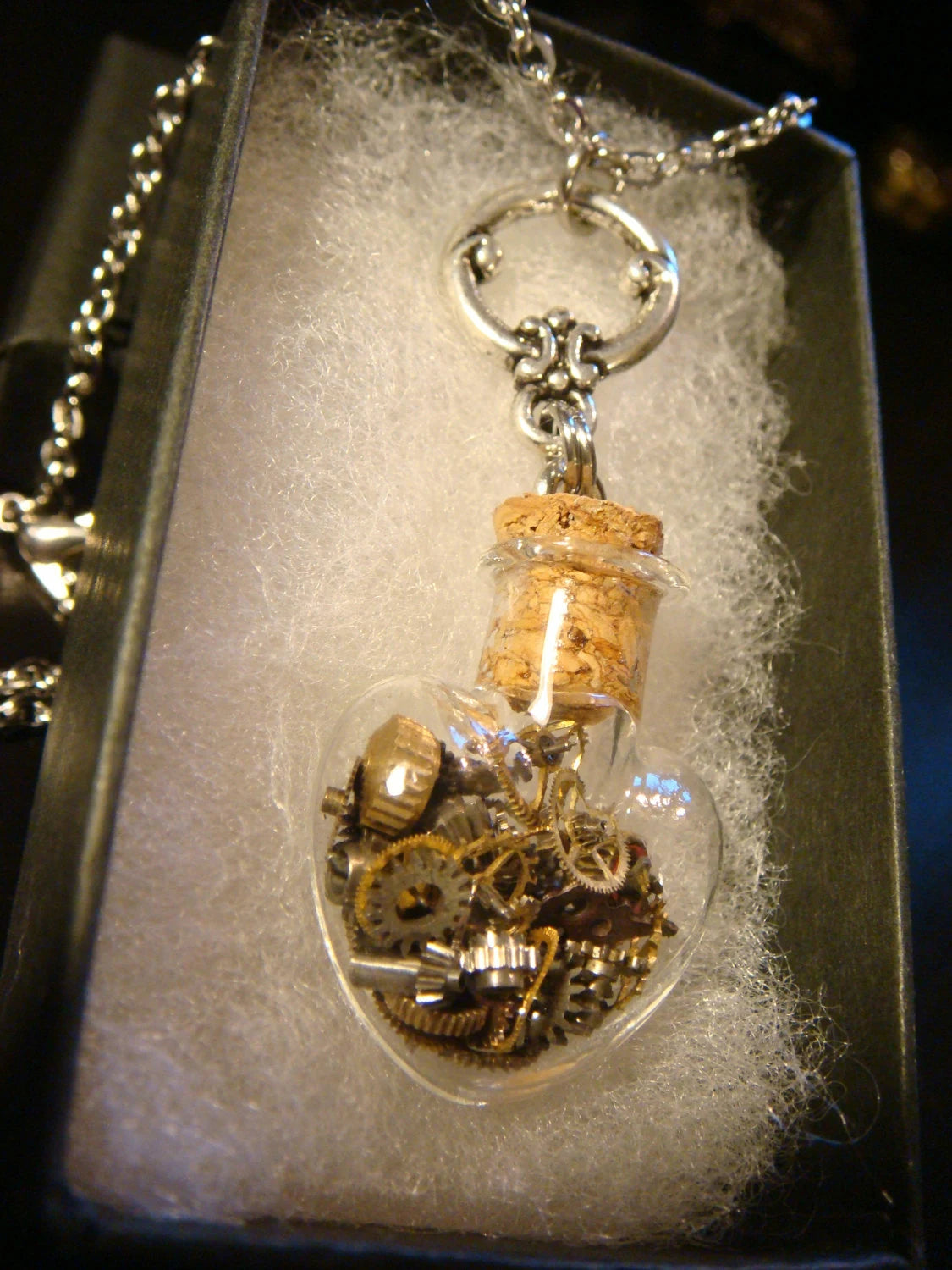 This unique necklace features tiny upcycled watch parts and gears in a tiny heart-shaped glass bottle.