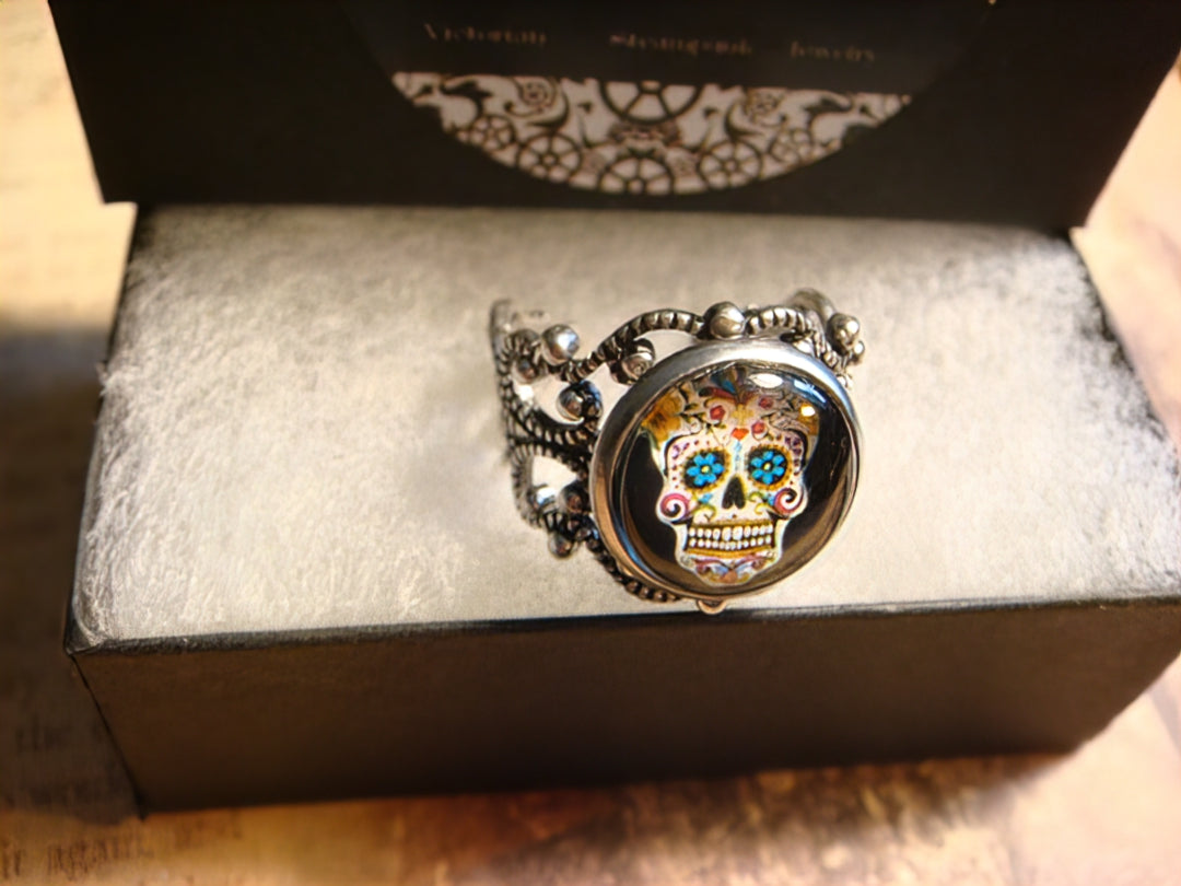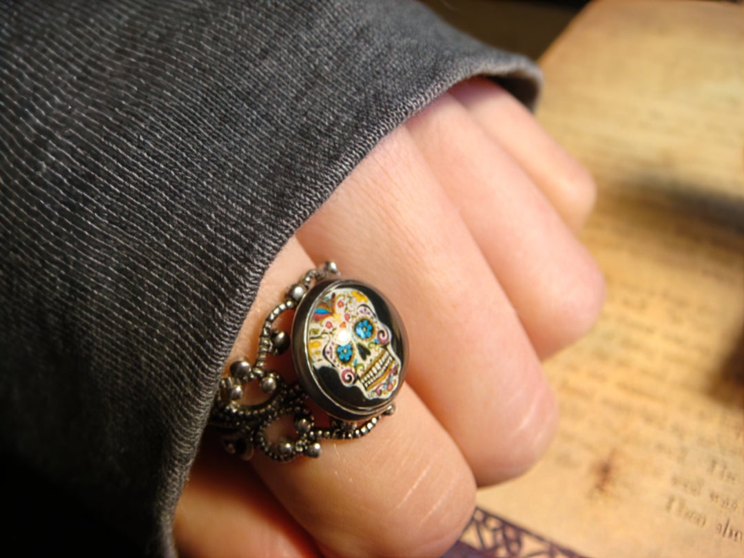 This beautiful ring features a sugar skull image cabochon set on a sturdy antique silver filigree Victorian style adjustable ring.