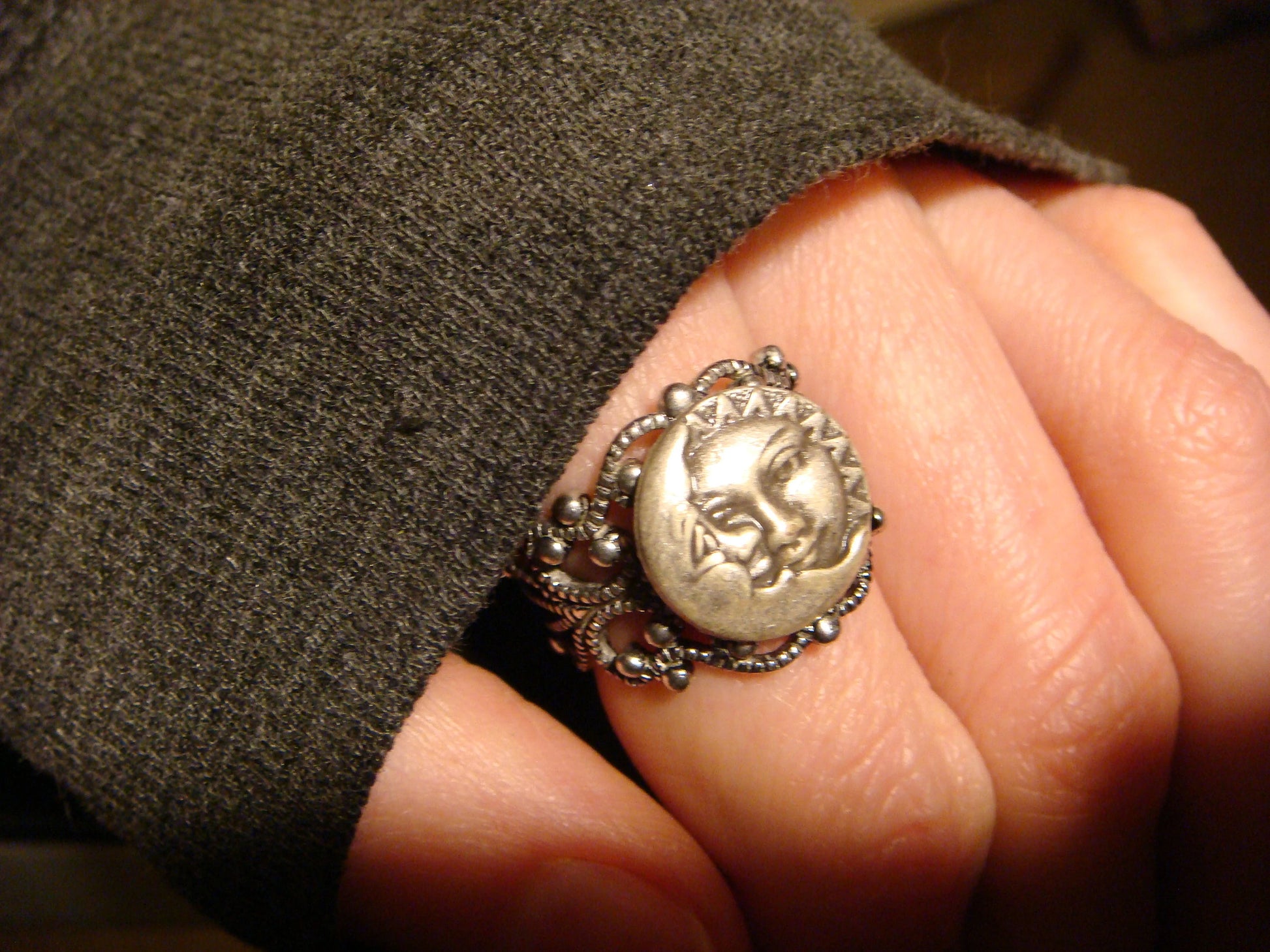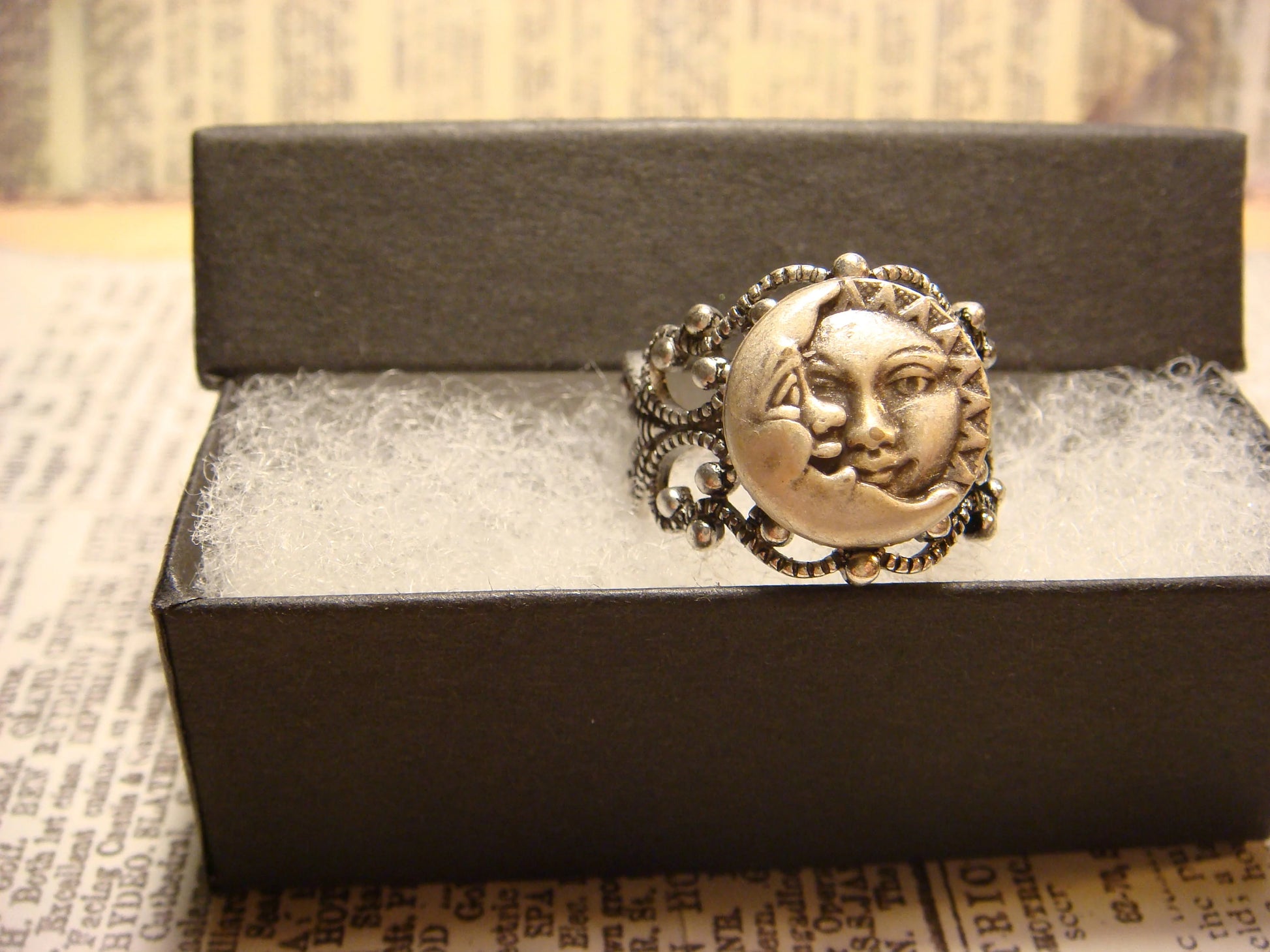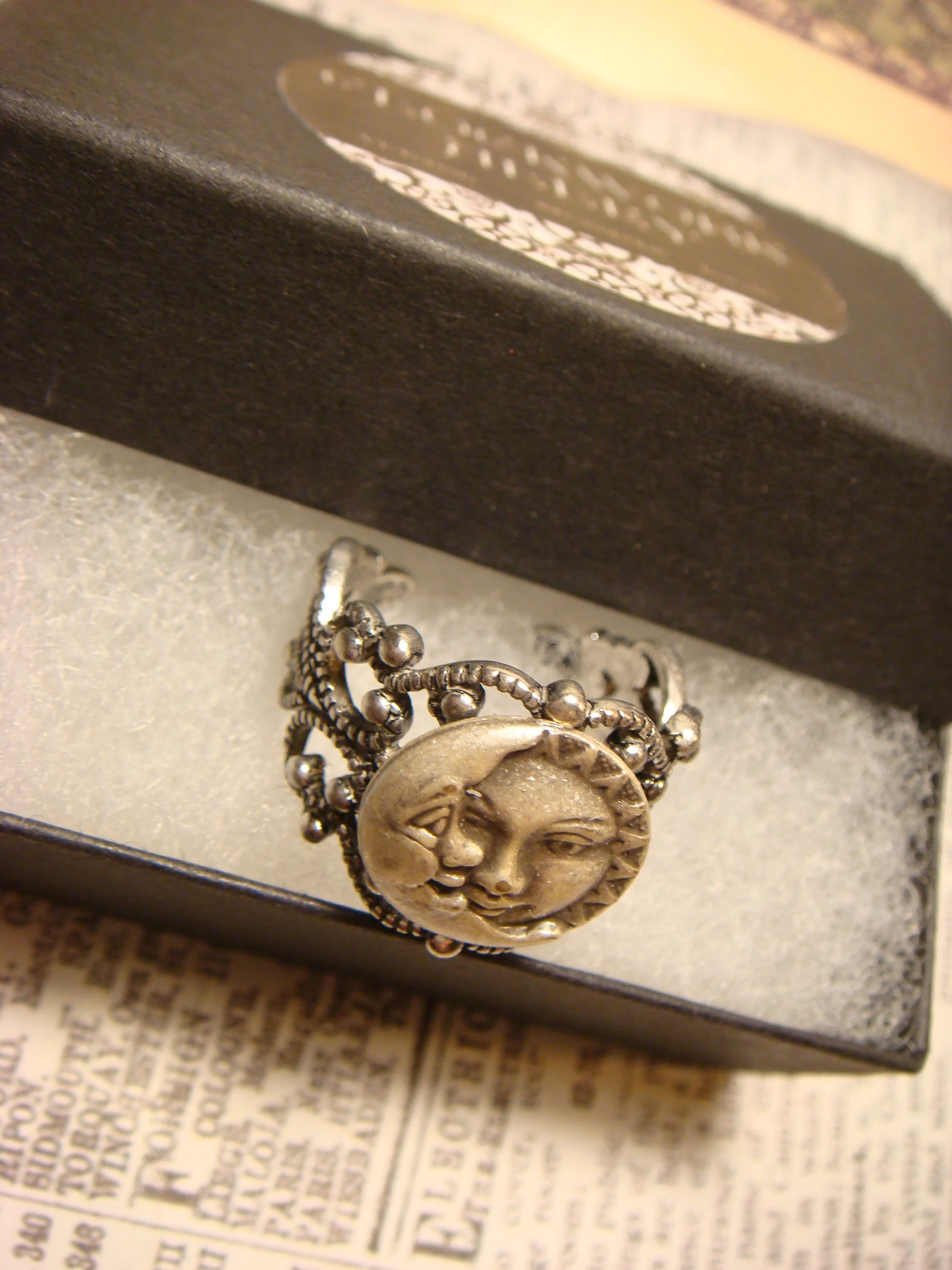 This beautiful ring features an antique silver sun and moon stamping set on a sturdy antique silver filigree Victorian style adjustable ring.