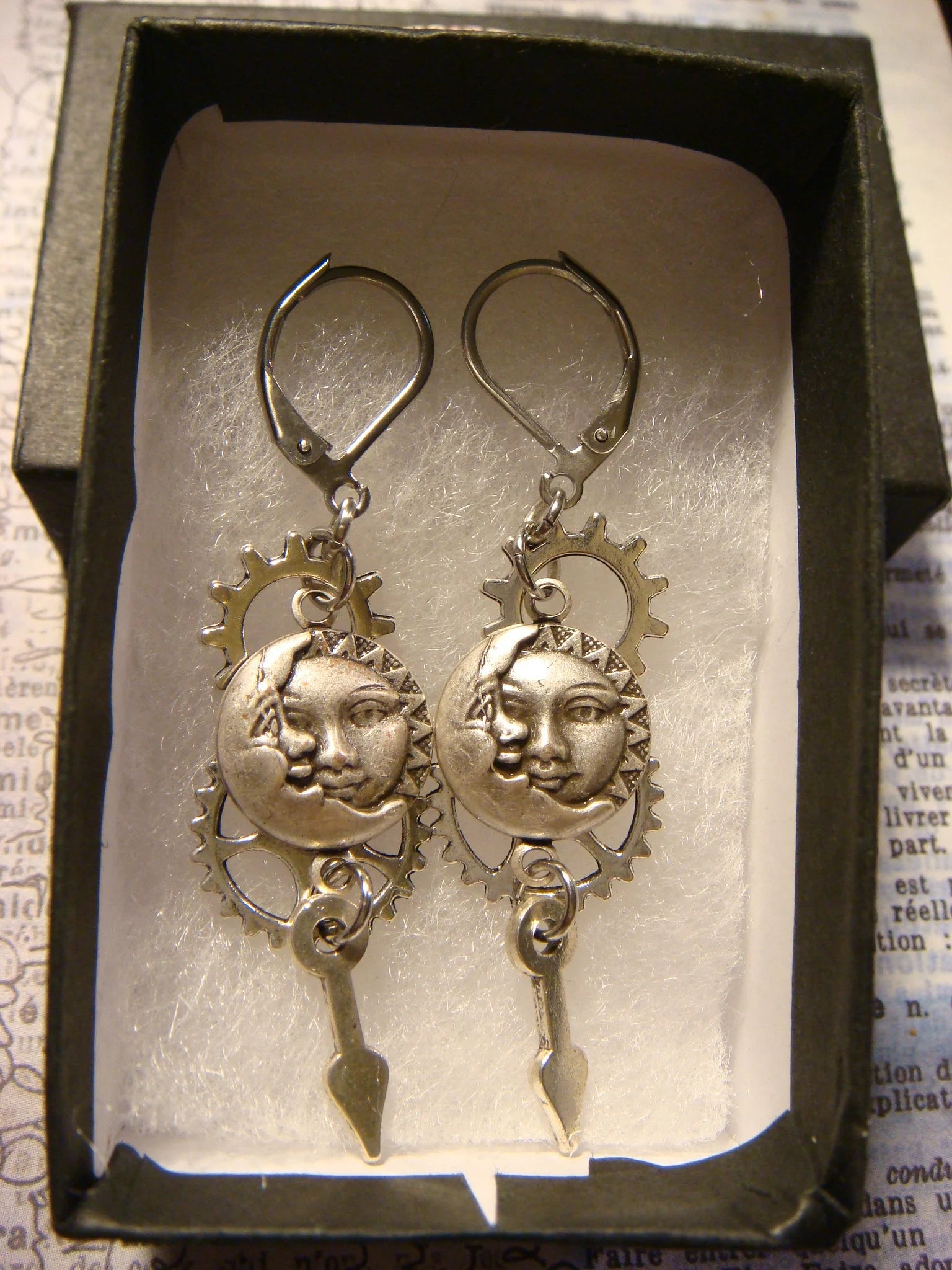 These steampunk earrings are made with antique silver sun and moon stampings with gears and cogs with clock hands hanging on stainless steel leverback earrings.