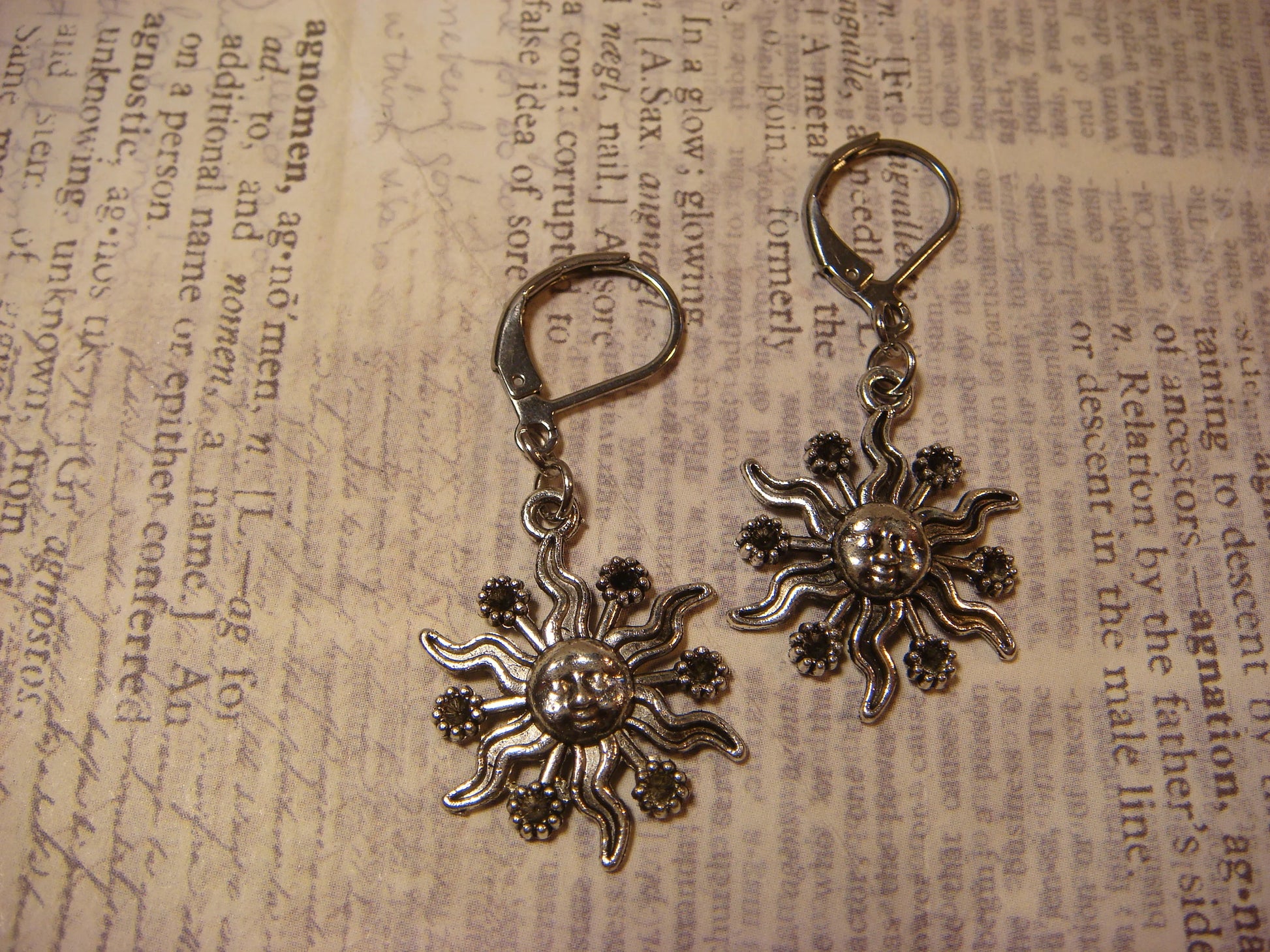 These earrings are made with antique silver sun charms hanging on stainless steel lever back earrings.