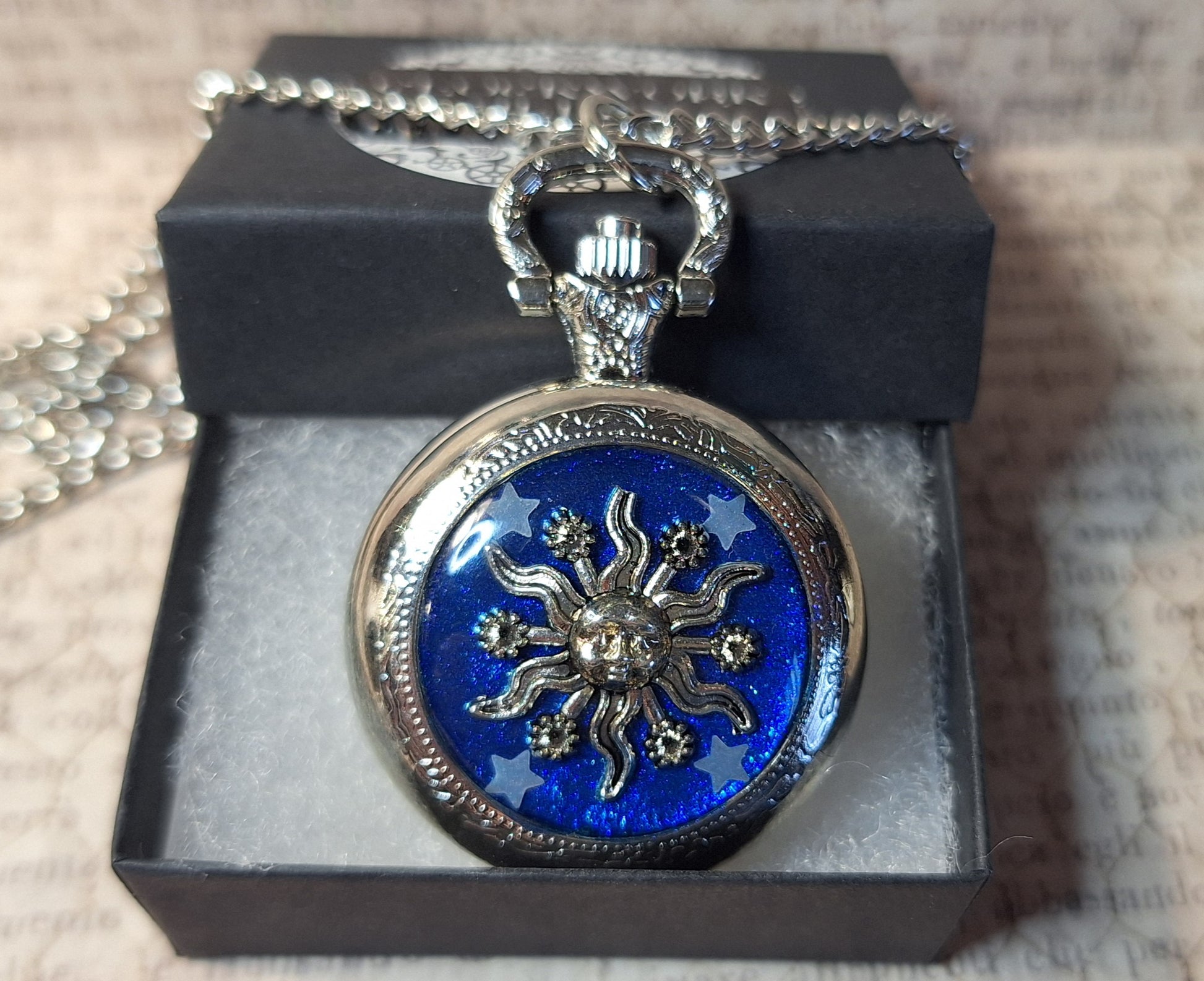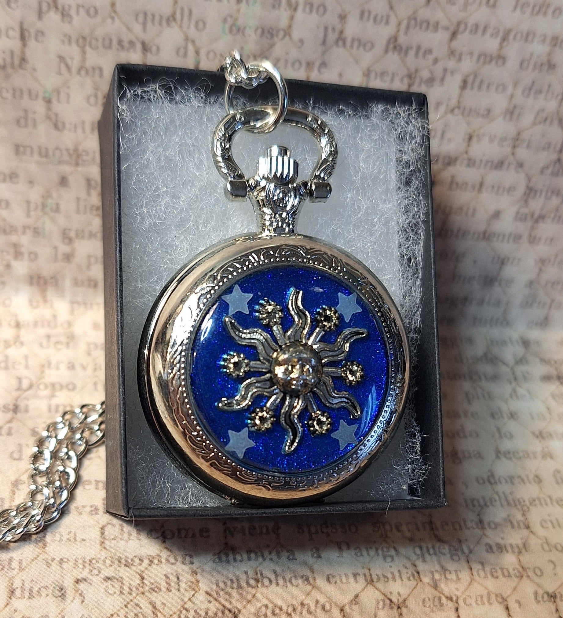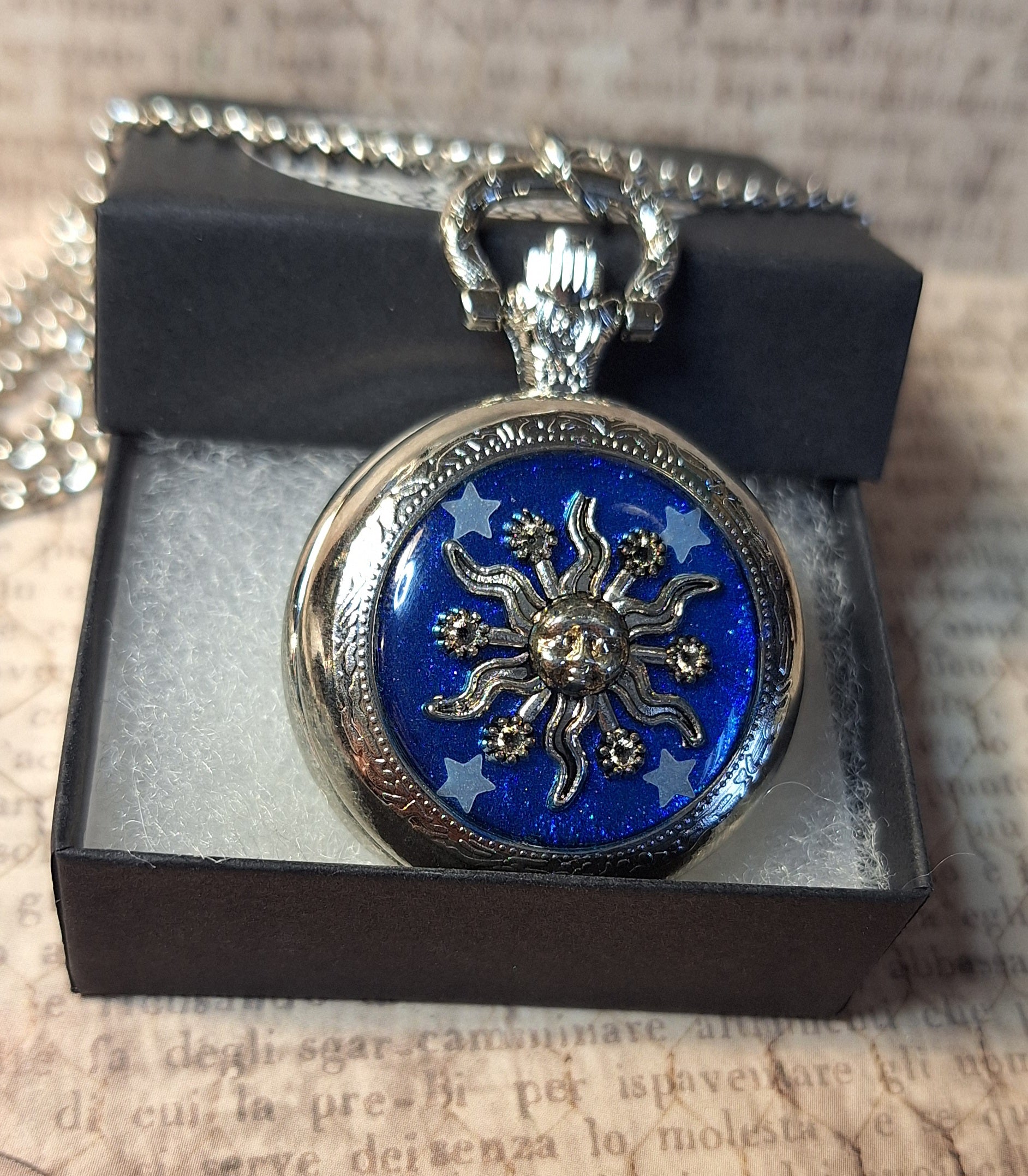 This handmade silver functional pocket watch features an antique silver sun with glow-in-the-dark stars over a glittery blue background. Clock pendant measures approximately 2" long