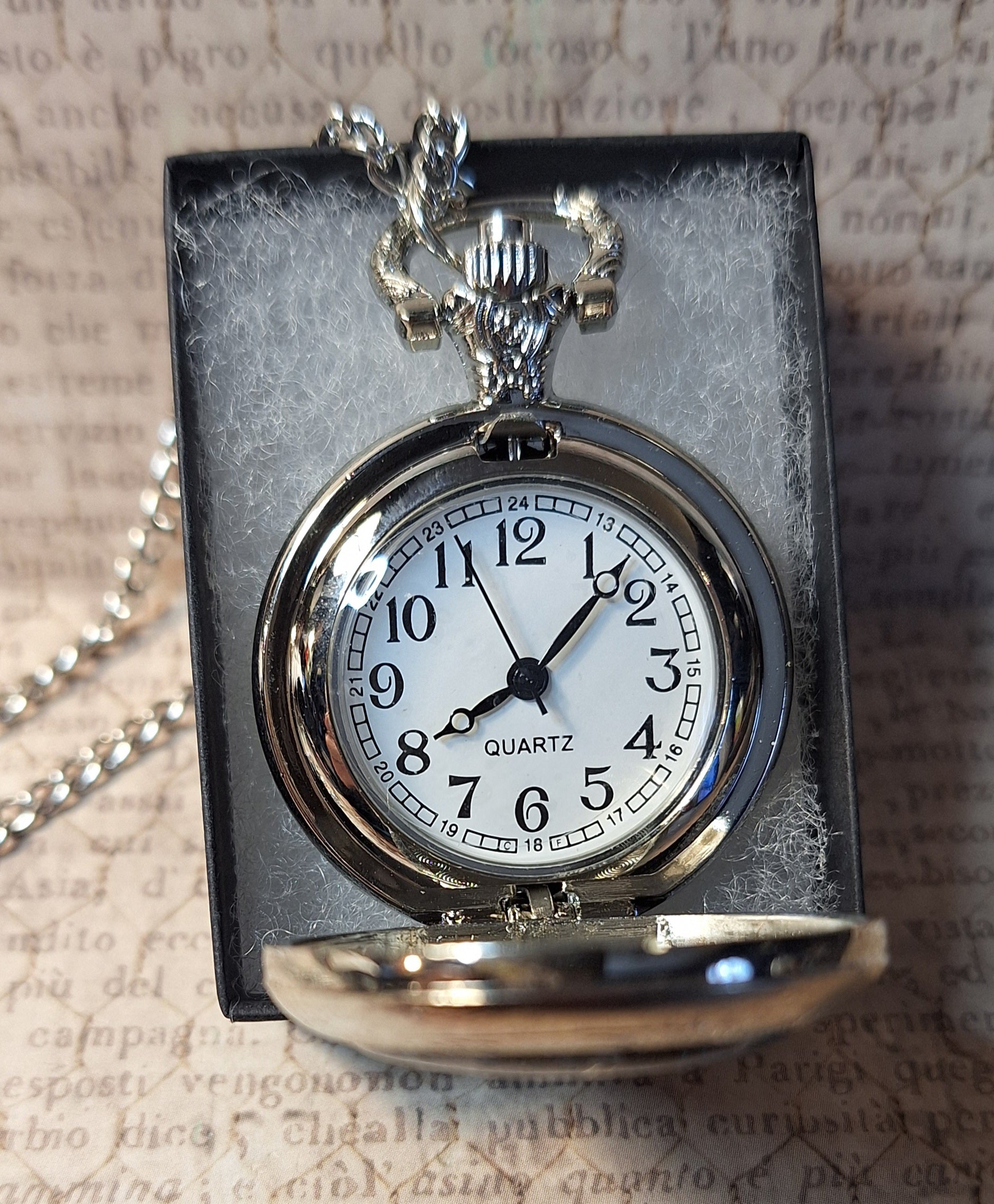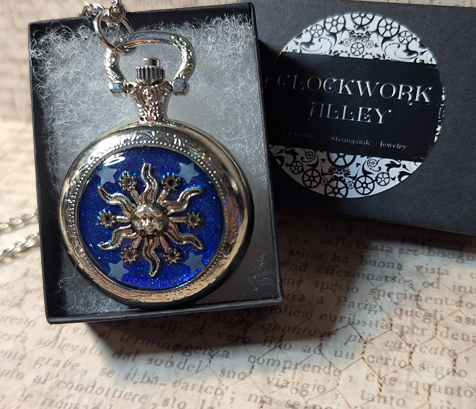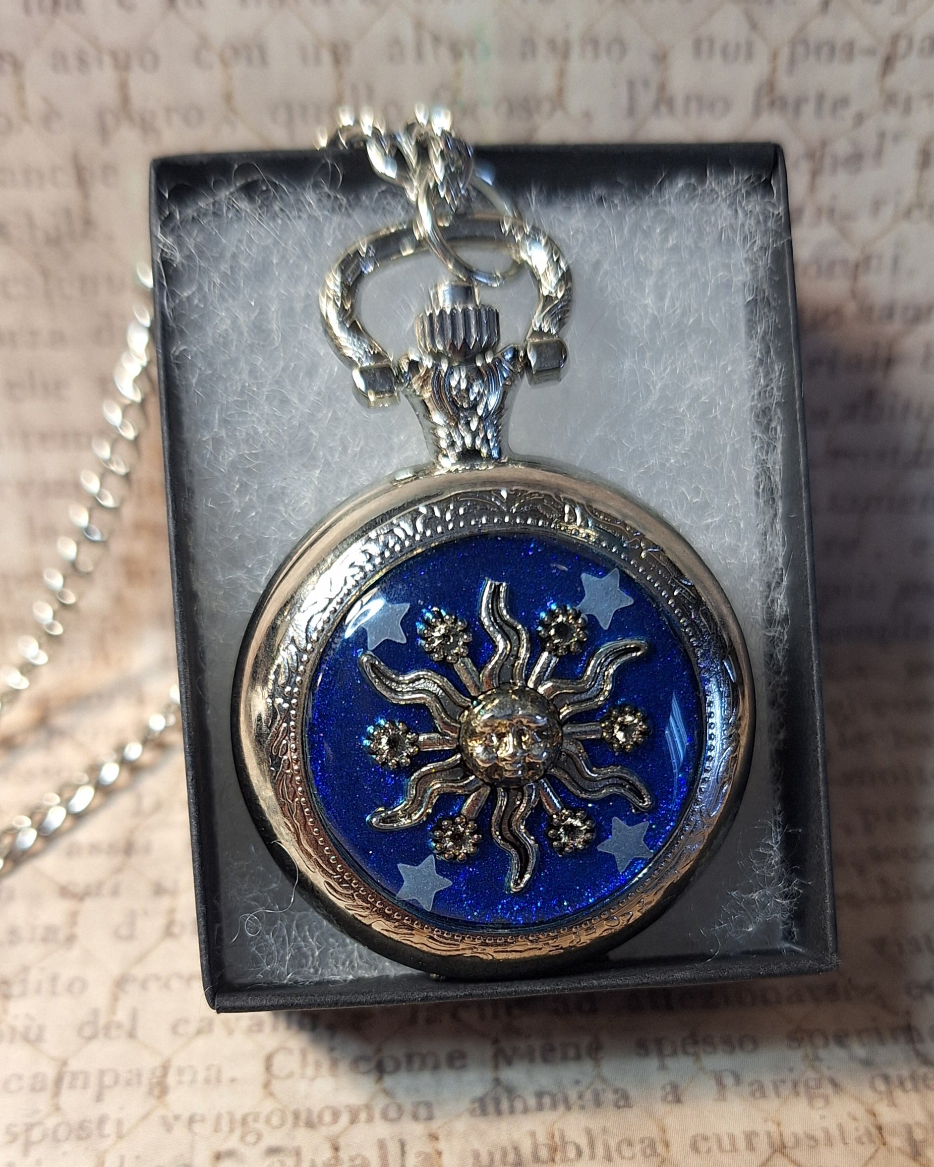 This handmade silver functional pocket watch features an antique silver sun with glow-in-the-dark stars over a glittery blue background. Clock pendant measures approximately 2" long