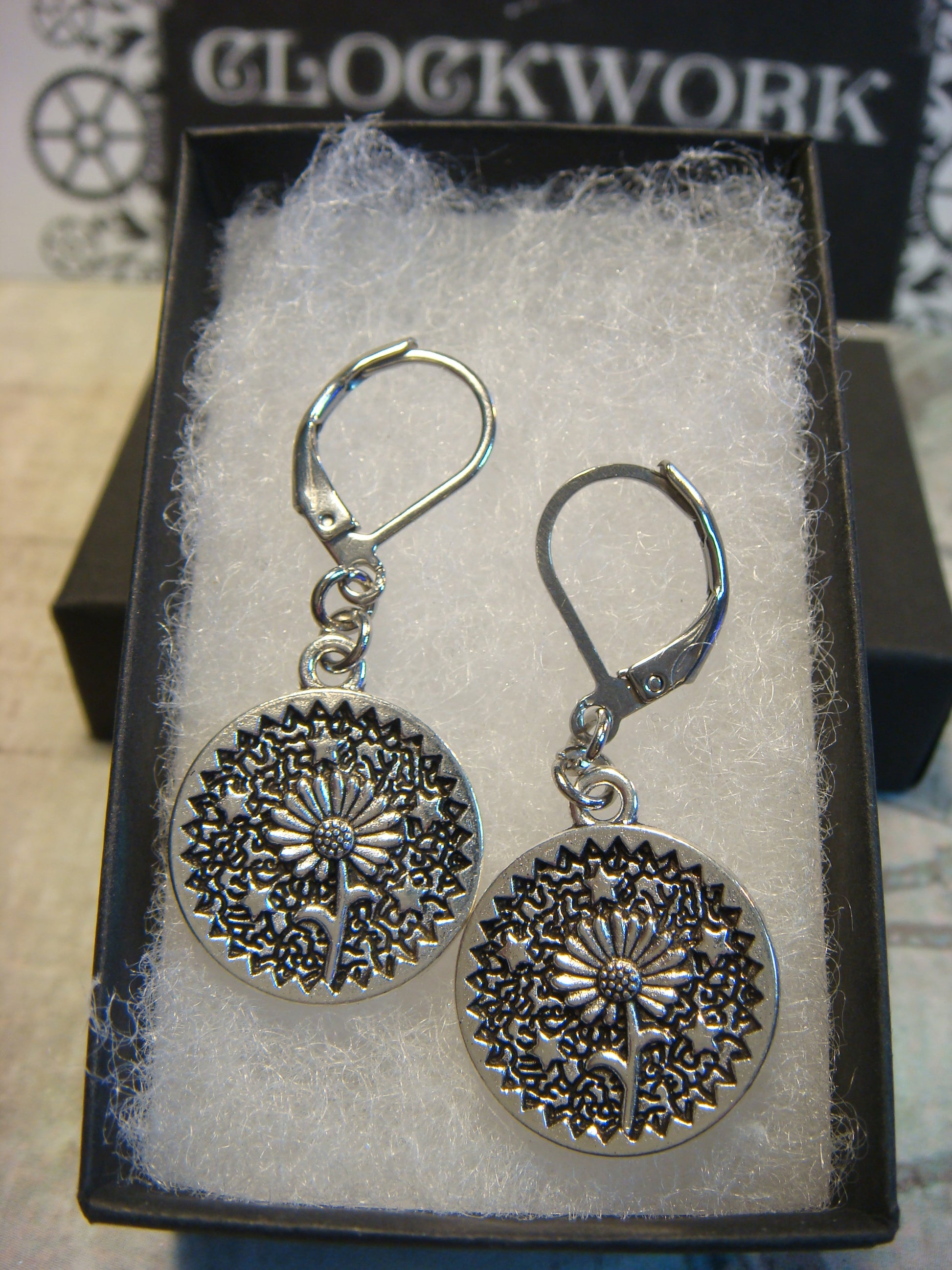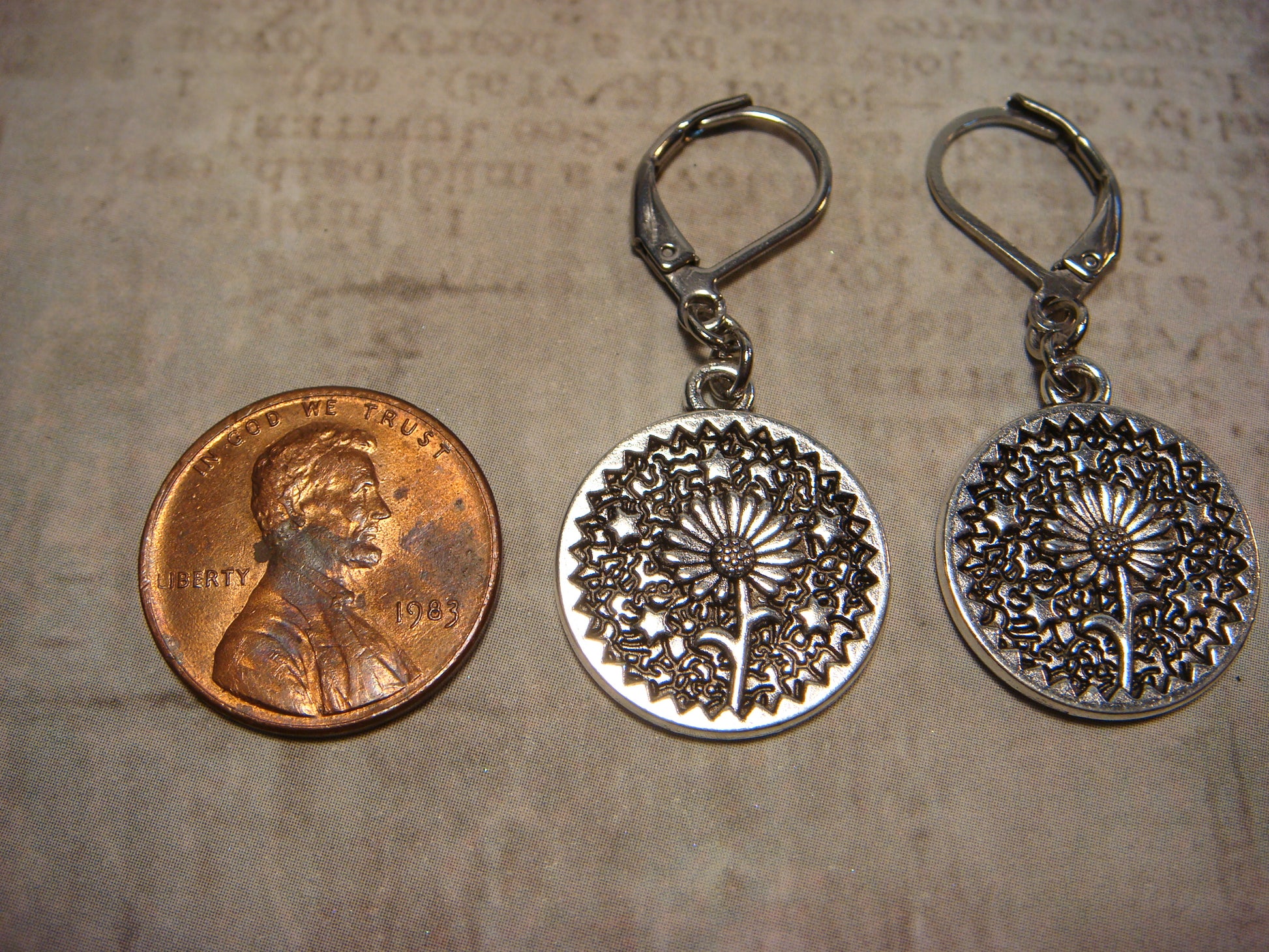 These earrings are made with round, antique silver sunflower and stars charms hanging on stainless steel lever back earrings.