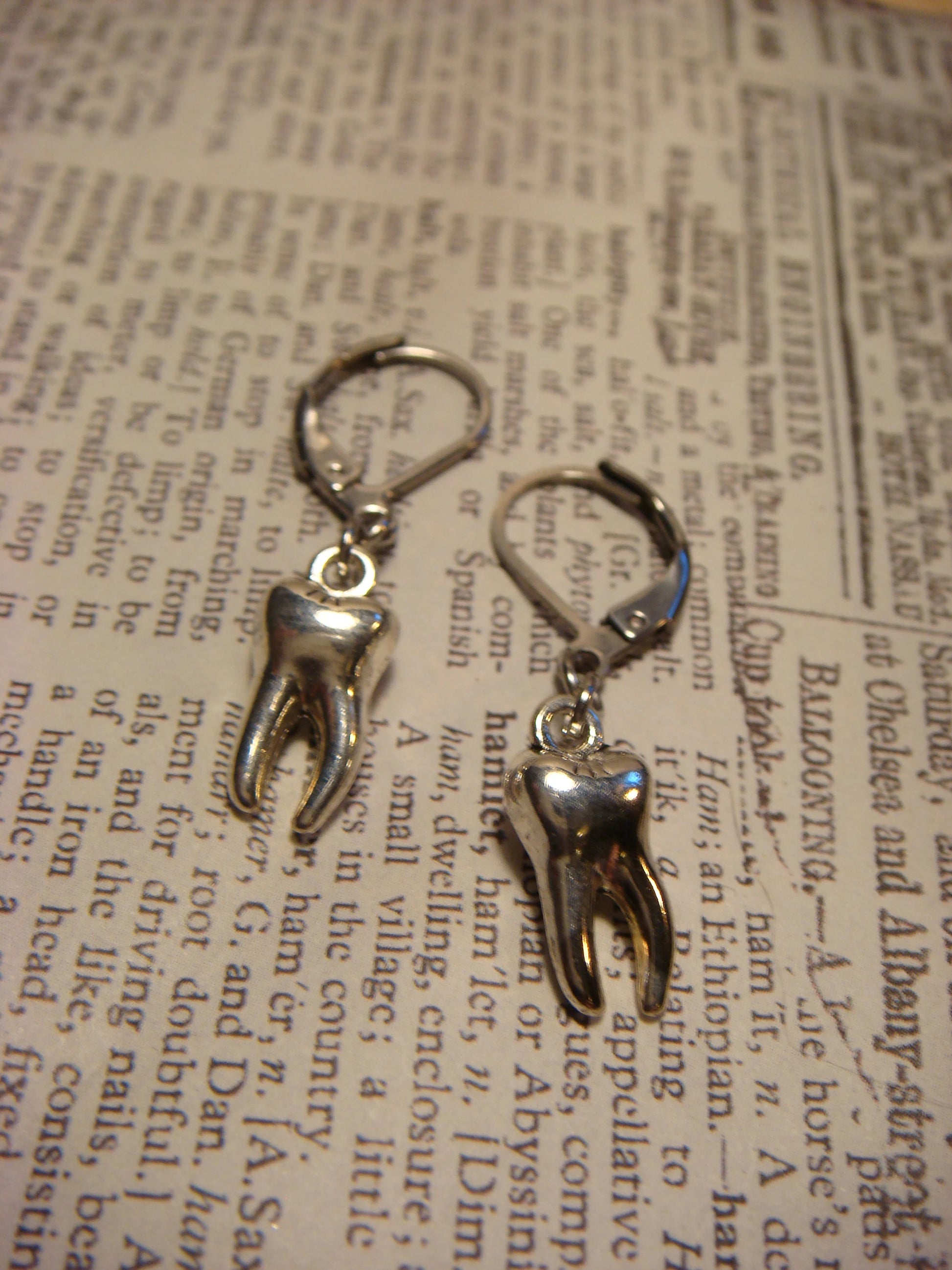 These earrings are made with antique silver tooth charms hanging on stainless steel lever back earrings.