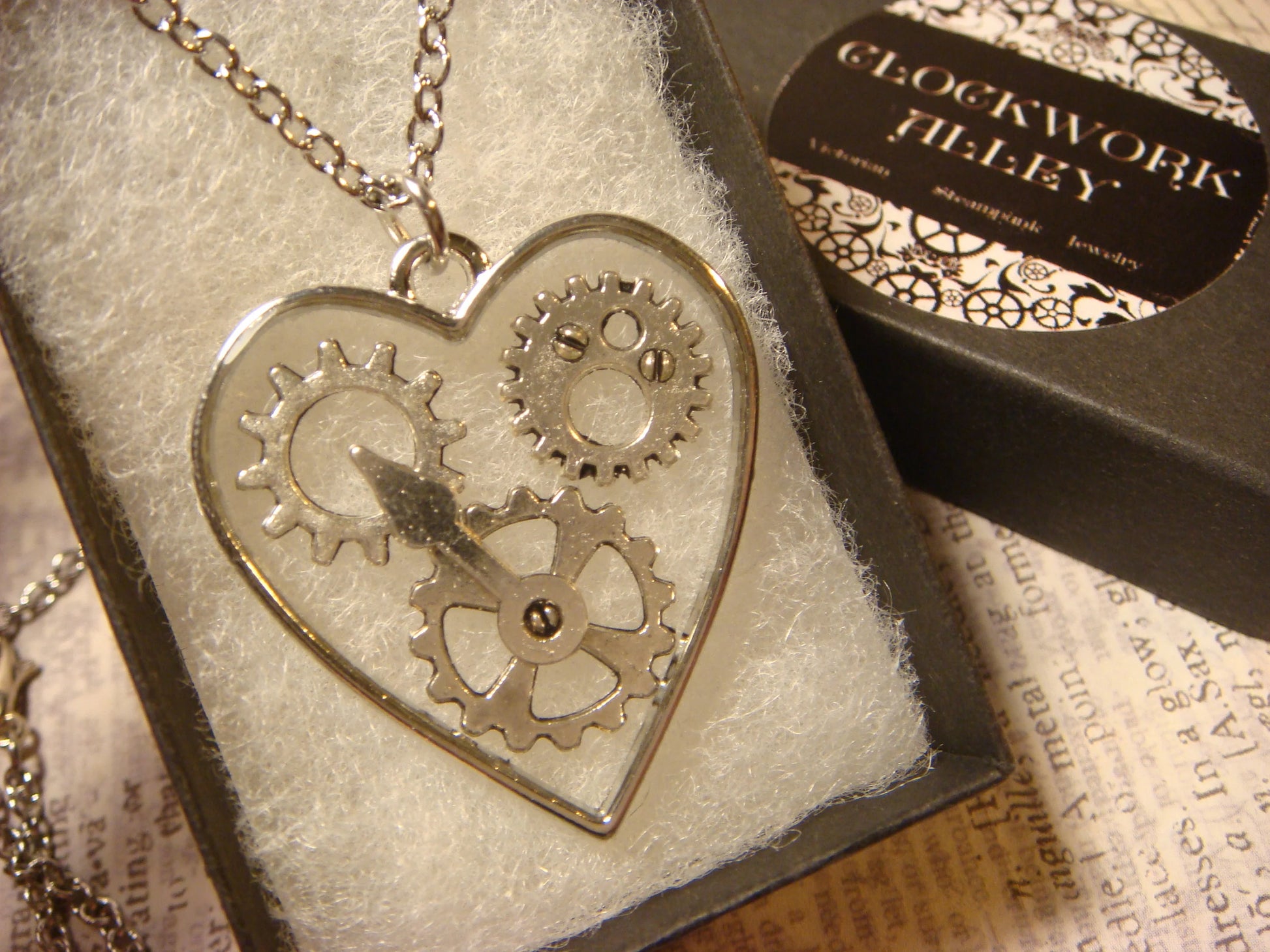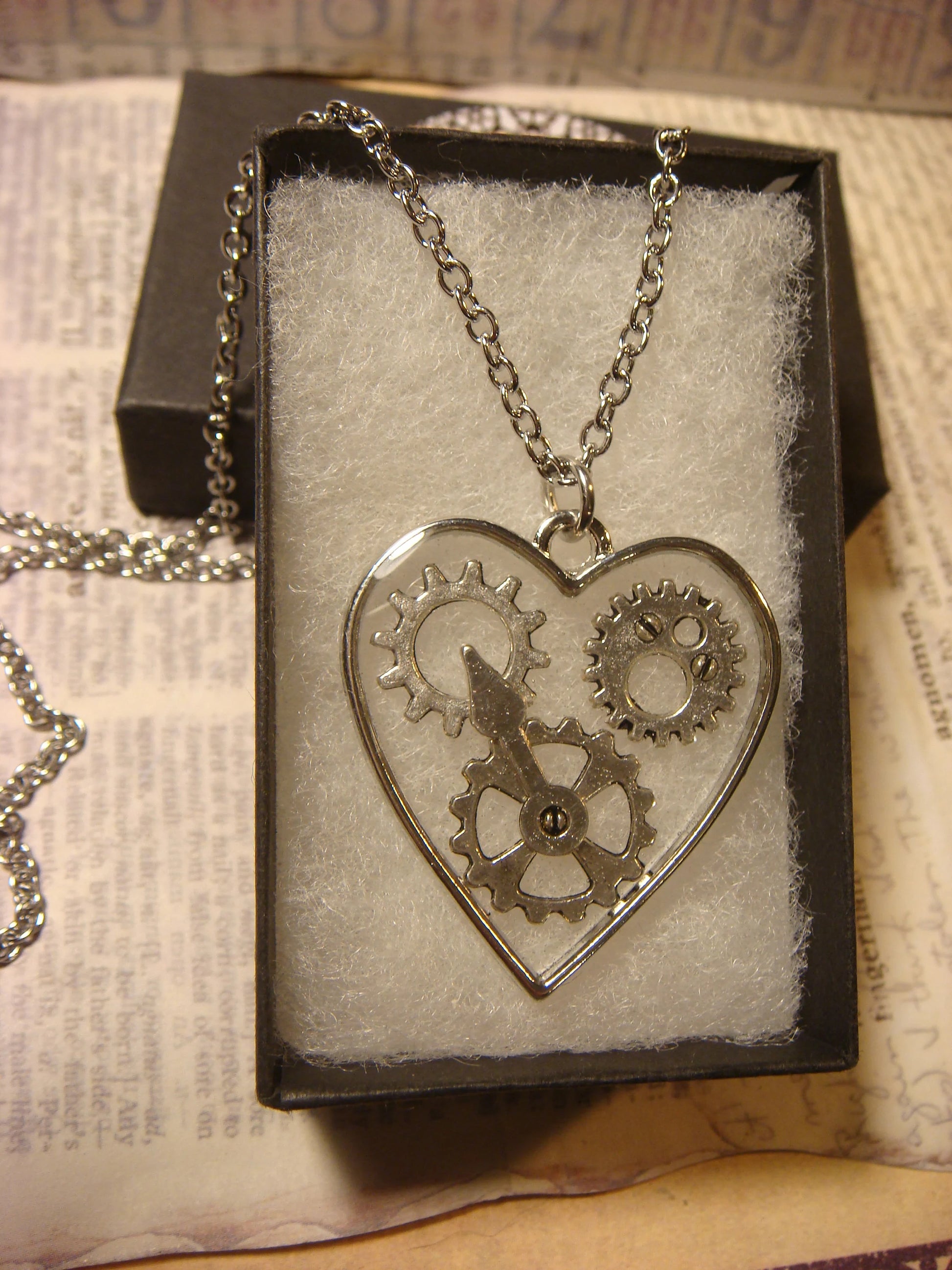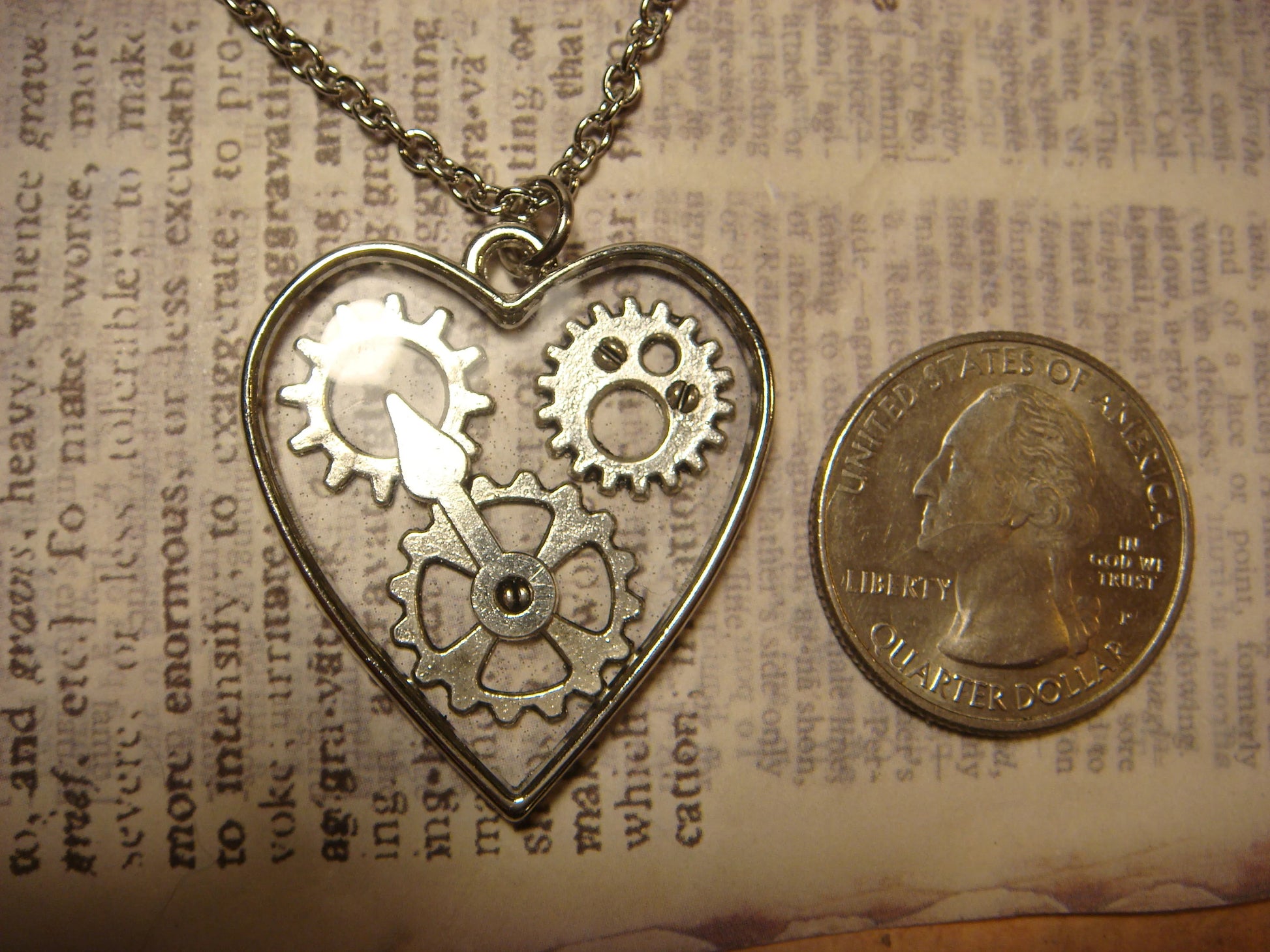 This steampunk necklace features antique silver craft gears set in resin in a see-through, antique silver heart pendant.