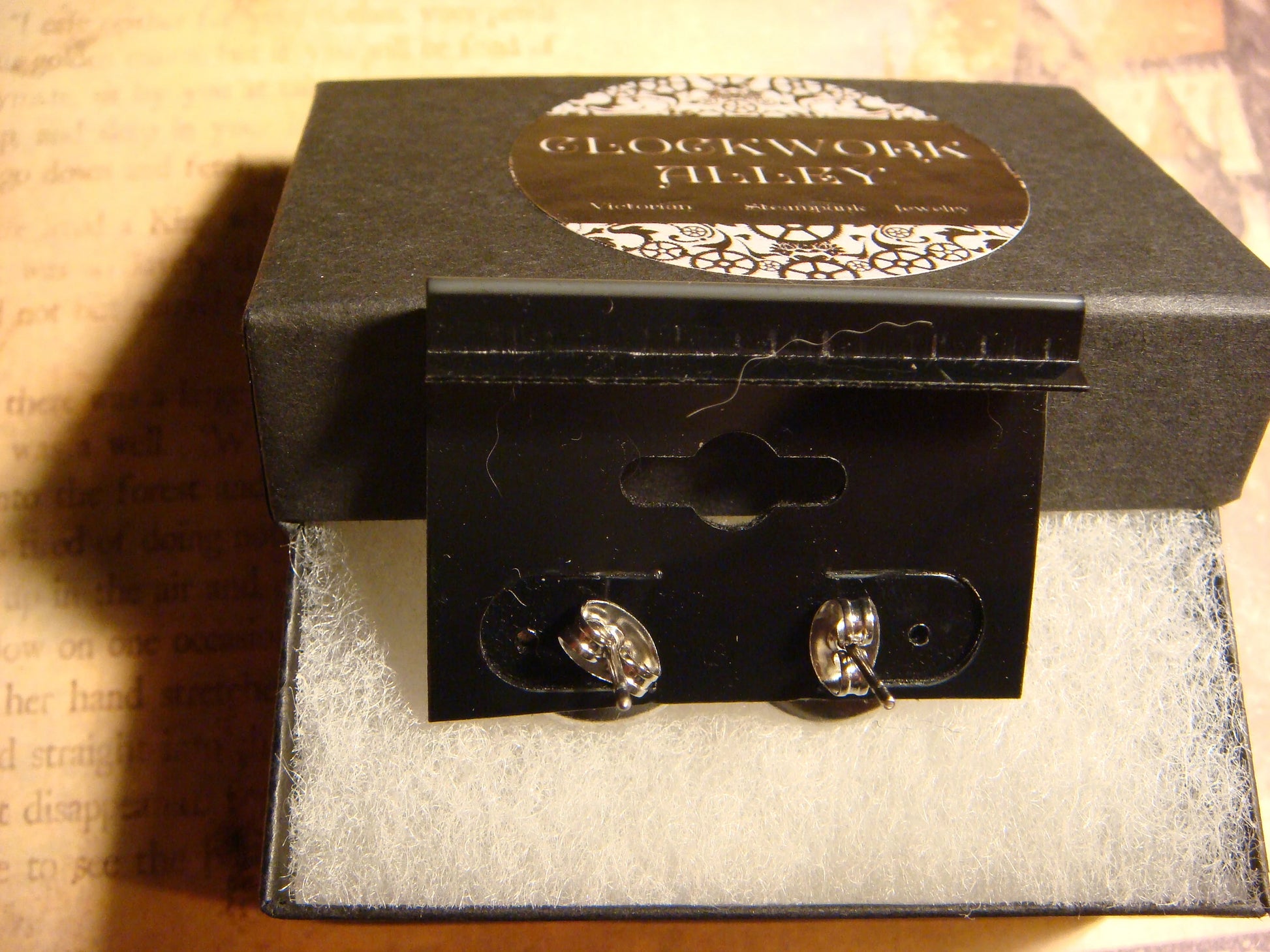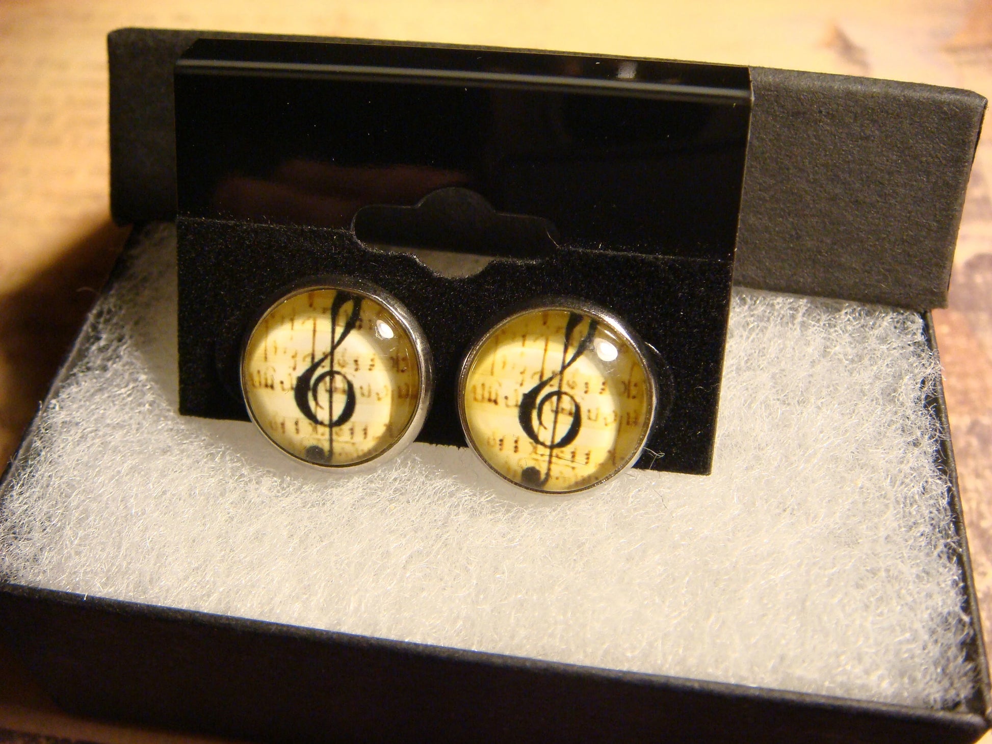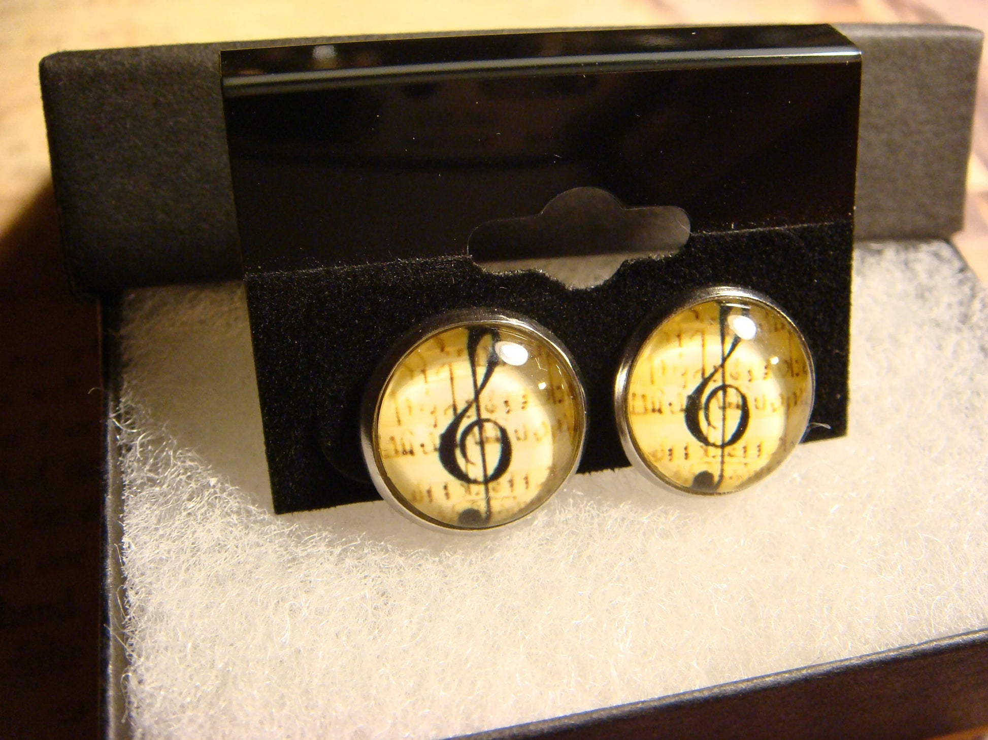 These earrings feature treble clef image cabochons set in stainless steel earring studs.