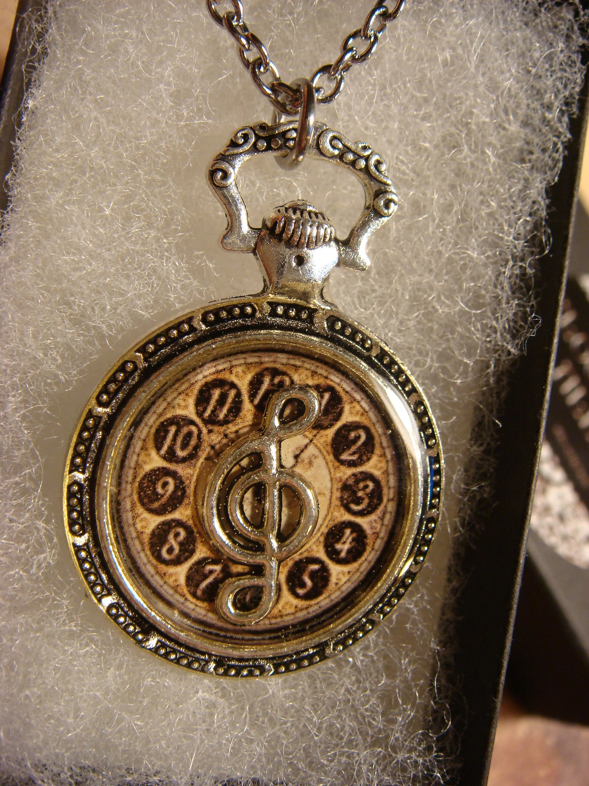 This beautiful necklace features an antique silver treble clef over the image of a vintage clock and encased with jewelers grade resin in a small antique silver pocket watch setting.