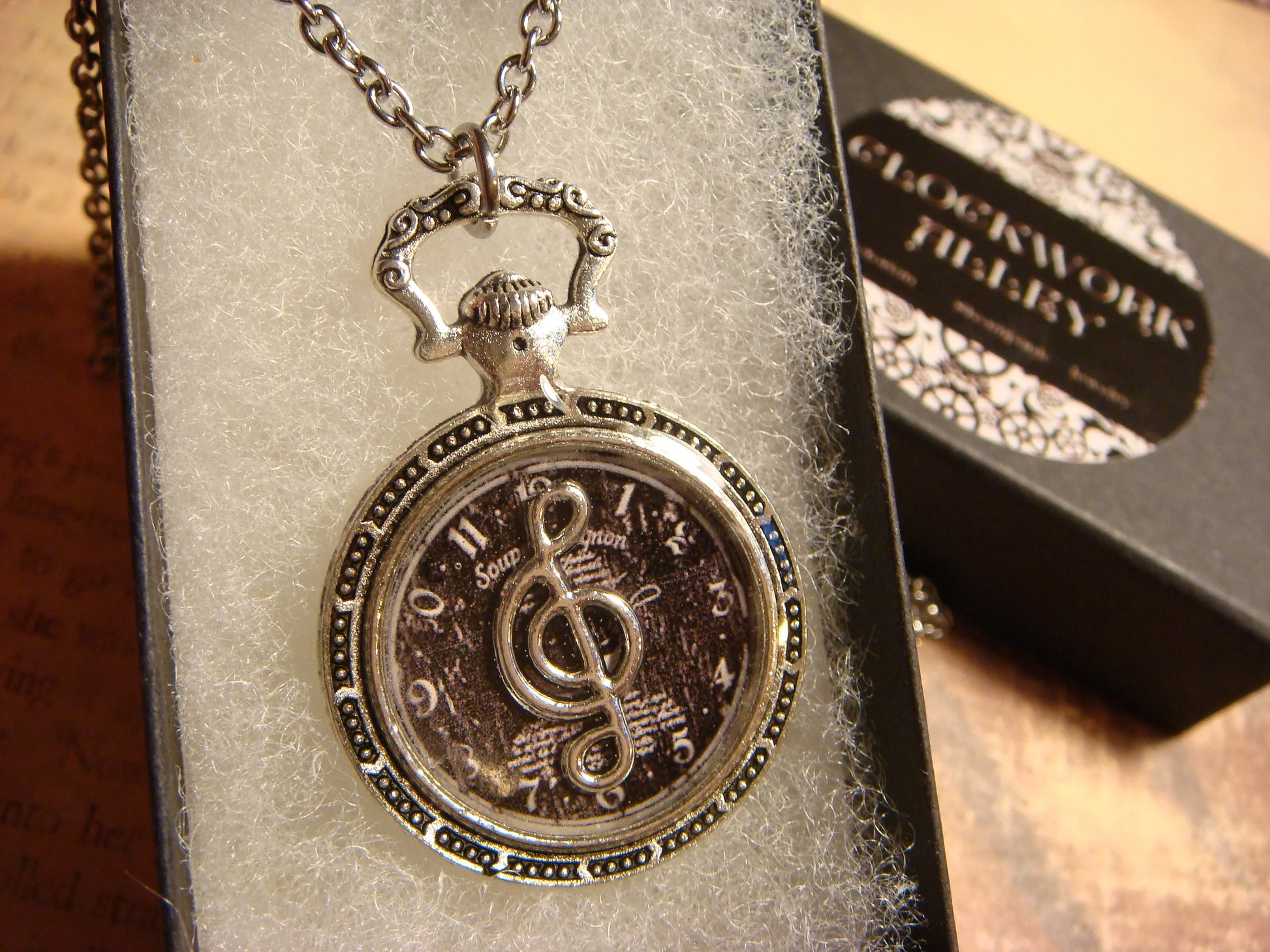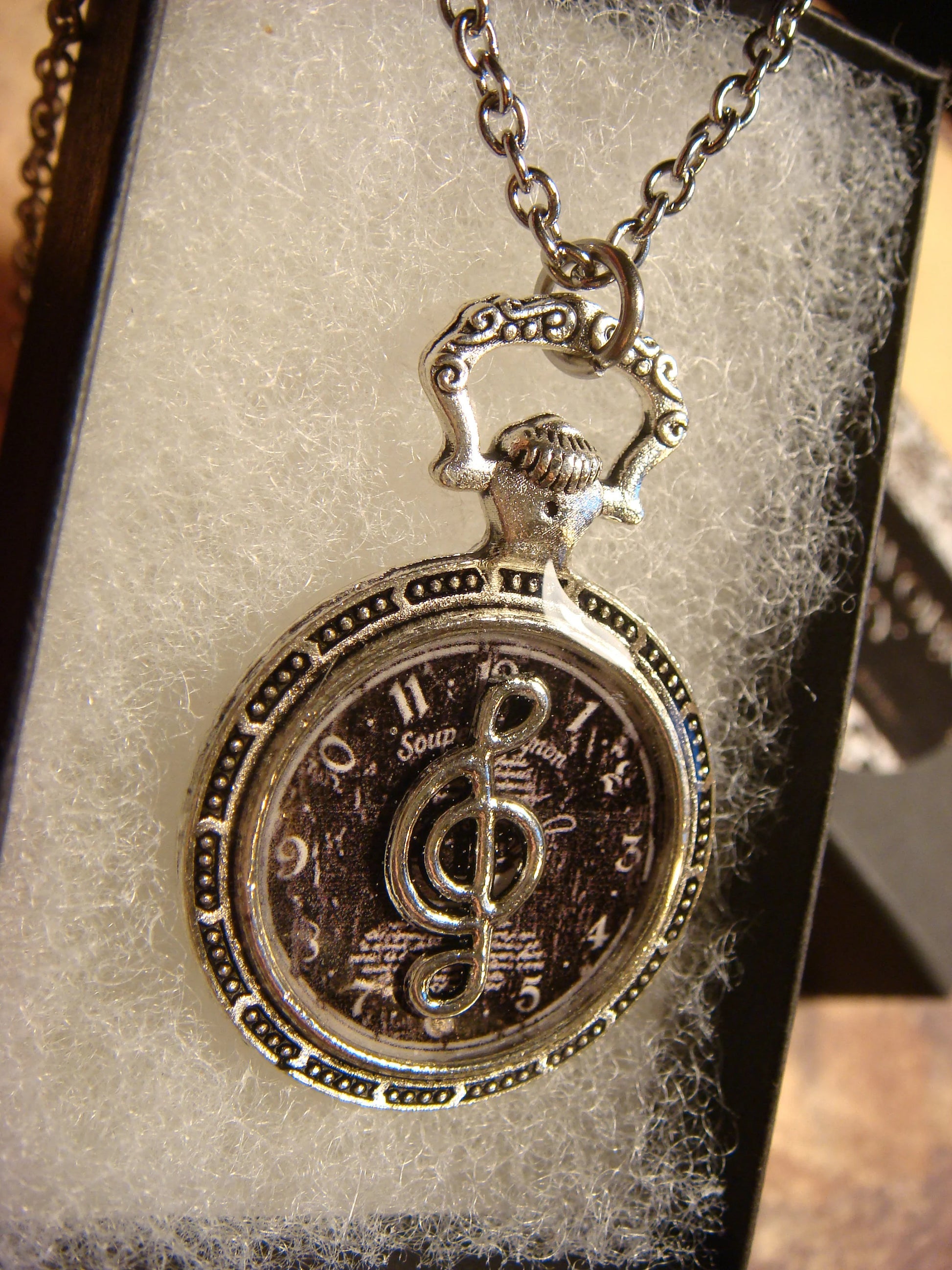 This beautiful necklace features an antique silver treble clef over the image of a vintage clock and encased with jewelers grade resin in a small antique silver pocket watch setting.
