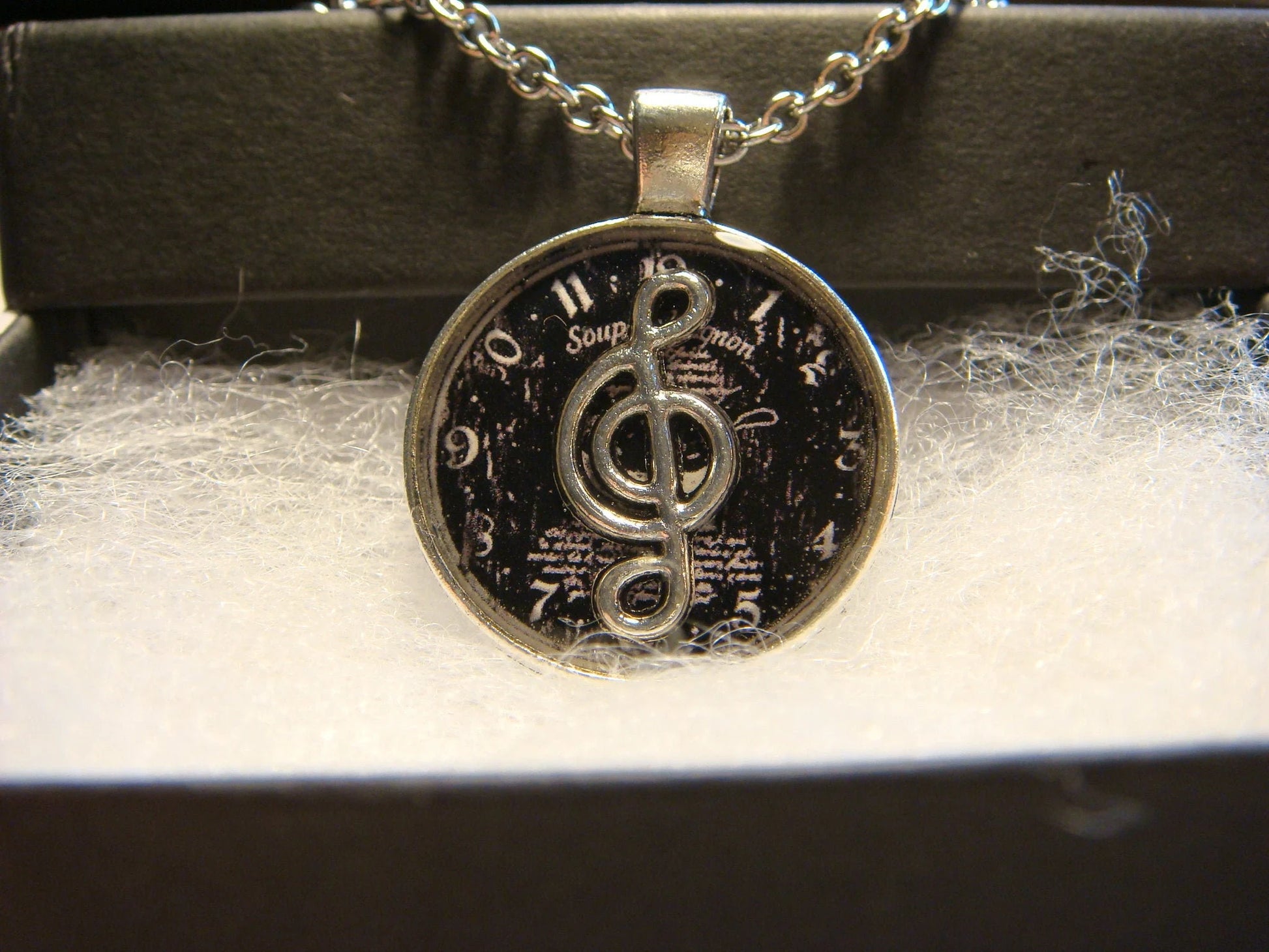 This beautiful necklace features an antique silver treble clef over a vintage clock image then encased in jewelers grade resin in a small antique silver setting.