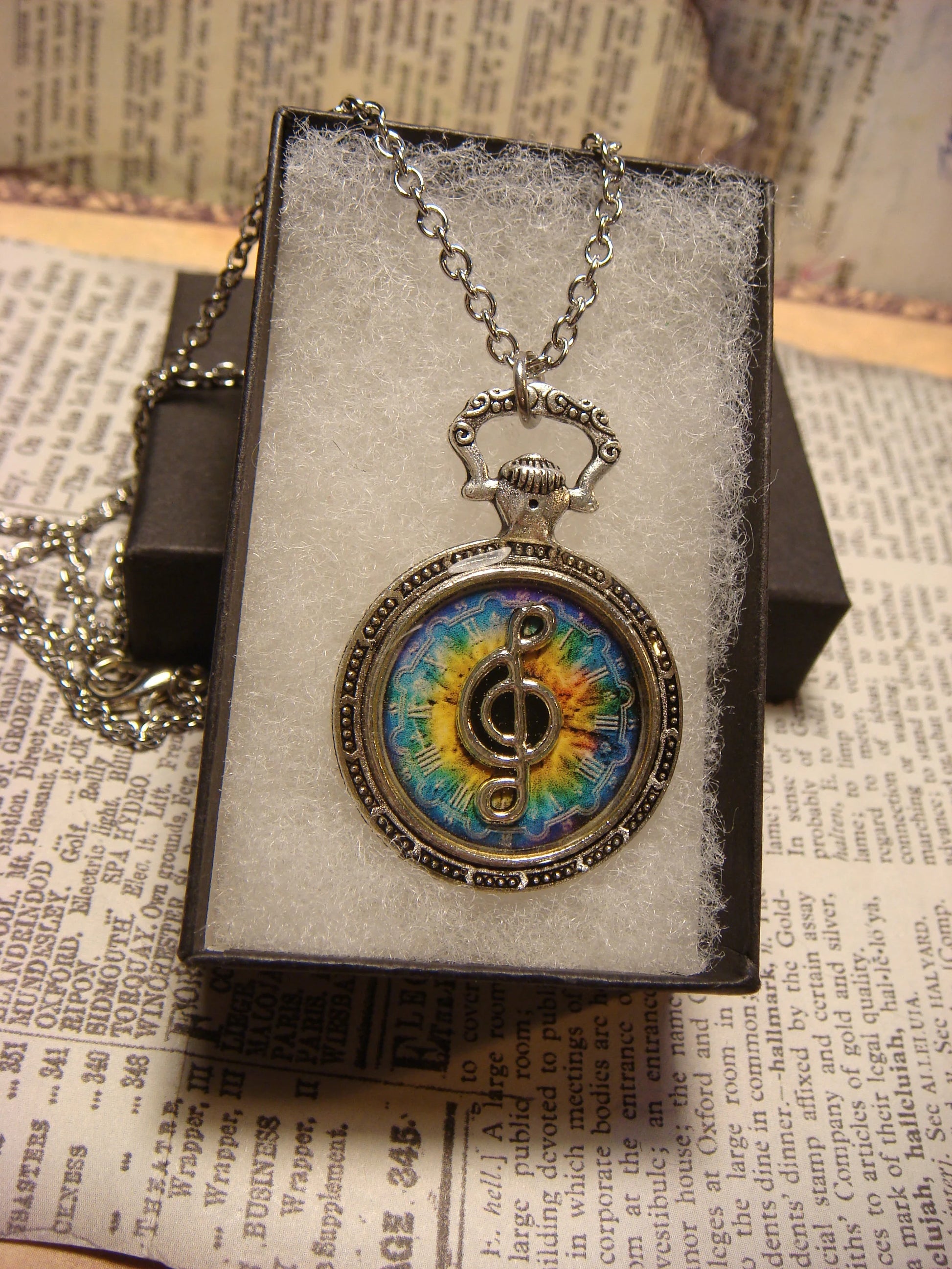 This beautiful necklace features an antique silver treble clef over the image of a colorful clock and encased with jewelers grade resin in a small antique silver pocket watch setting.