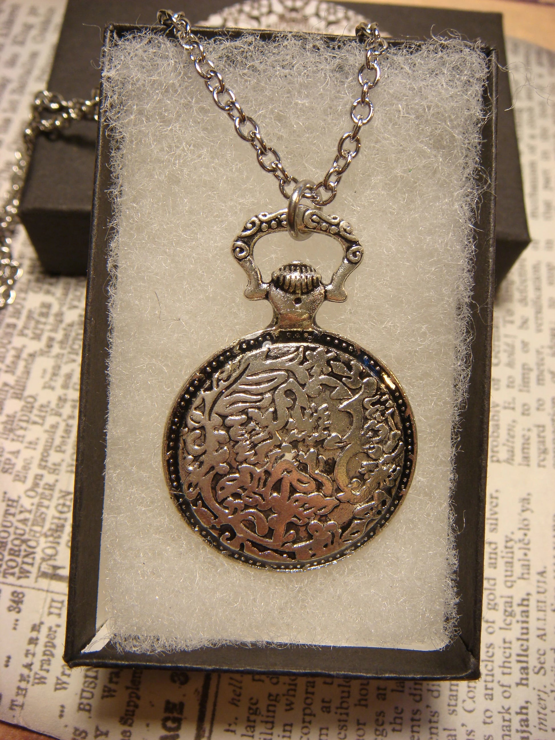 This beautiful necklace features an antique silver treble clef over the image of a vintage compass rose and encased with jewelers grade resin in a small antique silver pocket watch setting.