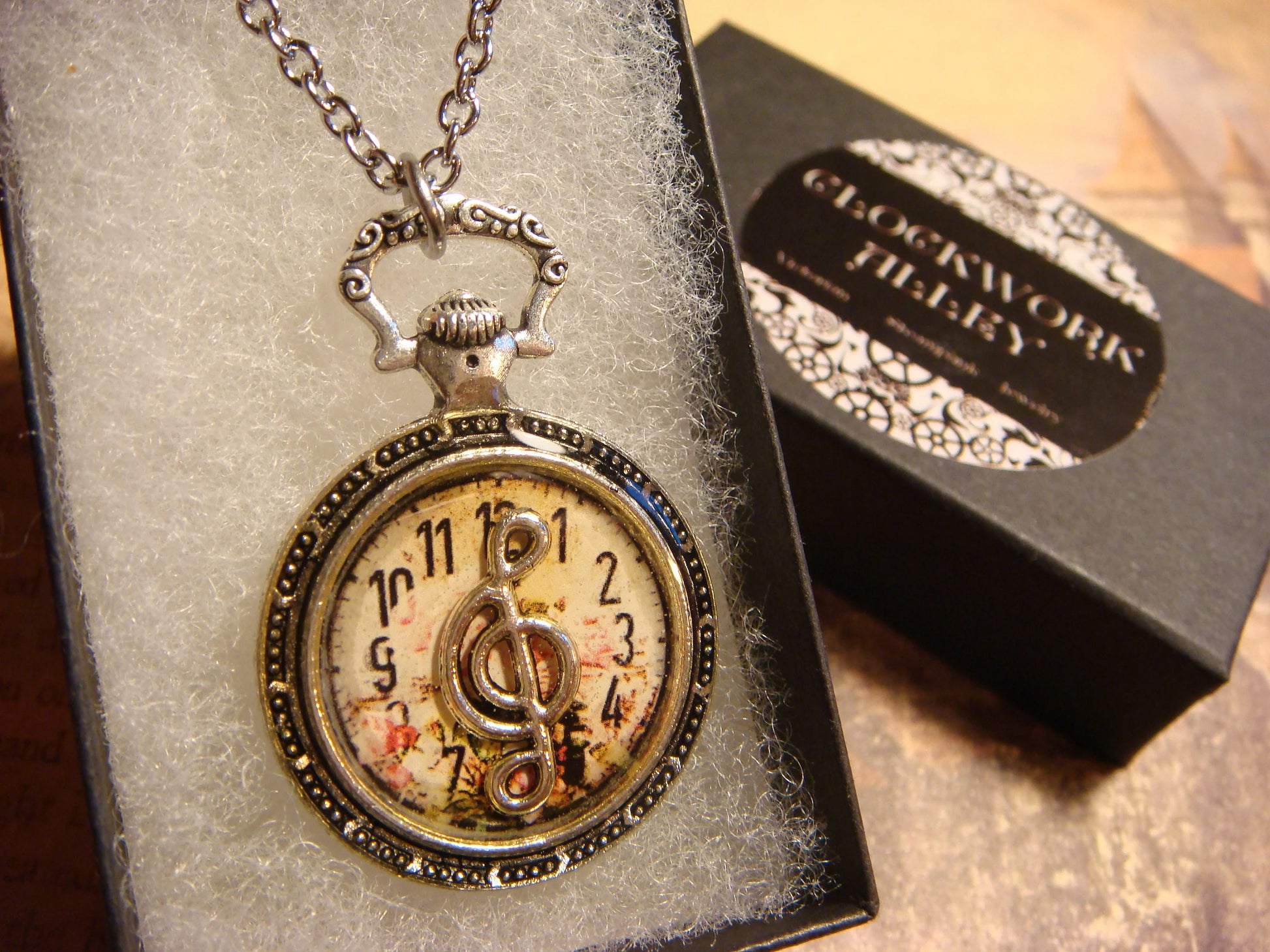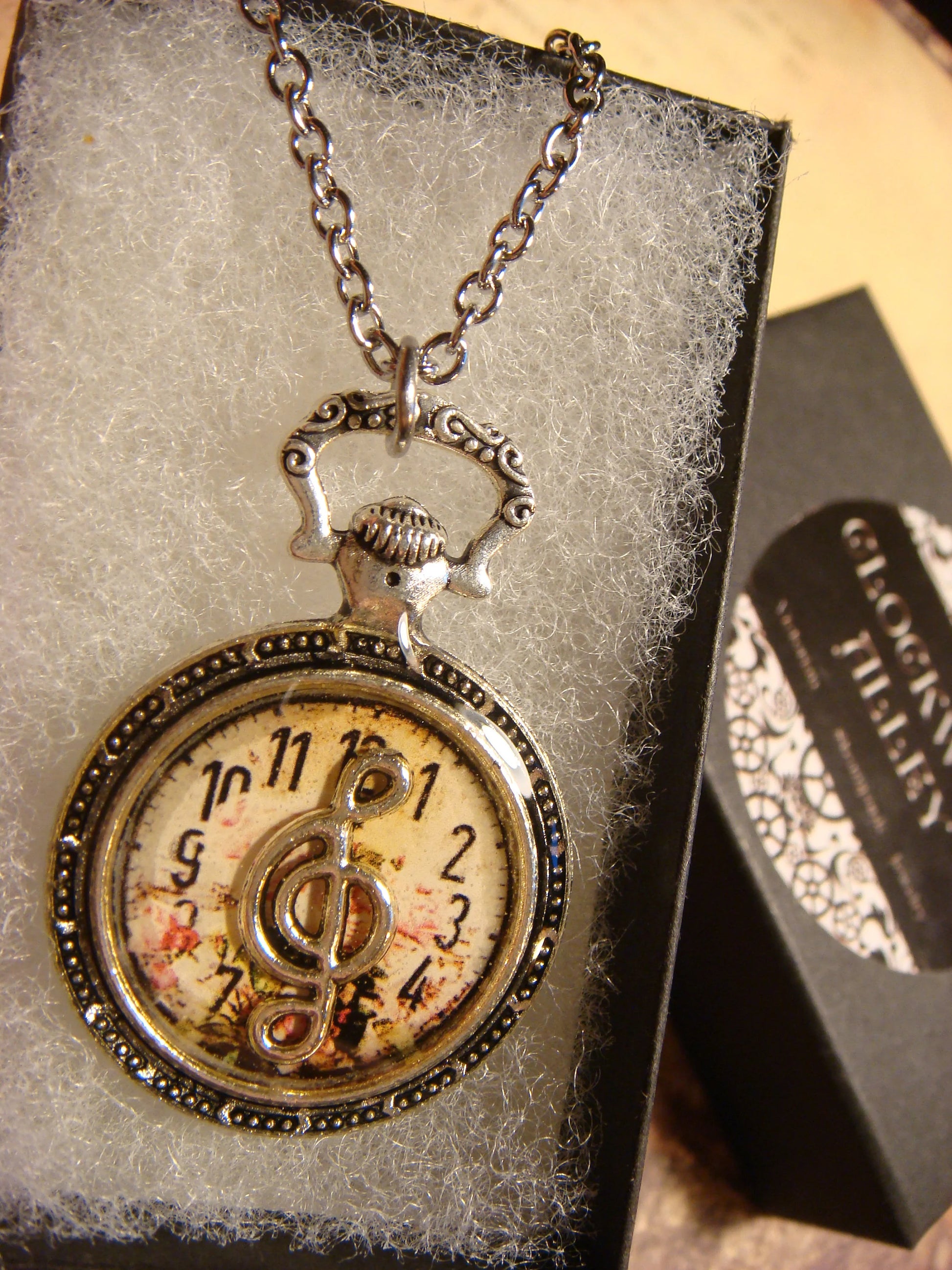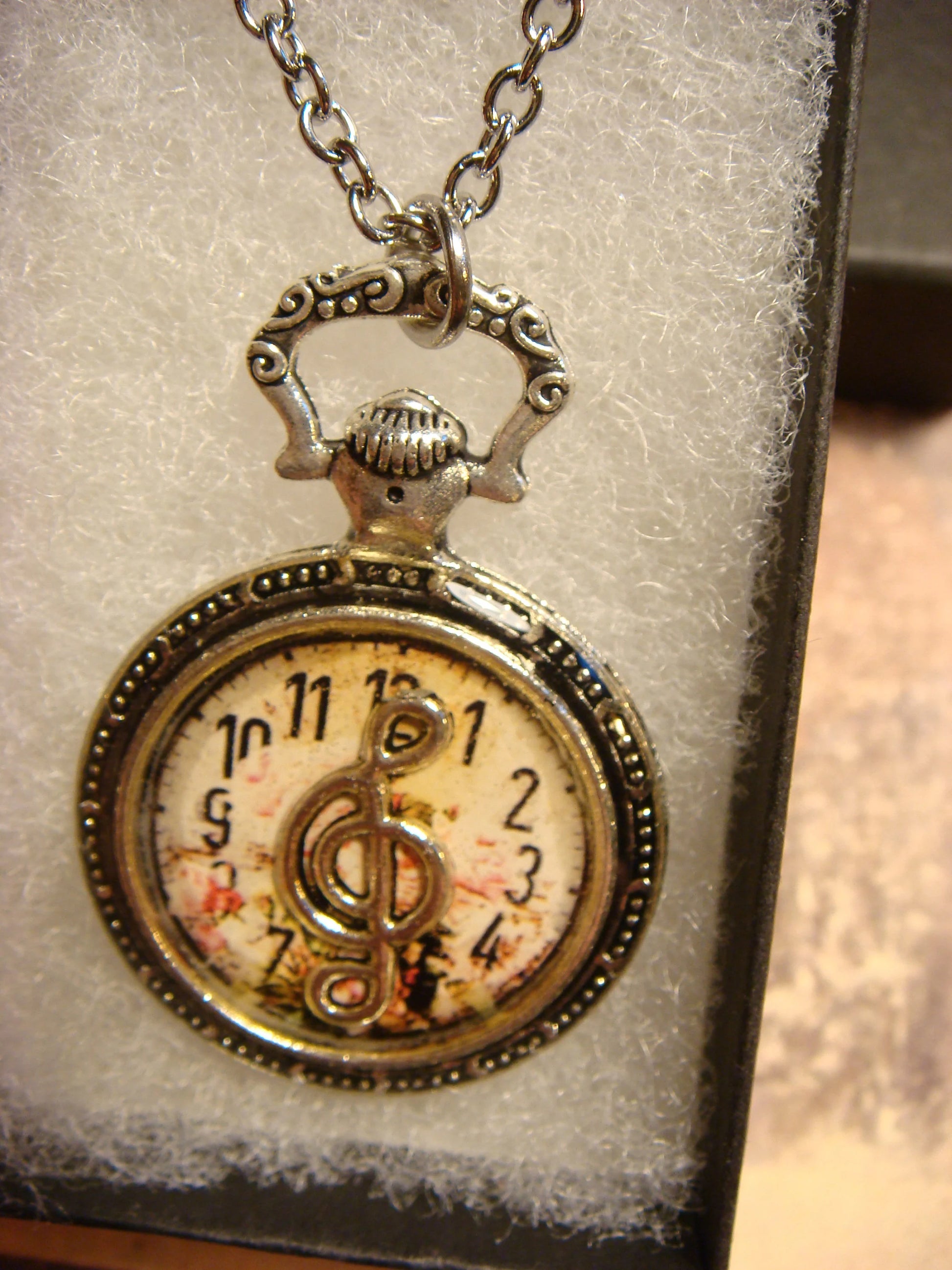 This beautiful necklace features an antique silver treble clef over the image of a floral clock and encased with jewelers grade resin in a small antique silver pocket watch setting.