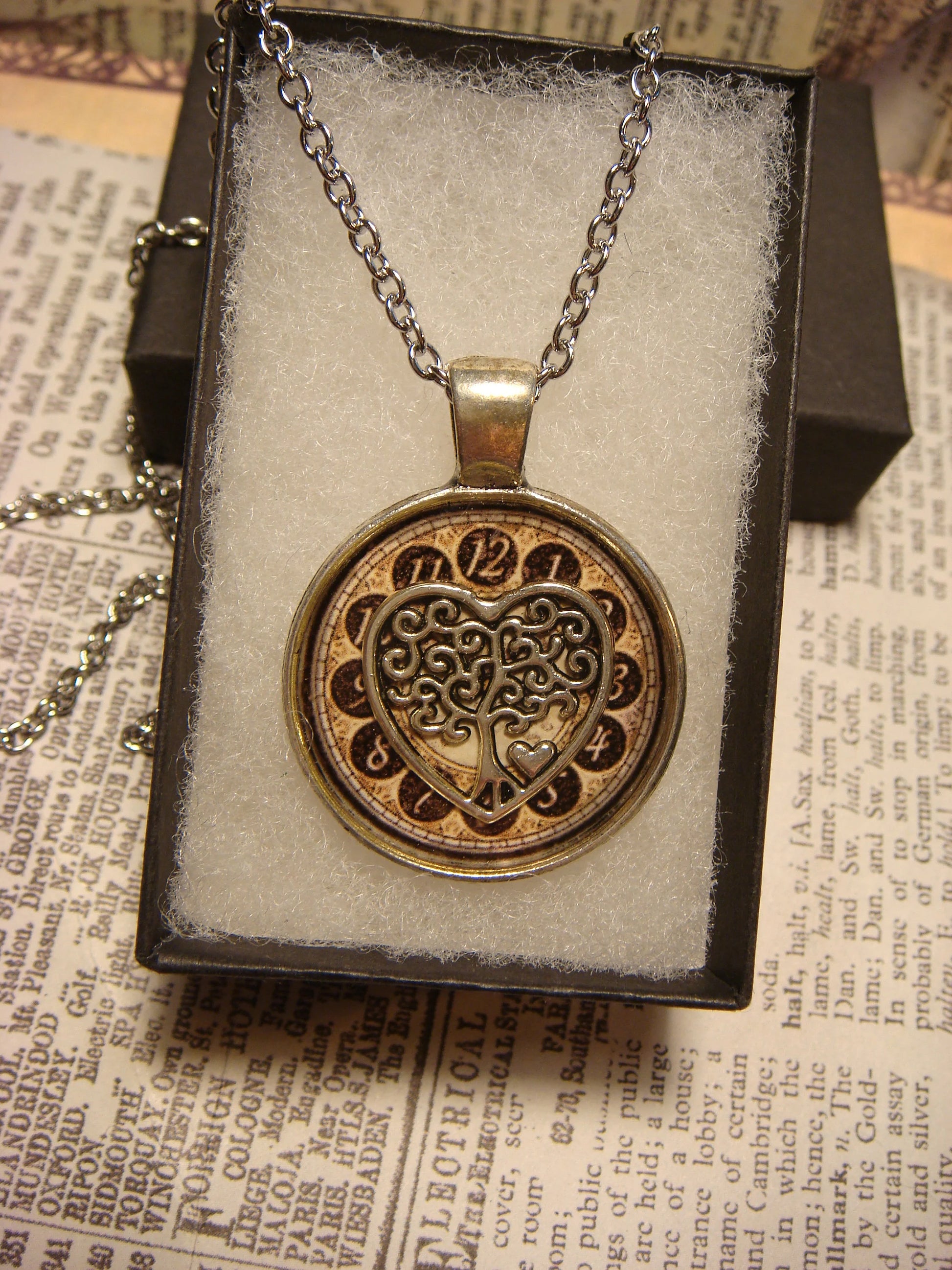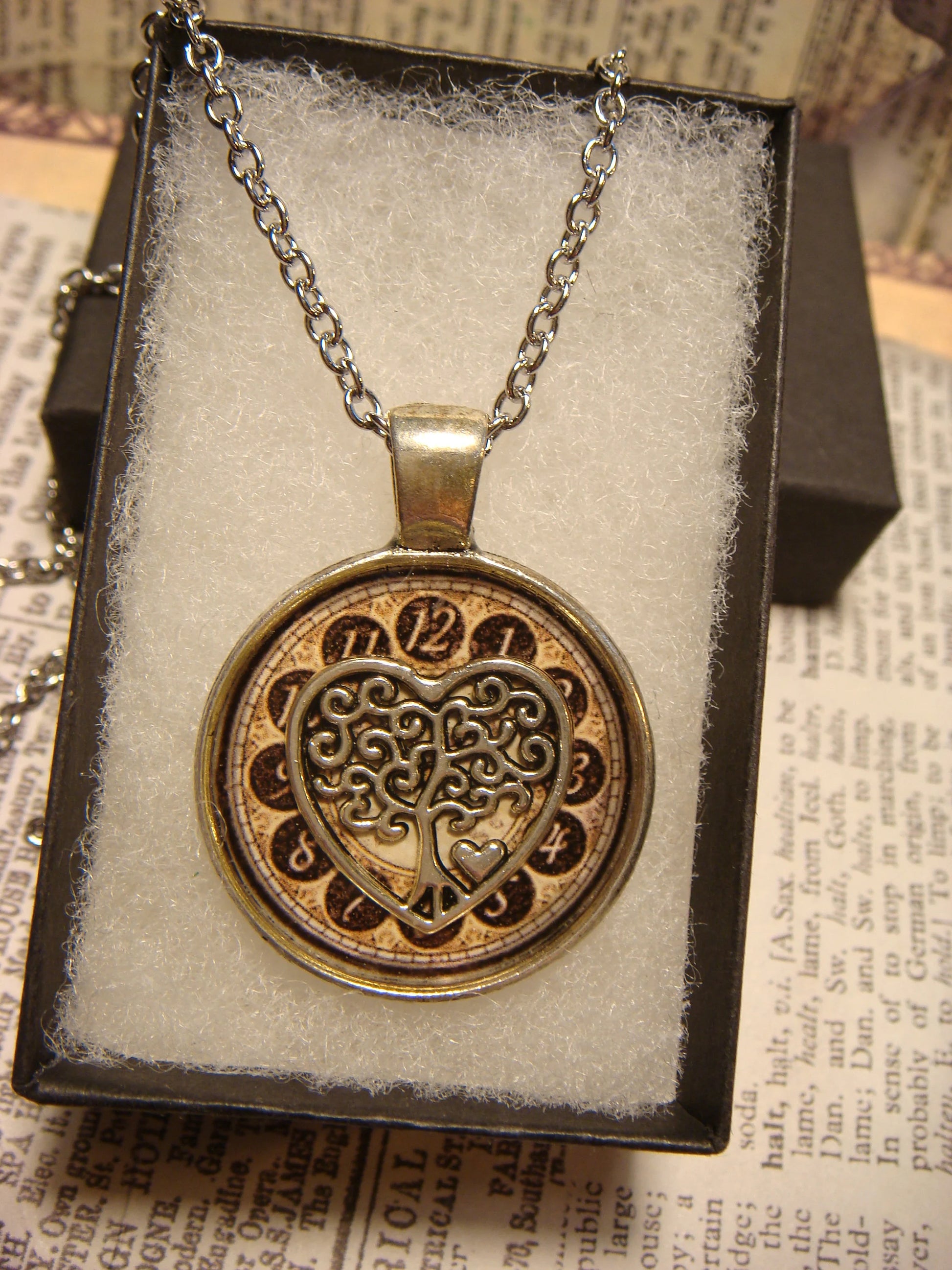 This beautiful necklace features an antique silver heart-shaped tree over a vintage clock image then encased in jewelers grade resin in an antique silver setting.