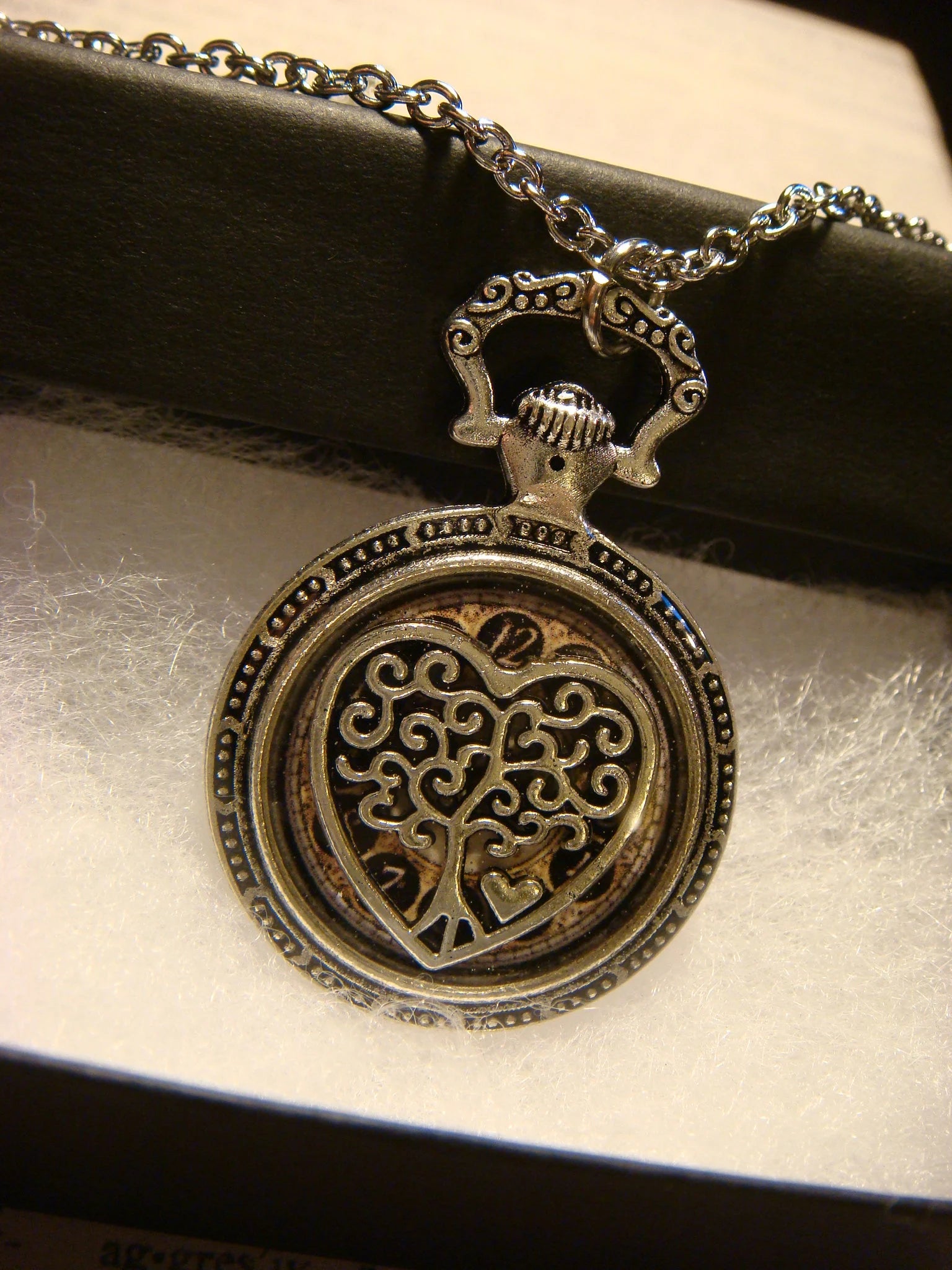 This beautiful necklace features an antique silver heart-shaped tree over the image of a clock and encased with jewelers grade resin in a small antique silver pocket watch setting.