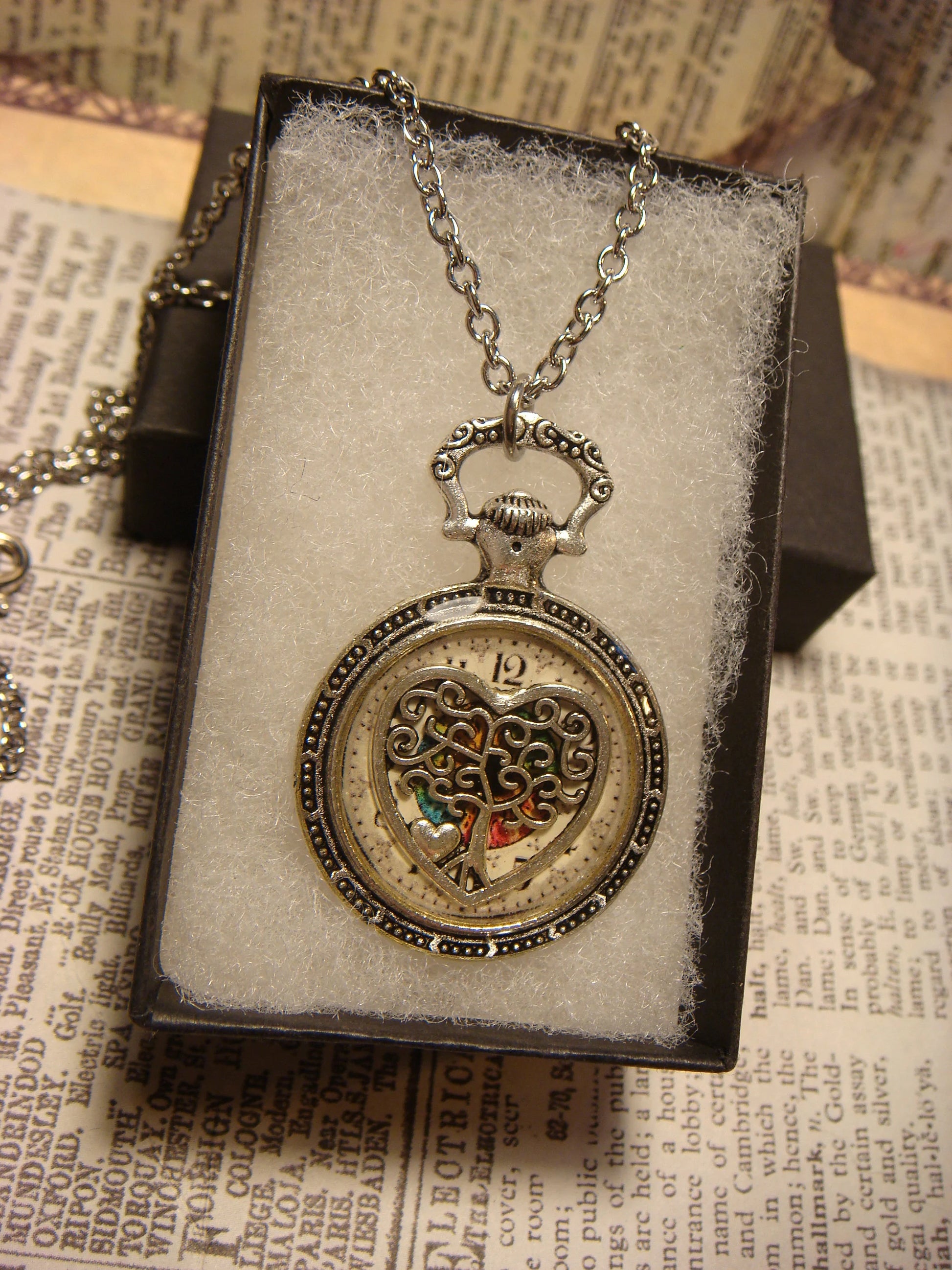 This necklace features an antique silver heart-shaped tree over the image of a clock and encased with jewelers grade resin in a small antique silver pocket watch setting.