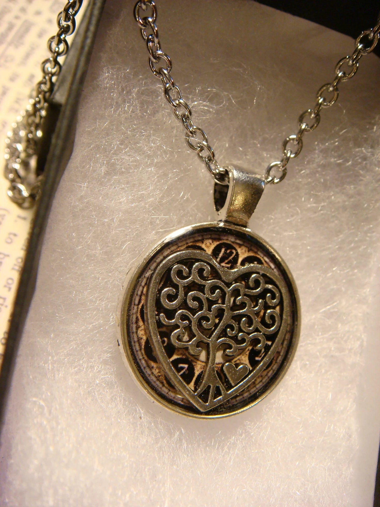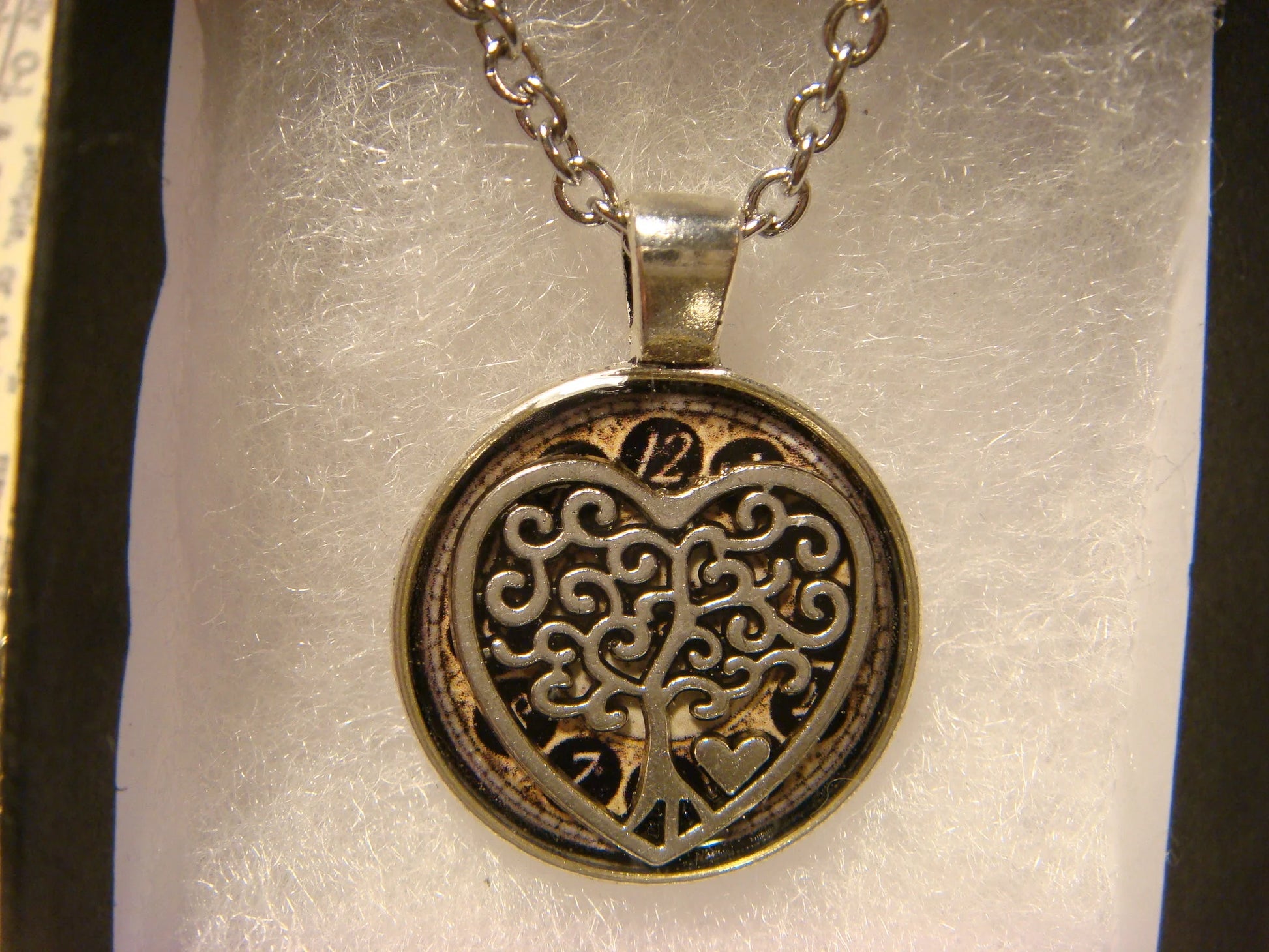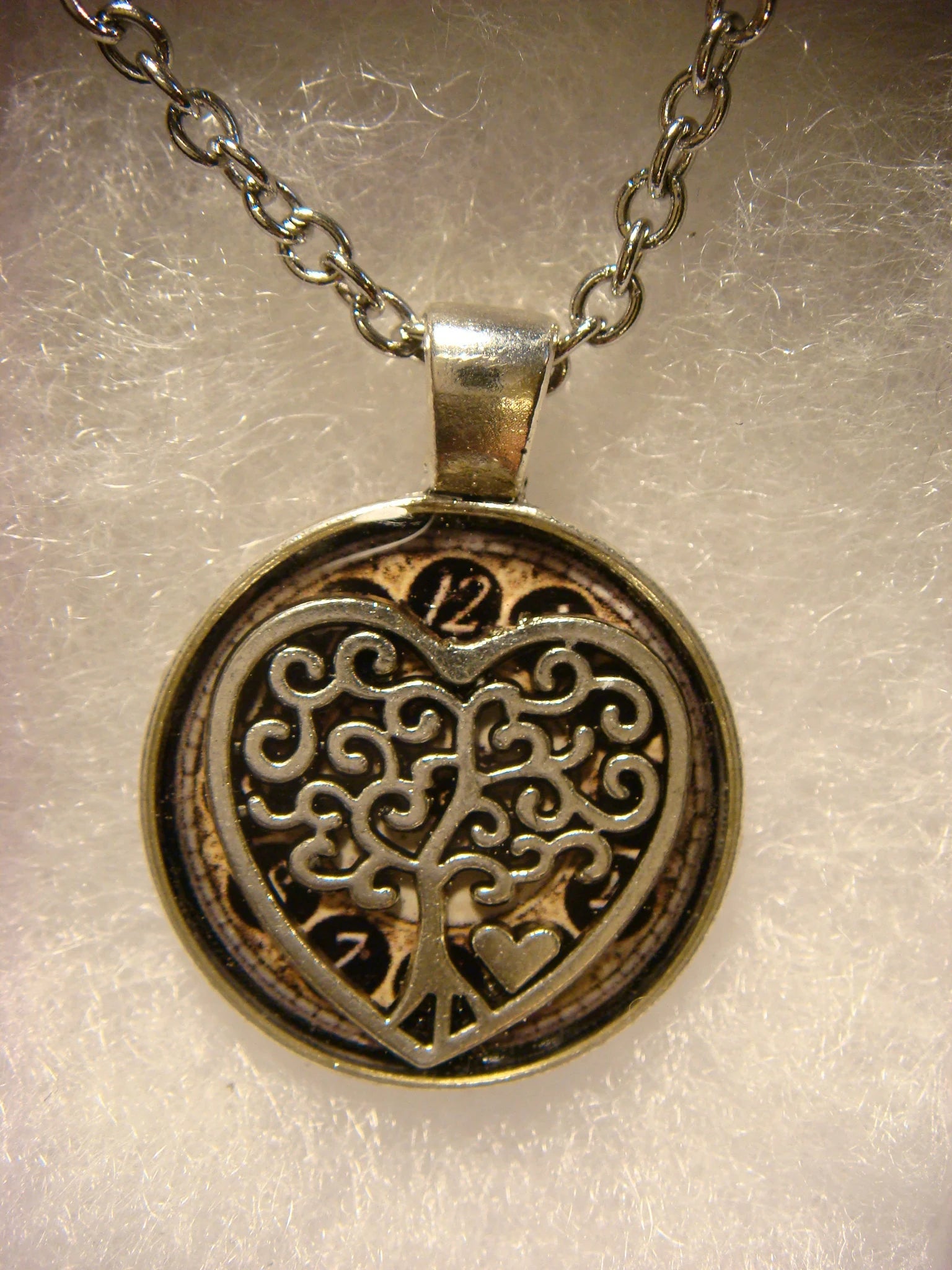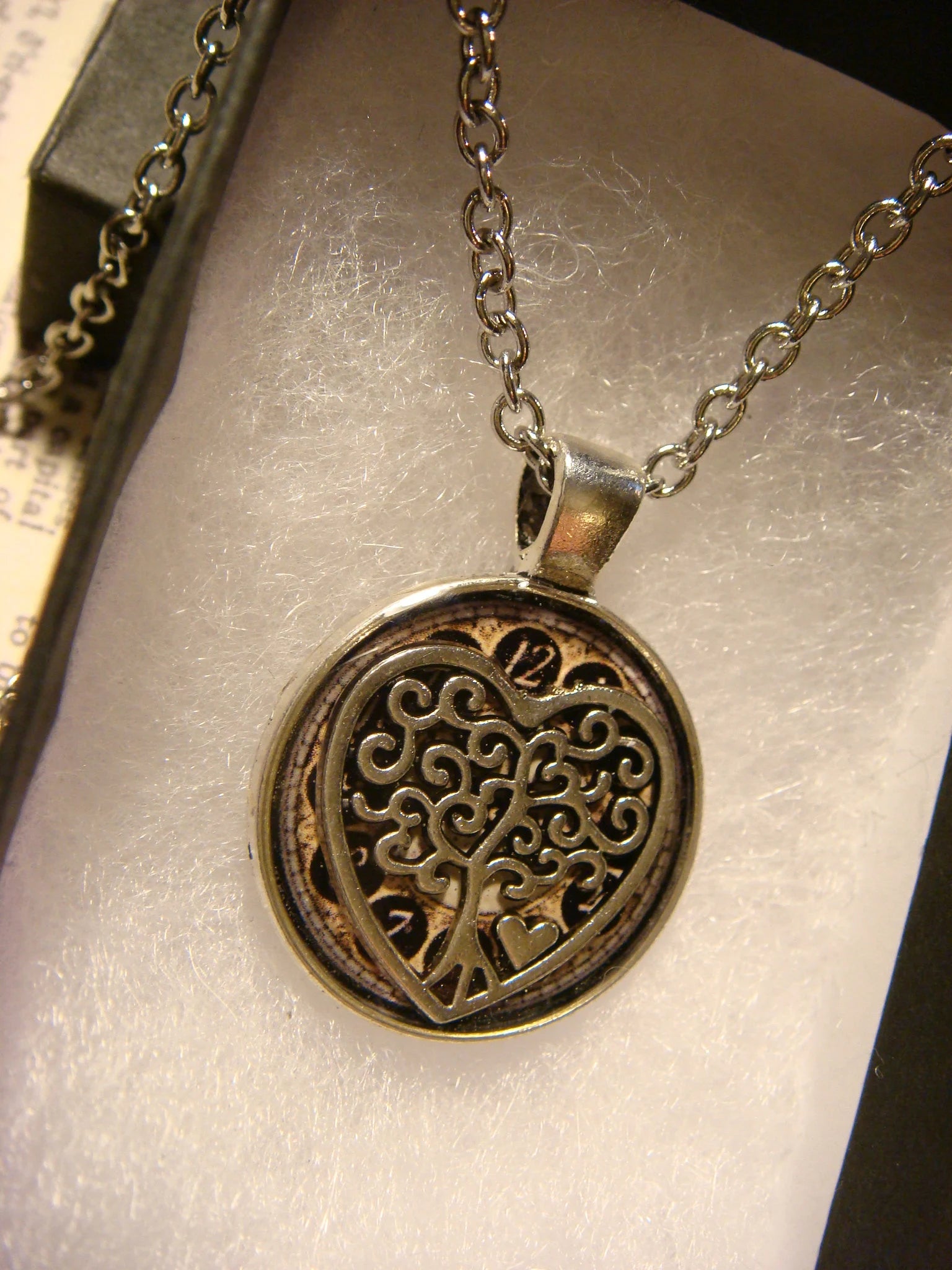 This necklace features an antique silver tree heart over a vintage clock image then encased in jewelers grade resin in a small antique silver setting.