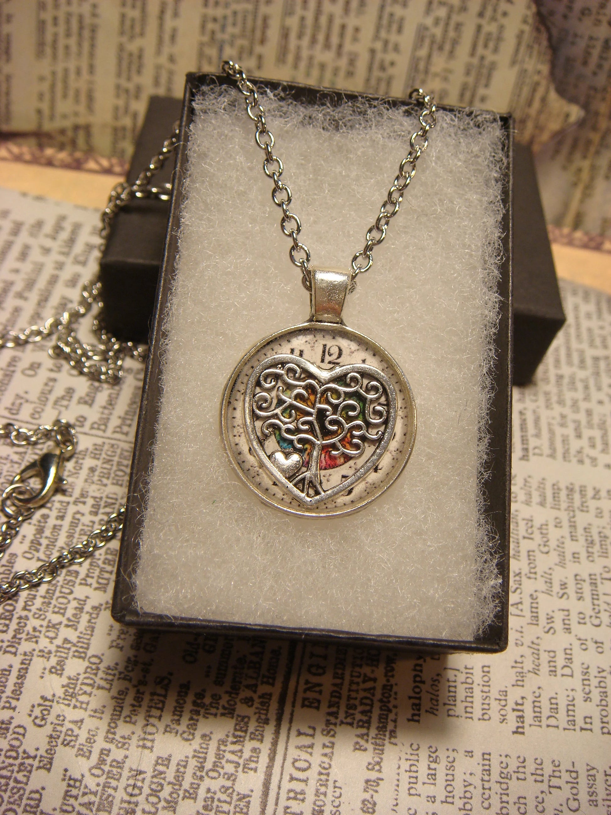 This beautiful necklace features an antique silver heart-shaped tree over a clock image then encased in jewelers grade resin in a small antique silver setting.