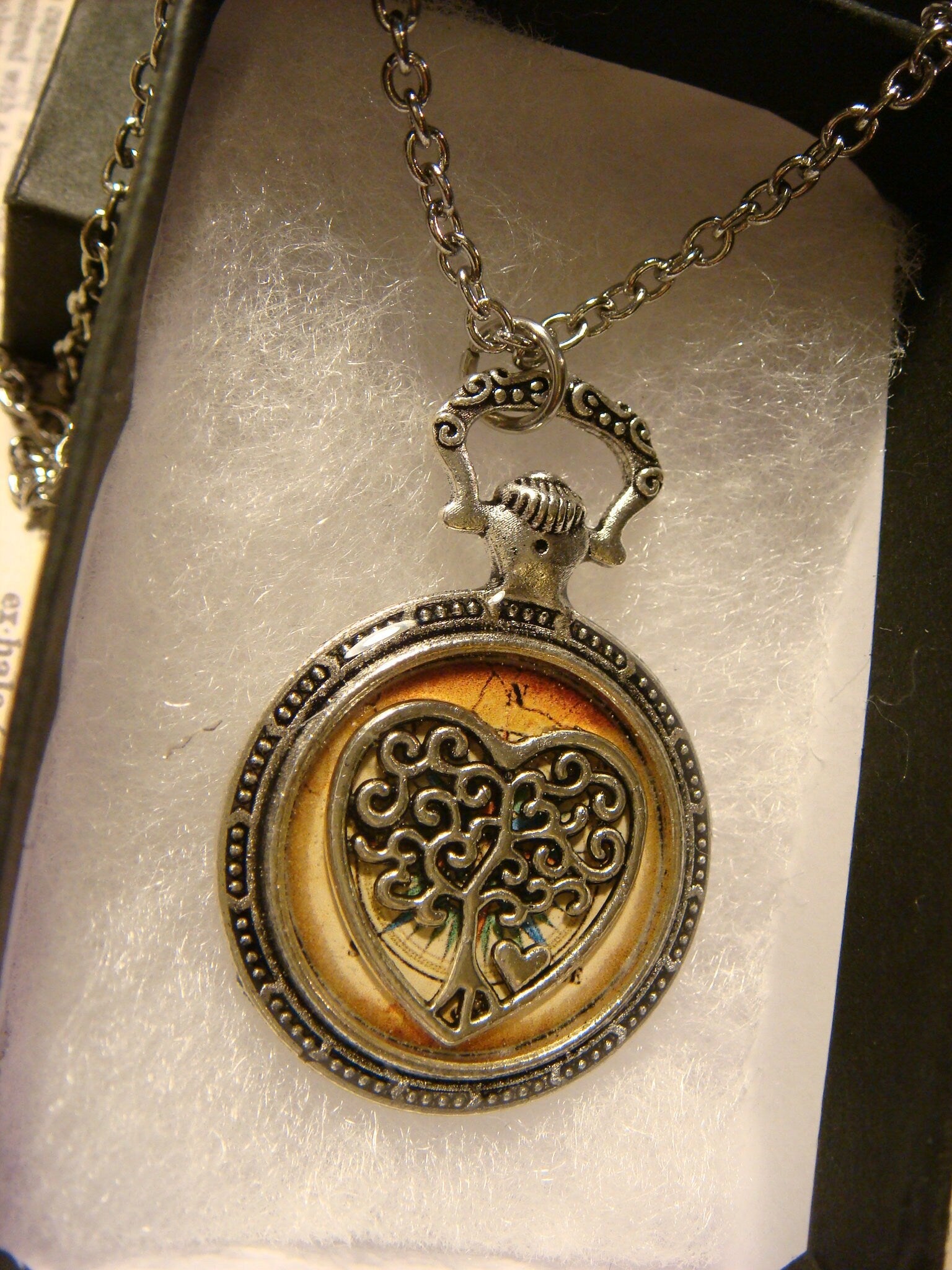 This beautiful necklace features an antique silver heart-shaped tree over the image of a vintage compass and encased with jewelers grade resin in a small antique silver pocket watch setting.
