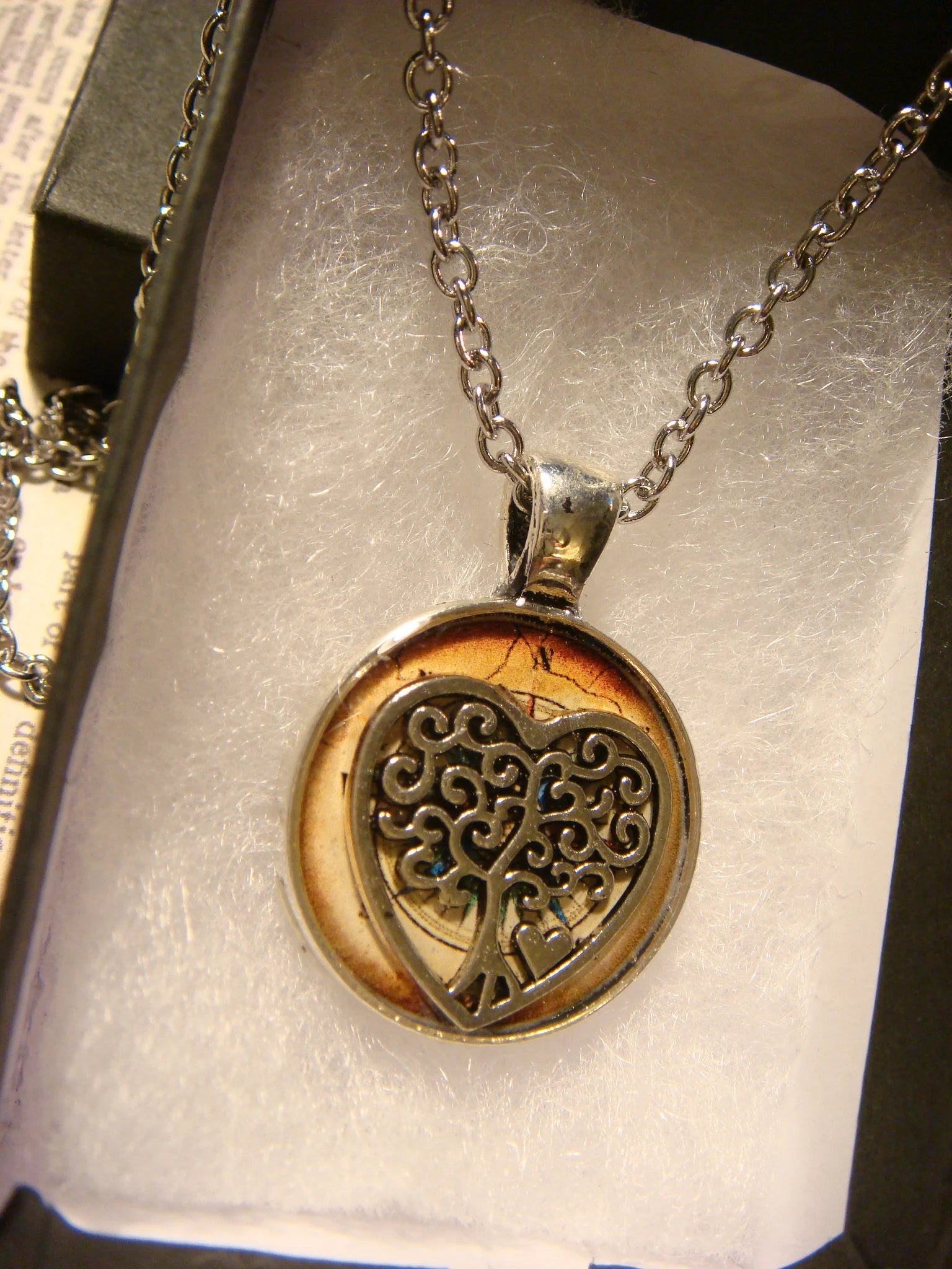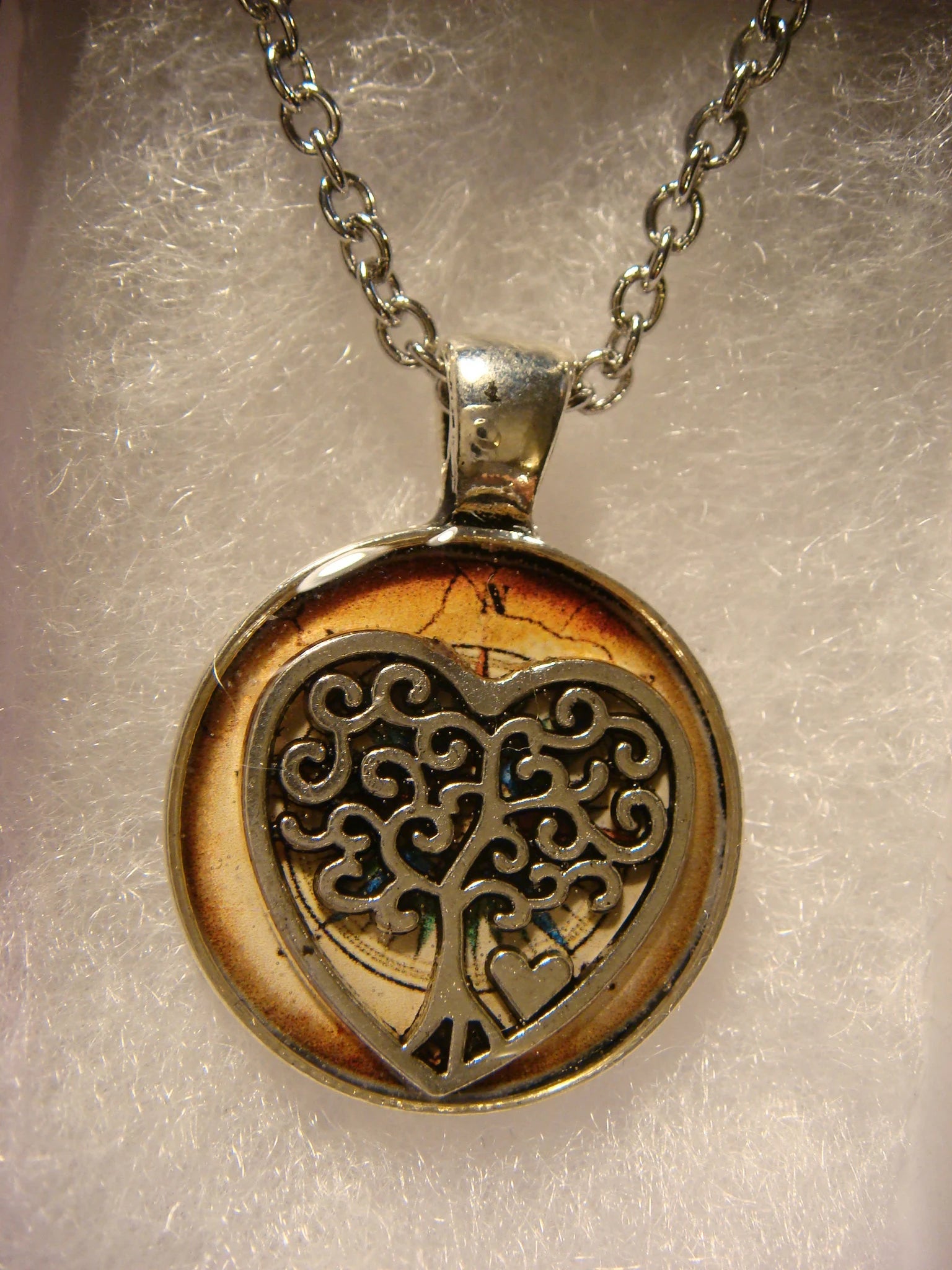 This beautiful necklace features an antique silver heart-shaped tree over a vintage compass image then encased in jewelers grade resin in a small antique silver setting.