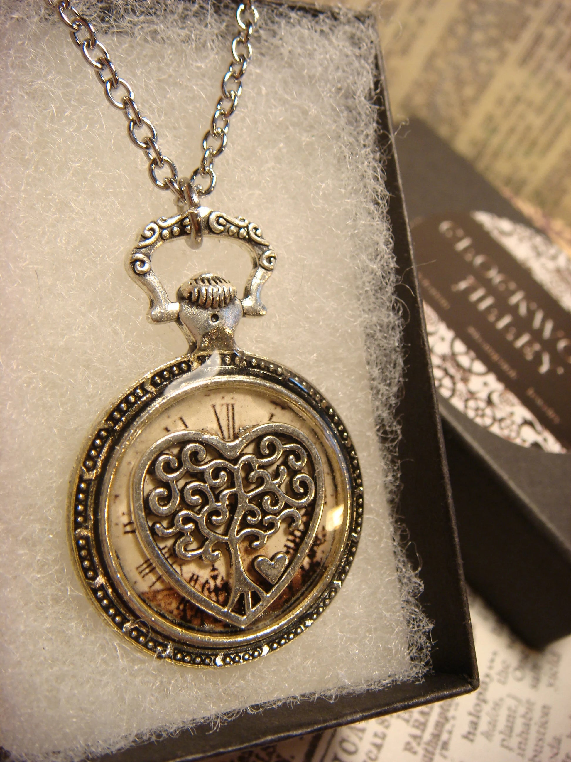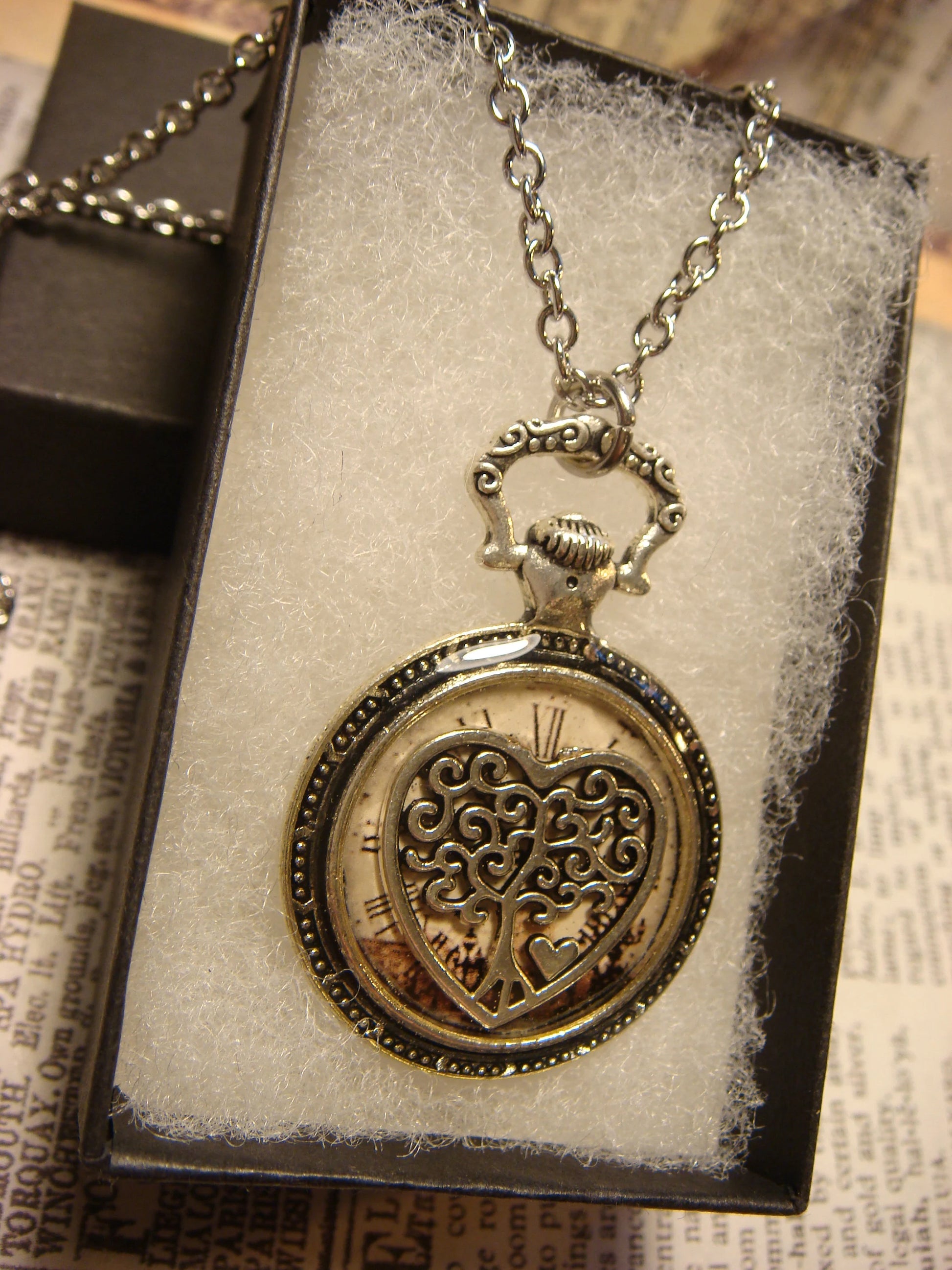 This beautiful necklace features an antique silver heart-shaped tree over the image of a Victorian-era clock and encased with jewelers grade resin in a small antique silver pocket watch setting.