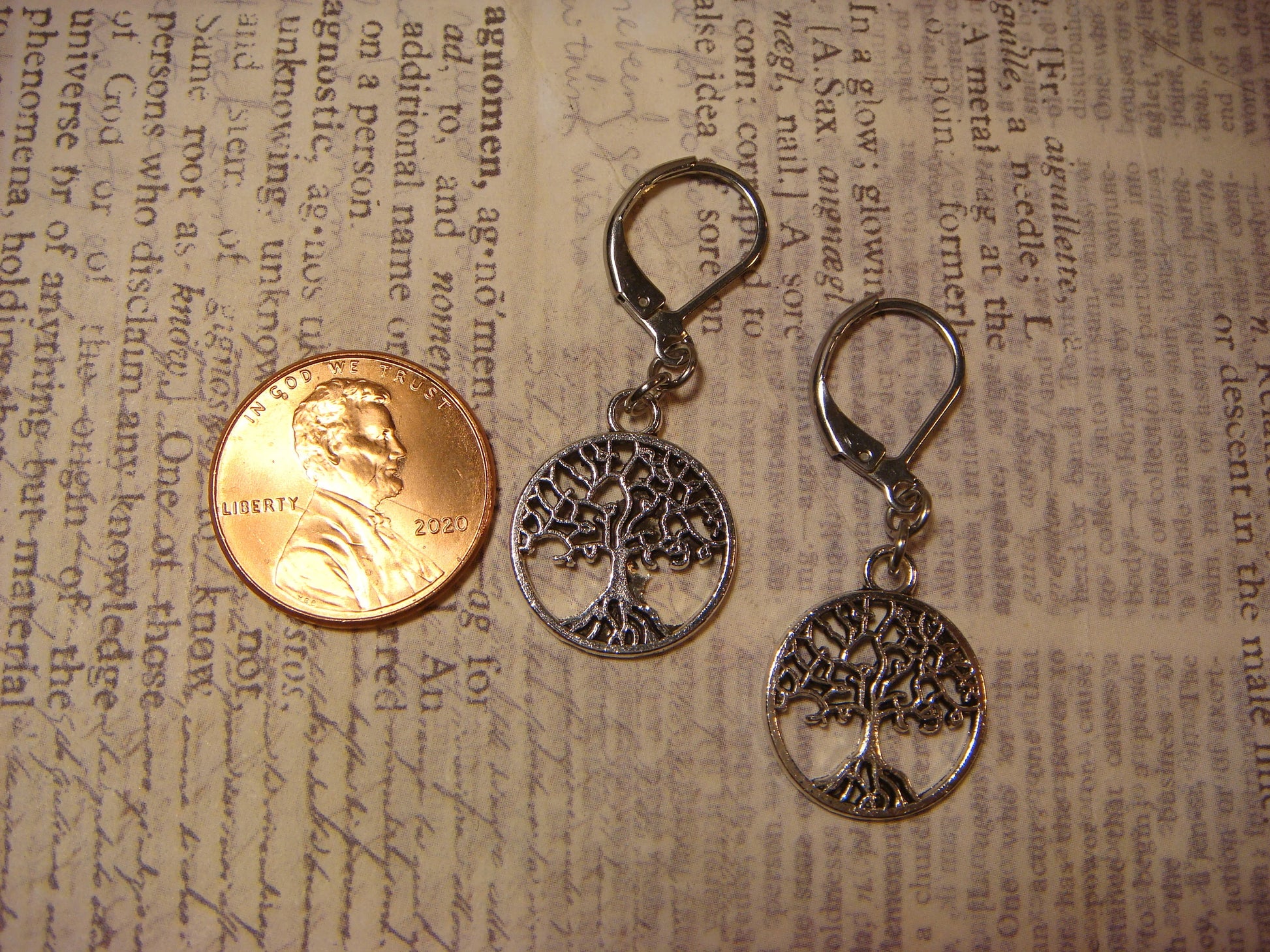These earrings are made with circle-shaped antique silver tree charms hanging on stainless steel lever back earrings.