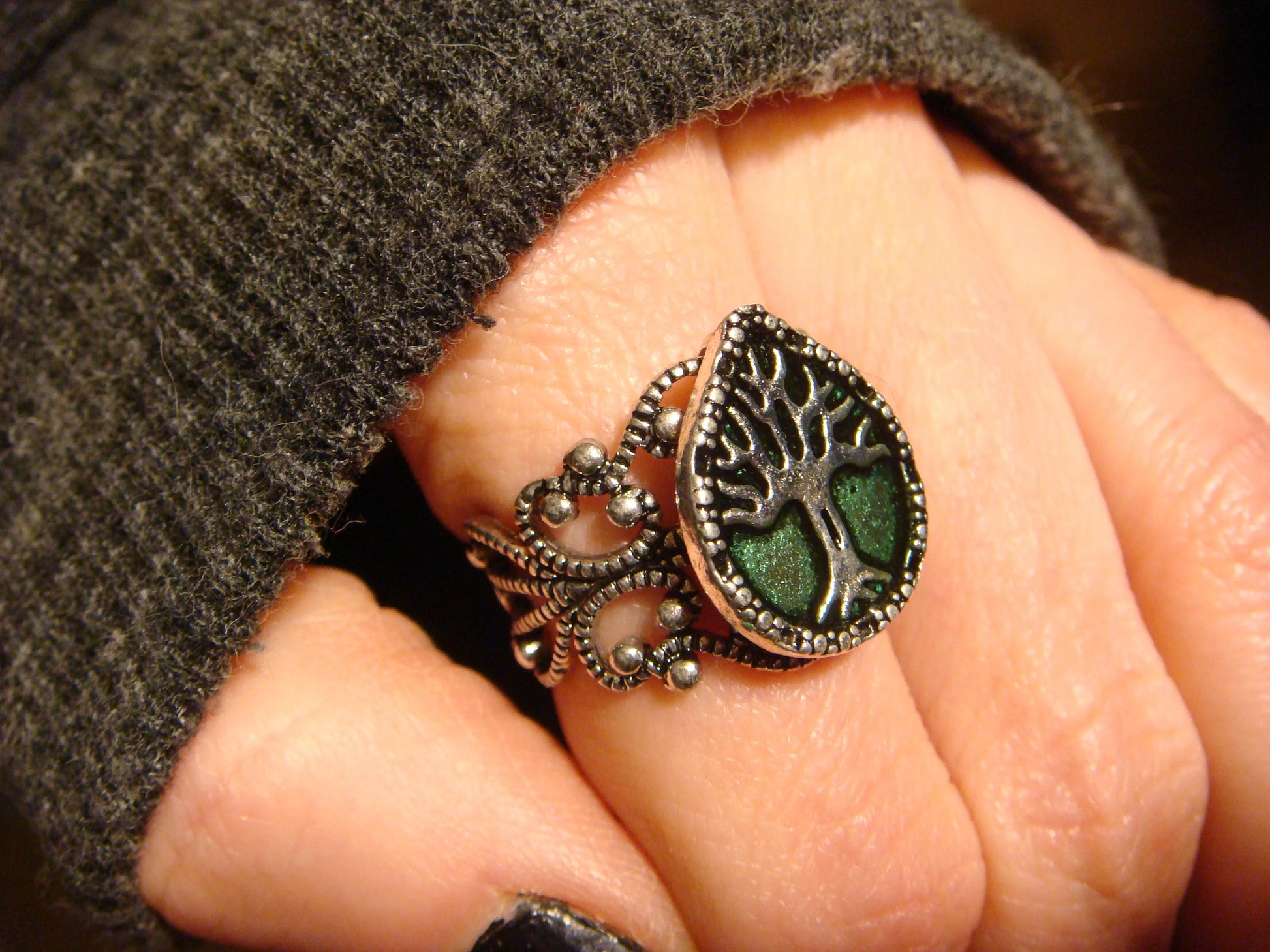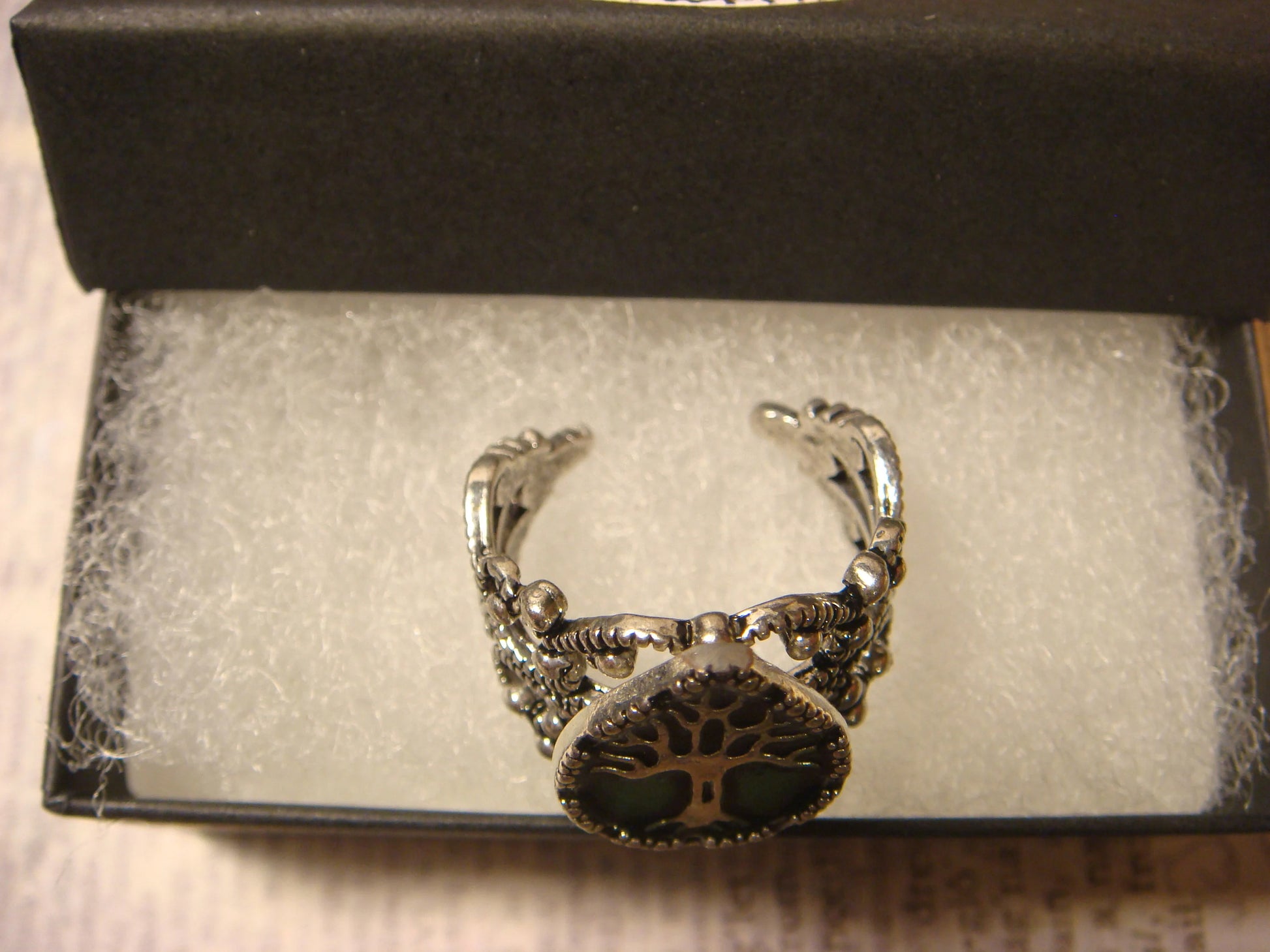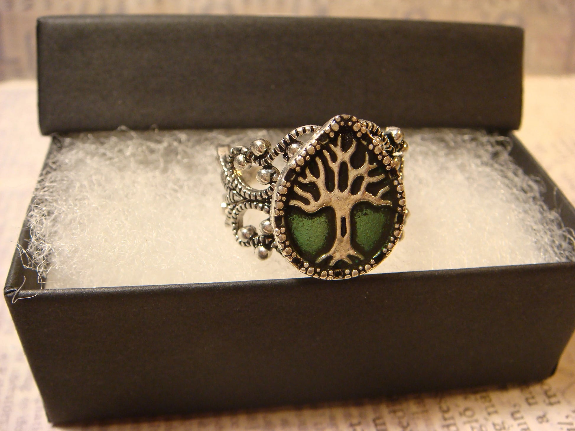 This beautiful ring features an antique silver and green tree set on a sturdy antique silver filigree Victorian style adjustable ring.