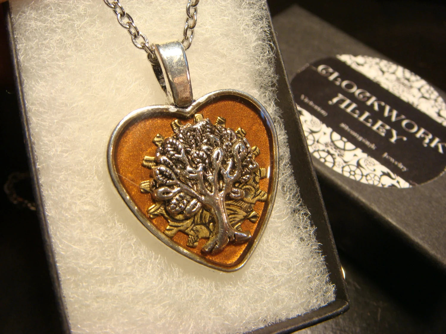 This beautiful necklace features an antique silver tree over a single antique bronze etched gear and set in jewelers resin in an antique silver heart pendant with an antique copper color background.