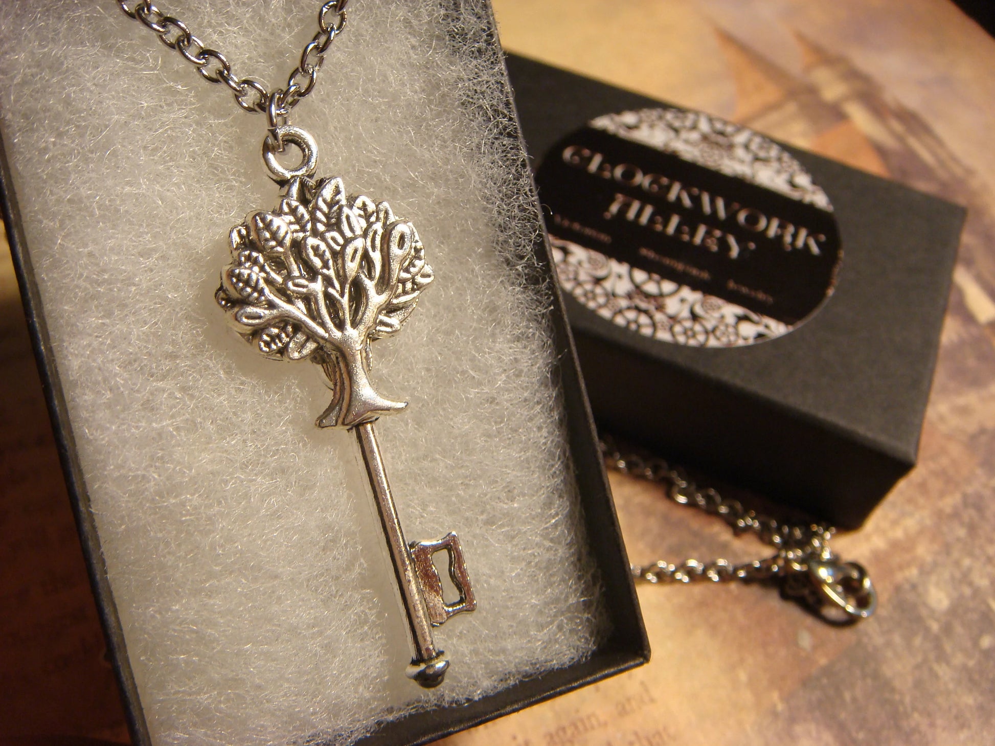 This necklace features an antique silver tree charm on a small antique silver skeleton key.