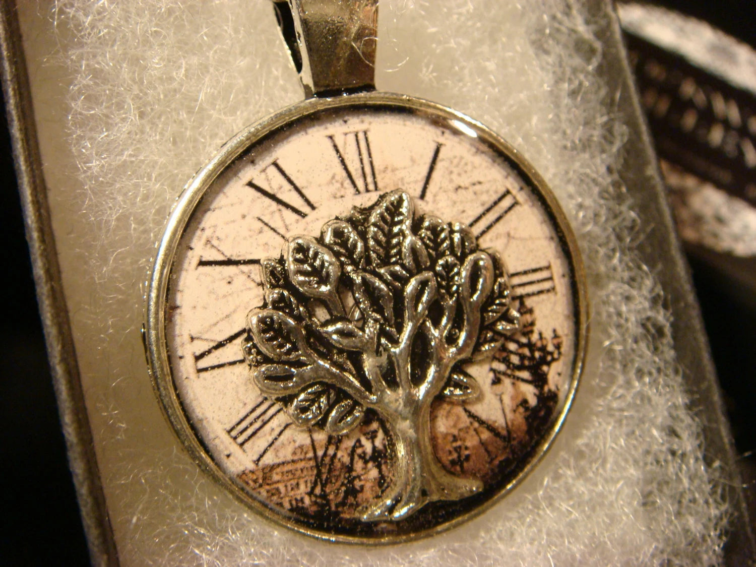 This beautiful necklace features an antique silver tree over a Victorian-era clock image encased in jewelers grade resin in an antique silver setting.