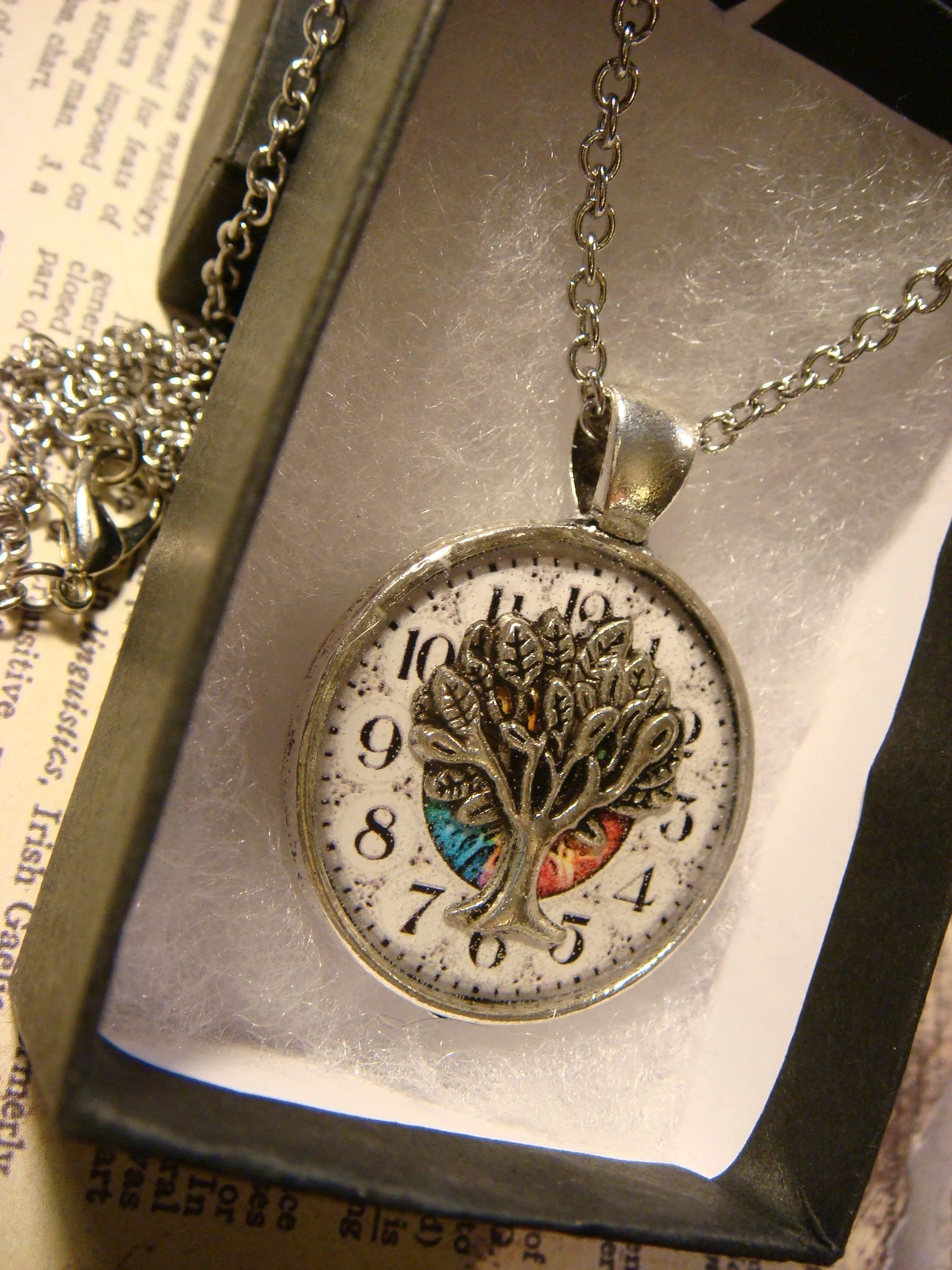 This beautiful necklace features an antique silver tree over a clock image then encased in jewelers grade resin in an antique silver setting.