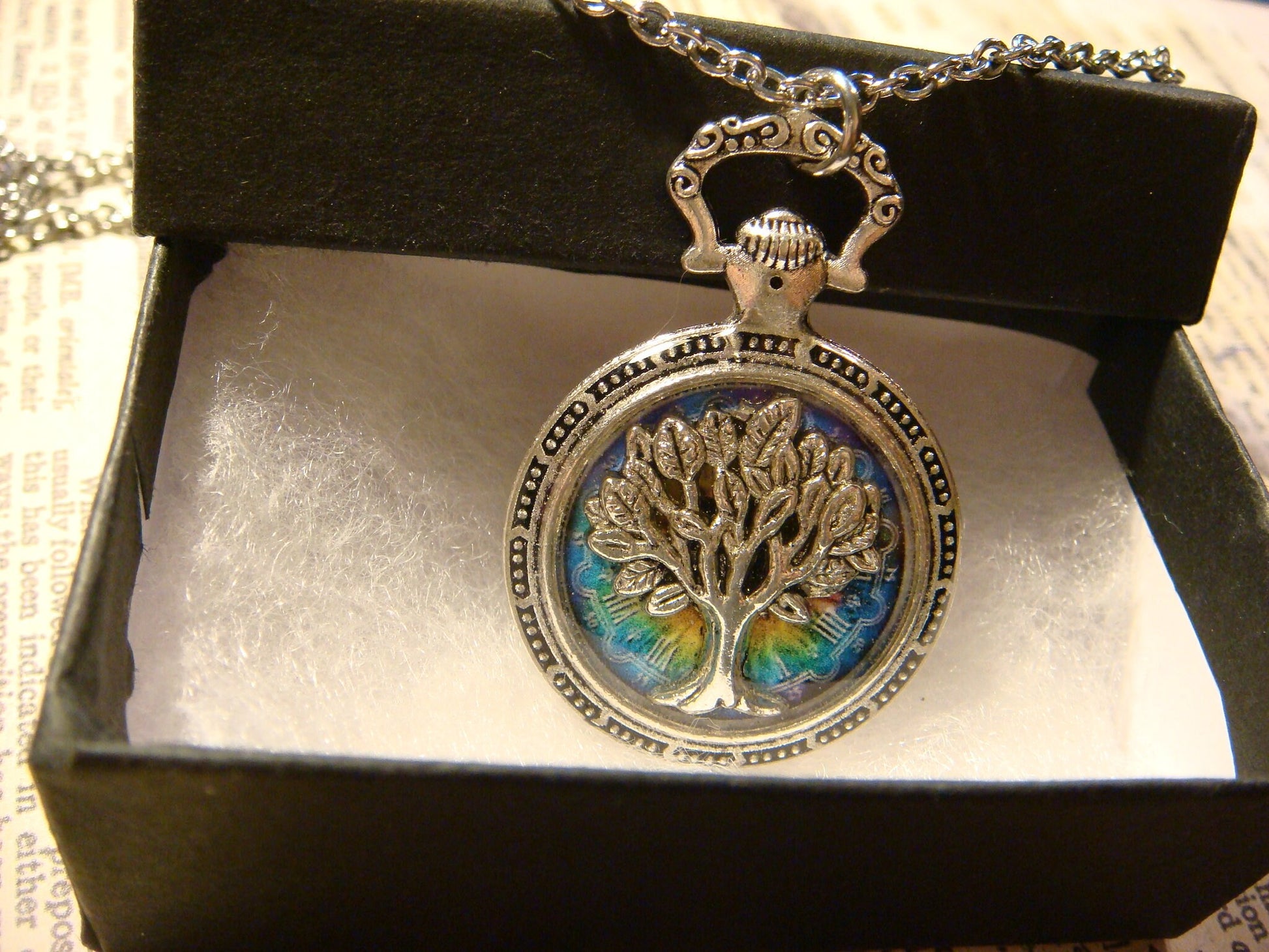 Tree of Life over Colorful Clock Pocket Watch Pendant Necklace