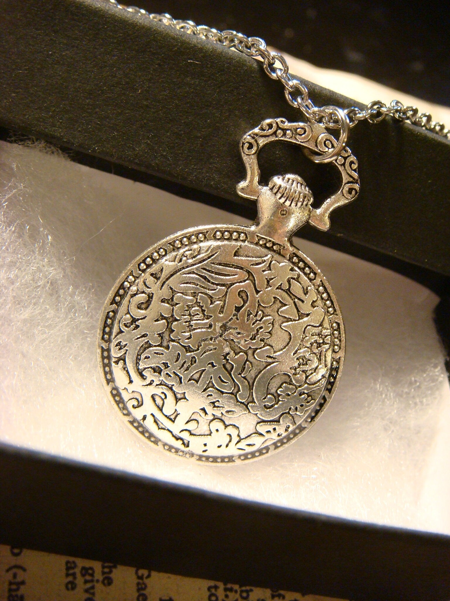 This beautiful necklace features an antique silver tree over the image of a colorful clock and encased with jewelers grade resin in a small antique silver pocket watch setting.