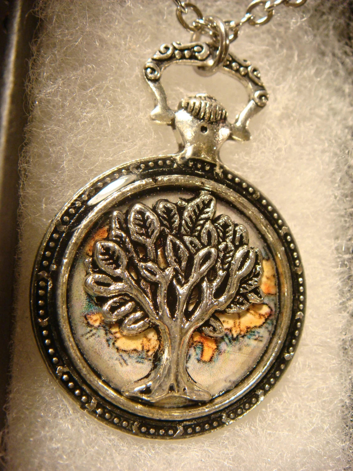 This beautiful necklace features an antique silver tree over the image of a vintage map and encased with jewelers grade resin in a small antique silver pocket watch setting.