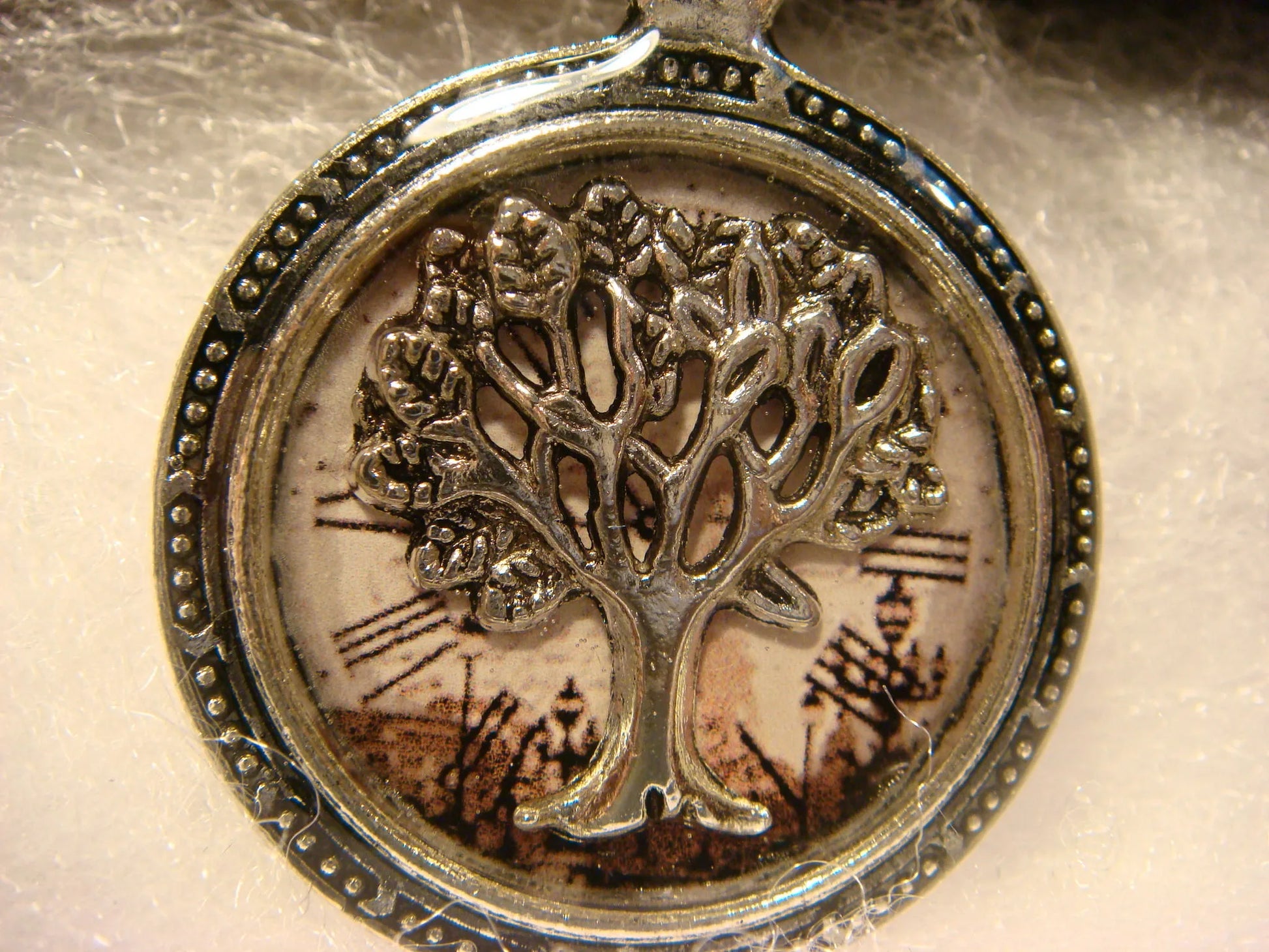 This beautiful necklace features an antique silver tree over the image of a Victorian-era clock and encased with jewelers grade resin in a small antique silver pocket watch setting.