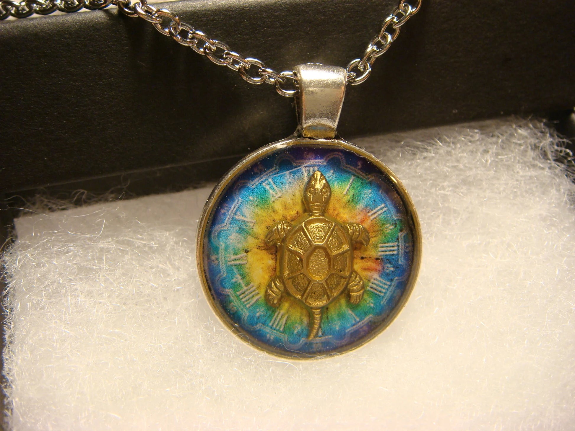 This beautiful necklace features a brass turtle over a colorful clock image then encased in jewelers grade resin in a small antique silver setting.