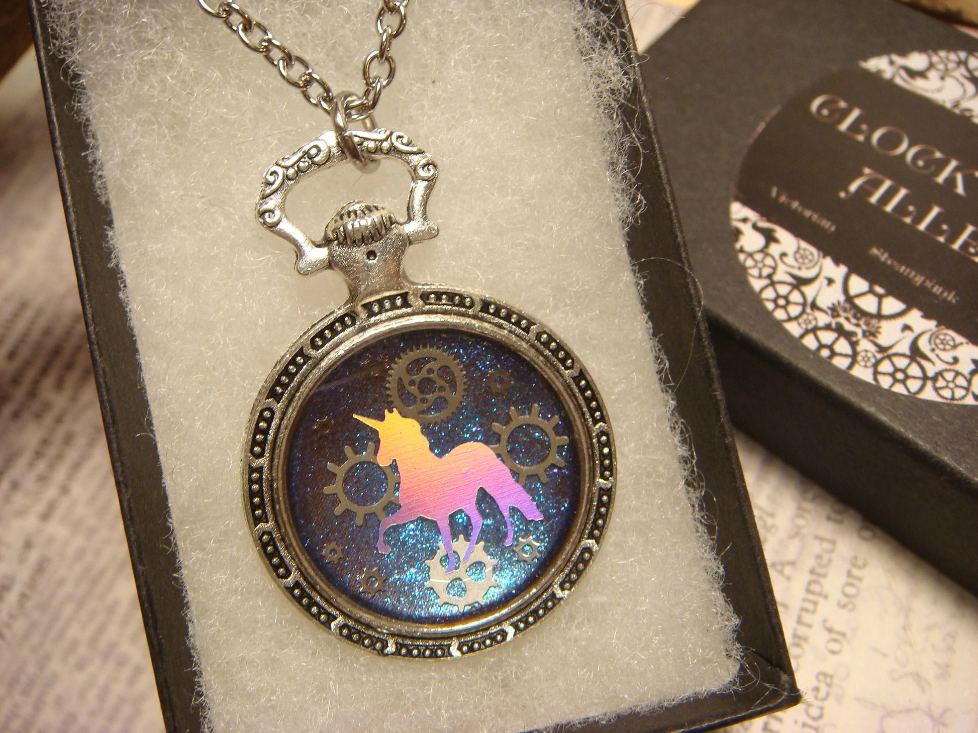 Unicorn and Gears Pocket Watch Pendant Necklace