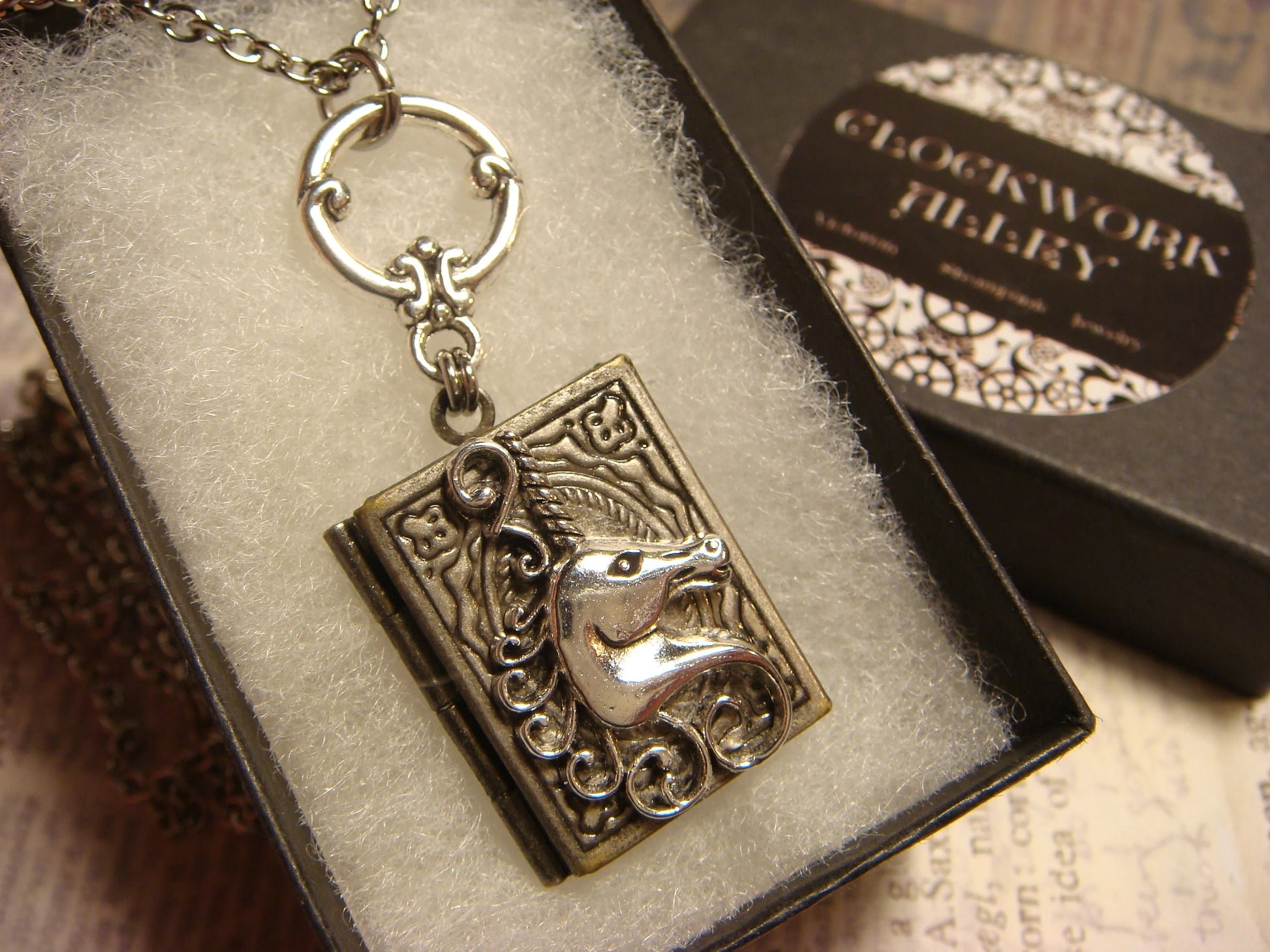 This necklace features an antique silver unicorn on top of an antique silver vintage style book locket.