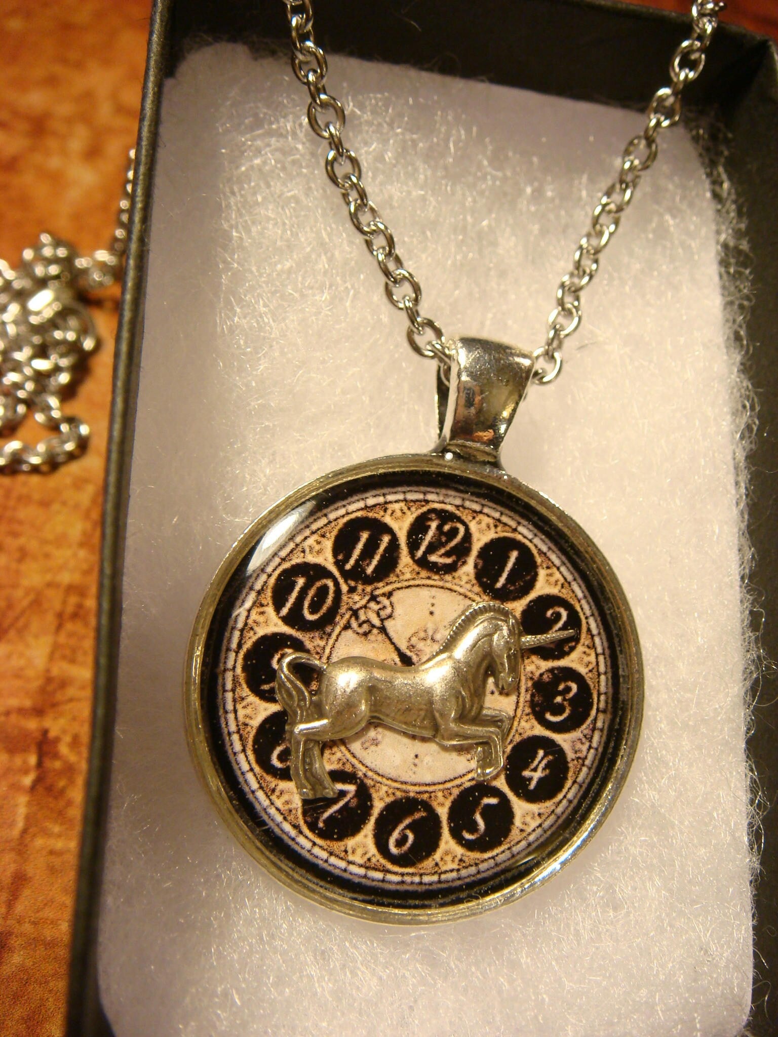 This beautiful necklace features an antique silver unicorn over a vintage clock image then encased in jewelers grade resin in an antique silver setting.