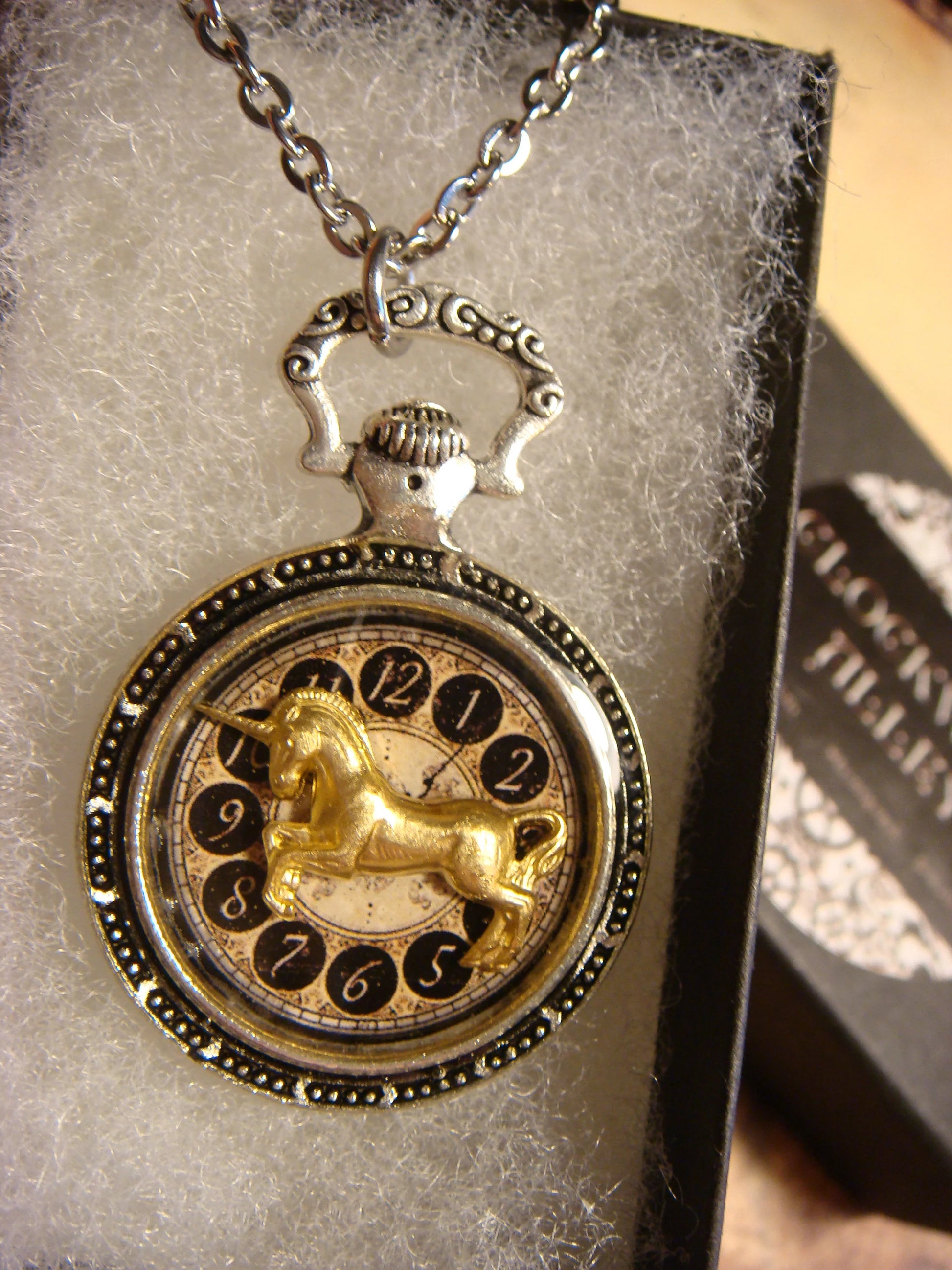 This beautiful necklace features a brass unicorn over the image of a vintage clock and encased with jewelers grade resin in a small antique silver pocket watch setting.