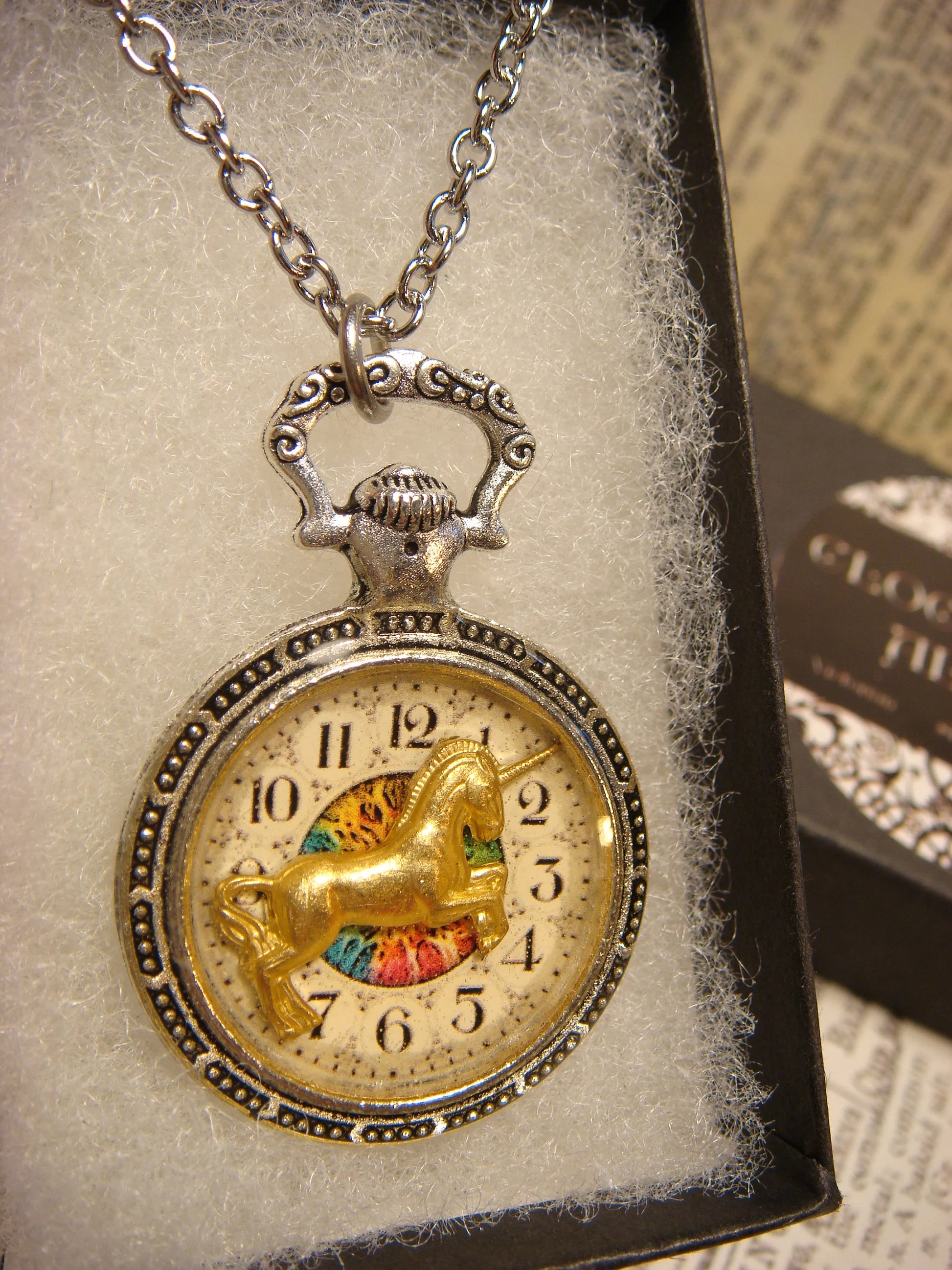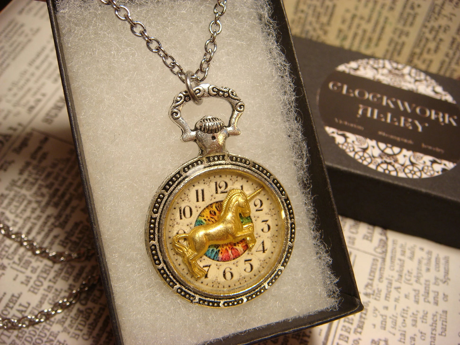 Unicorn over Clock Pocket Watch Pendant Necklace