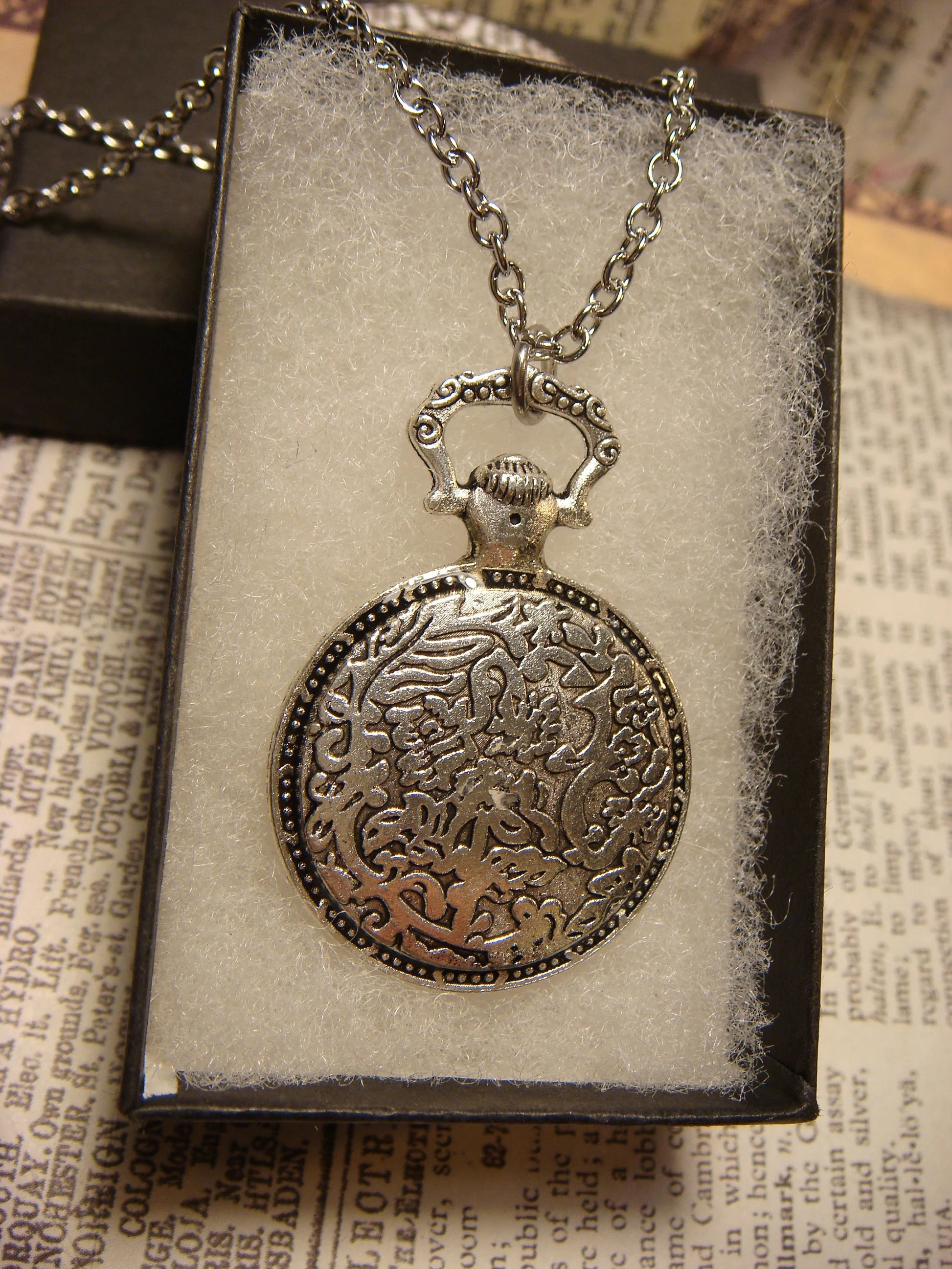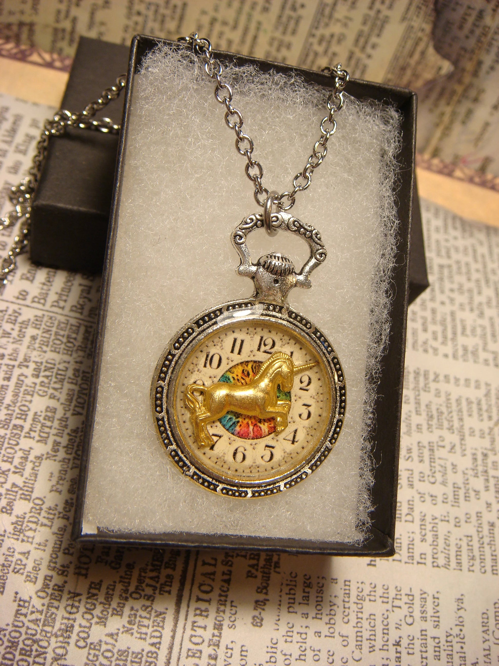 This necklace features a brass unicorn over the image of a clock and encased with jewelers grade resin in a small antique silver pocket watch setting.