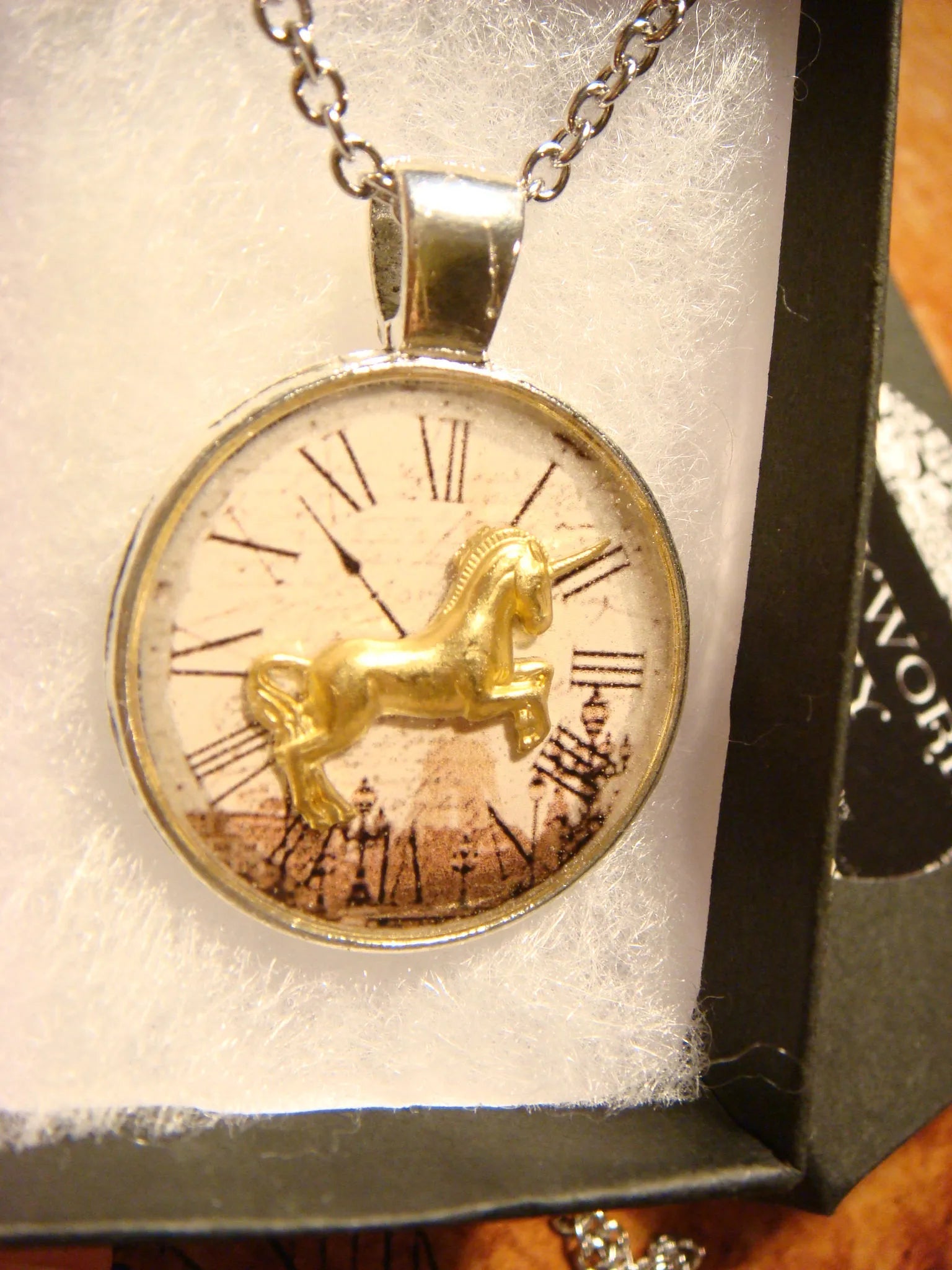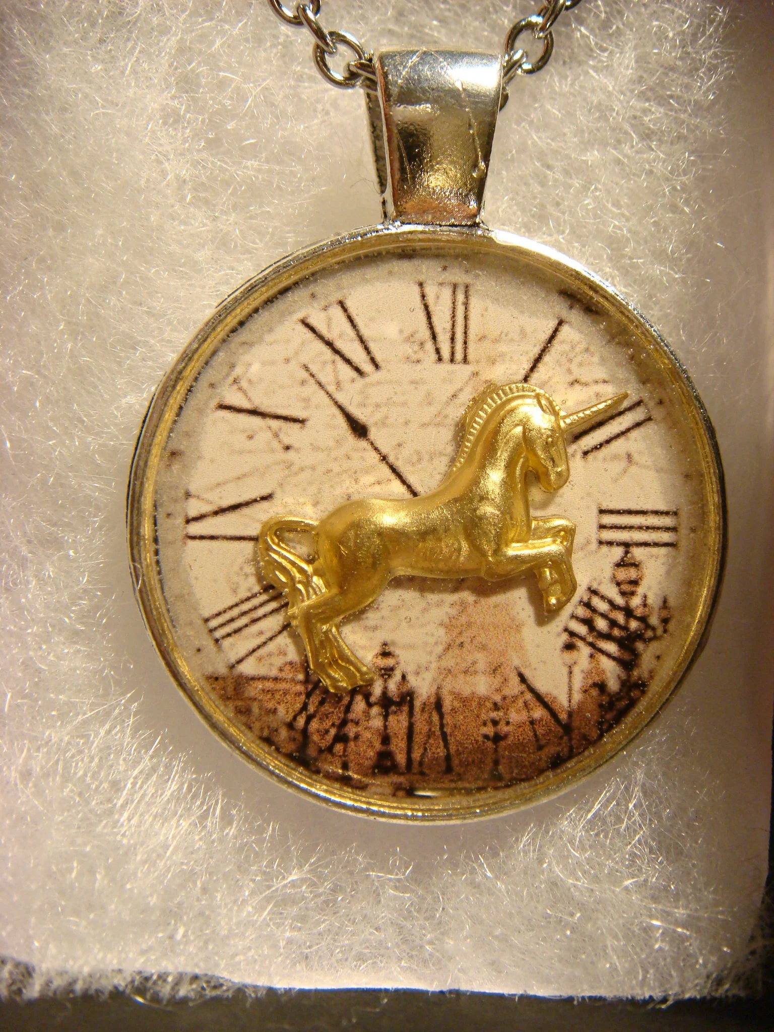 This beautiful necklace features a brass unicorn over a Victorian-era clock image then encased in jewelers grade resin in an antique silver setting.