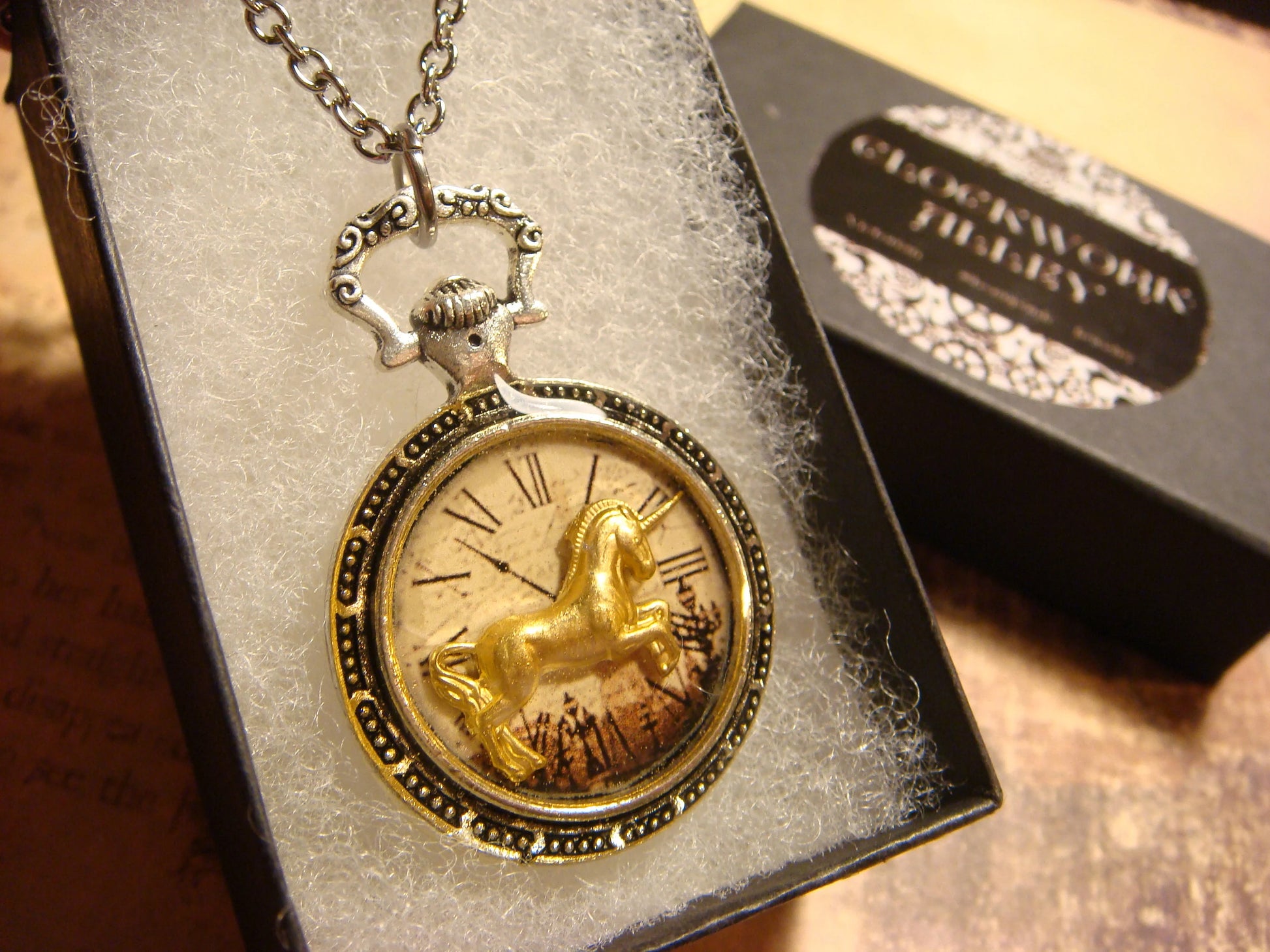 Unicorn over Victorian Clock Pocket Watch Pendant Necklace