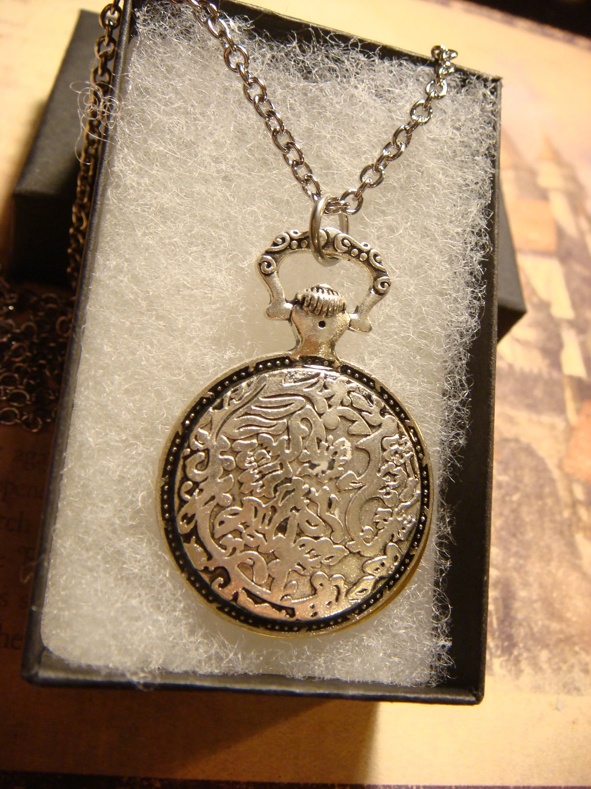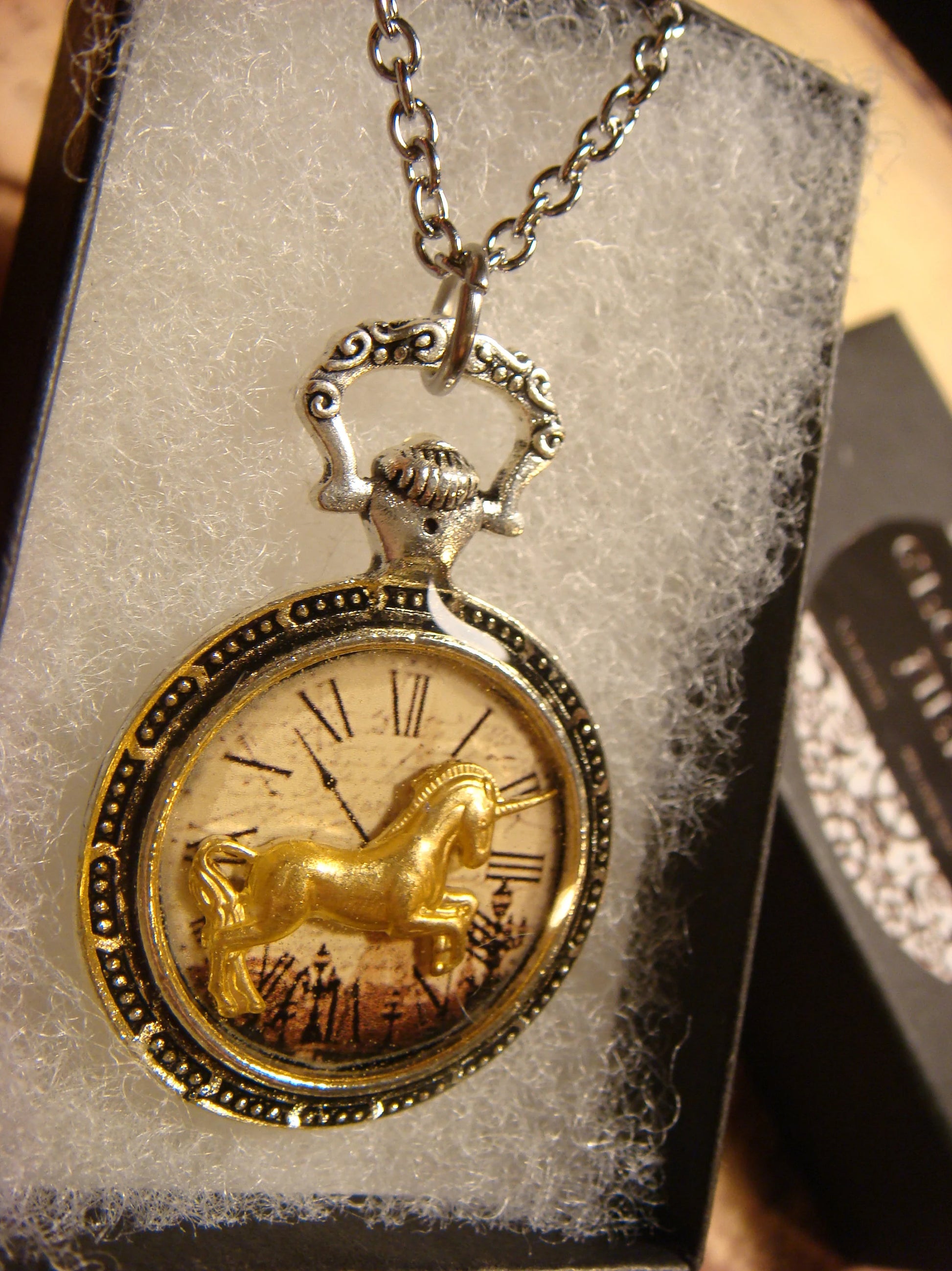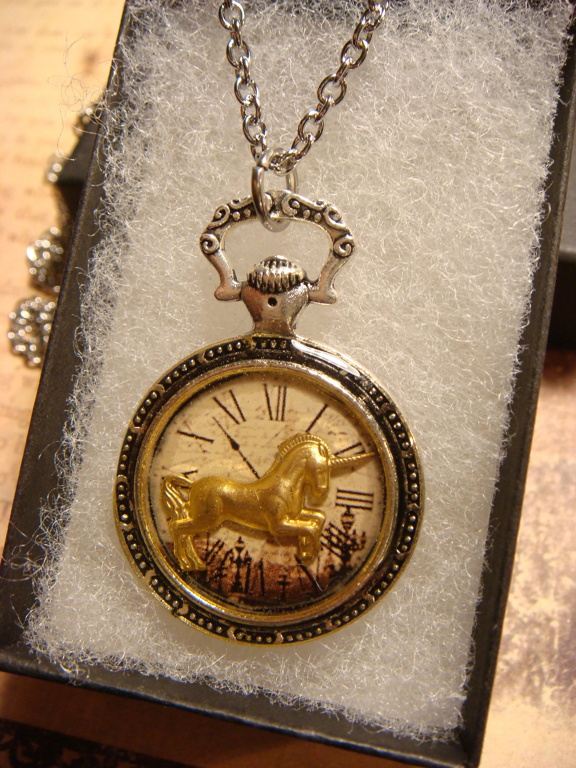This beautiful necklace features a brass unicorn over the image of a Victorian-era clock and encased with jewelers grade resin in a small antique silver pocket watch setting.