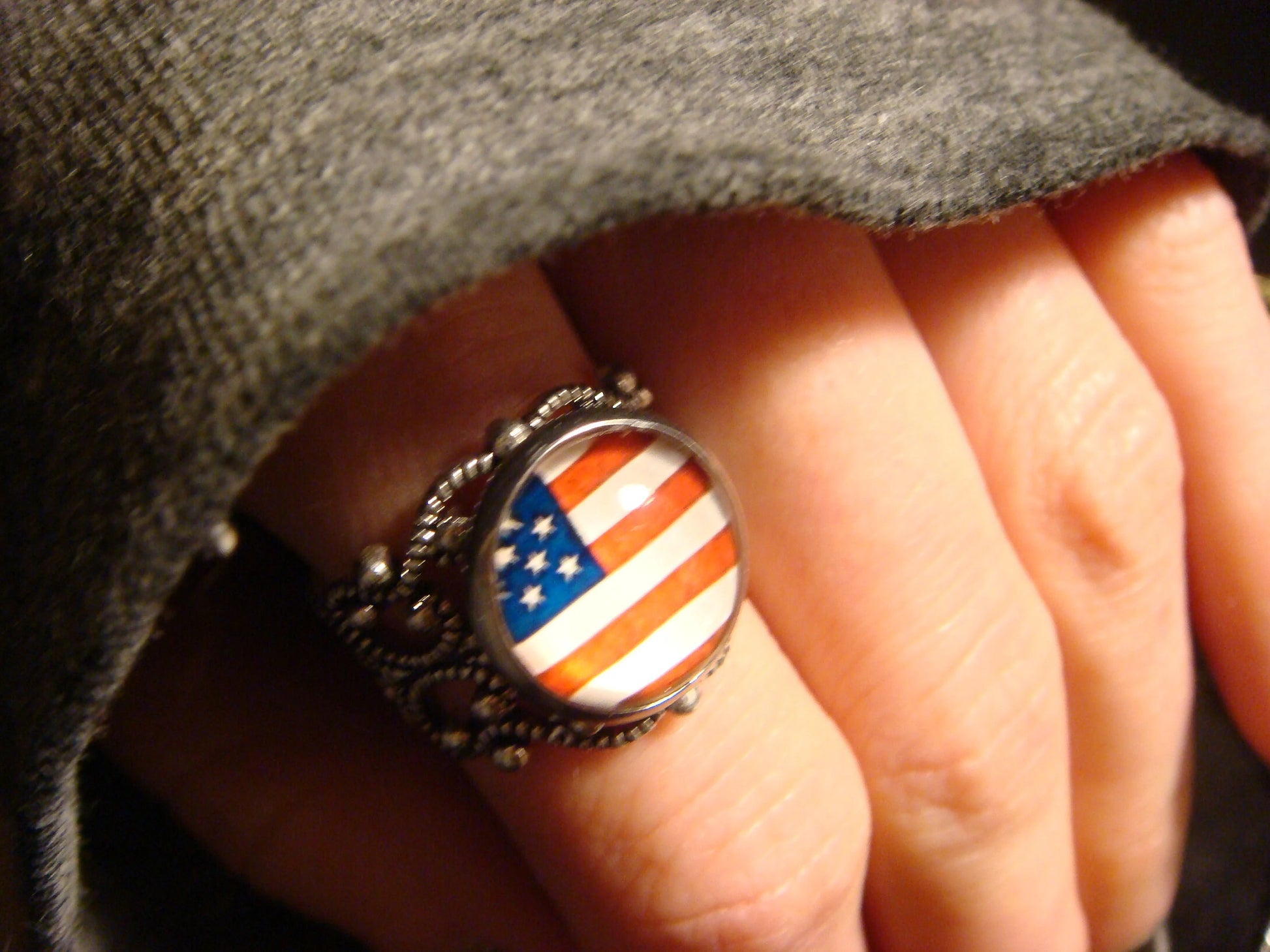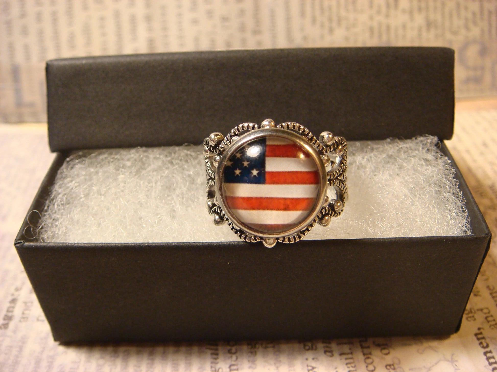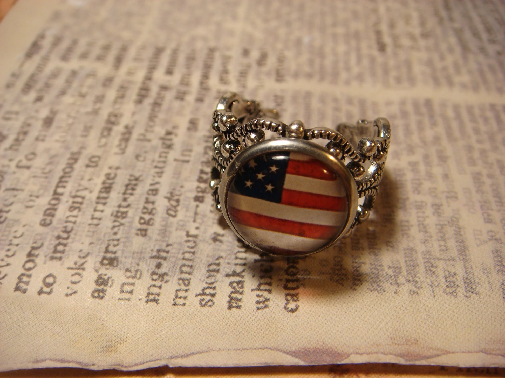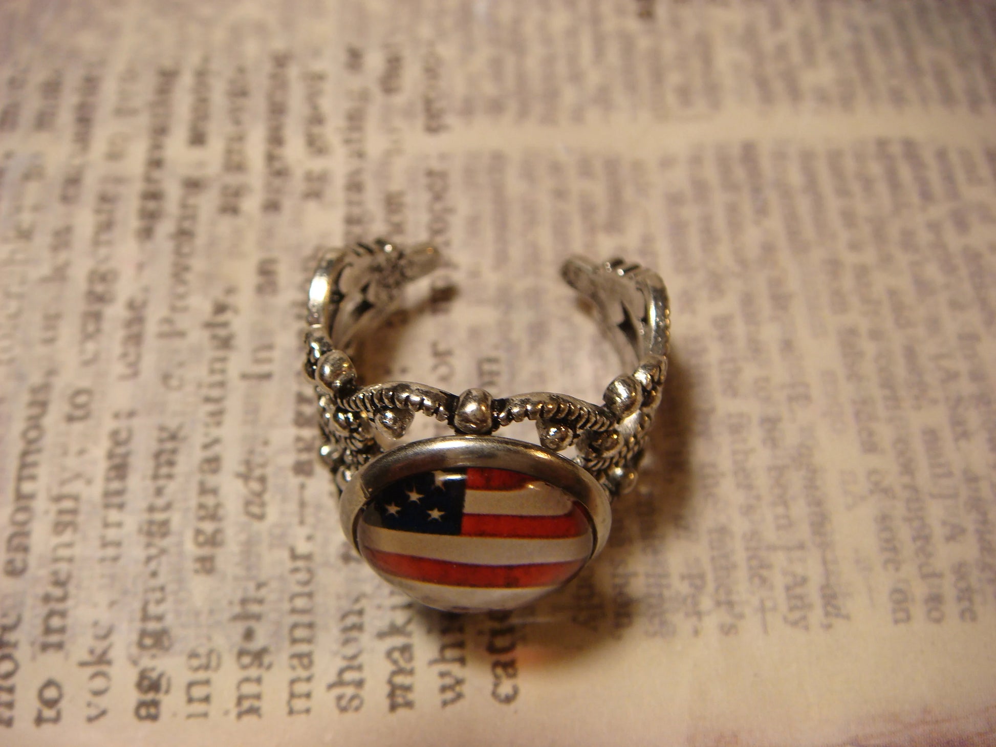This ring features an American flag image cabochon set on a sturdy antique silver filigree Victorian style adjustable ring.