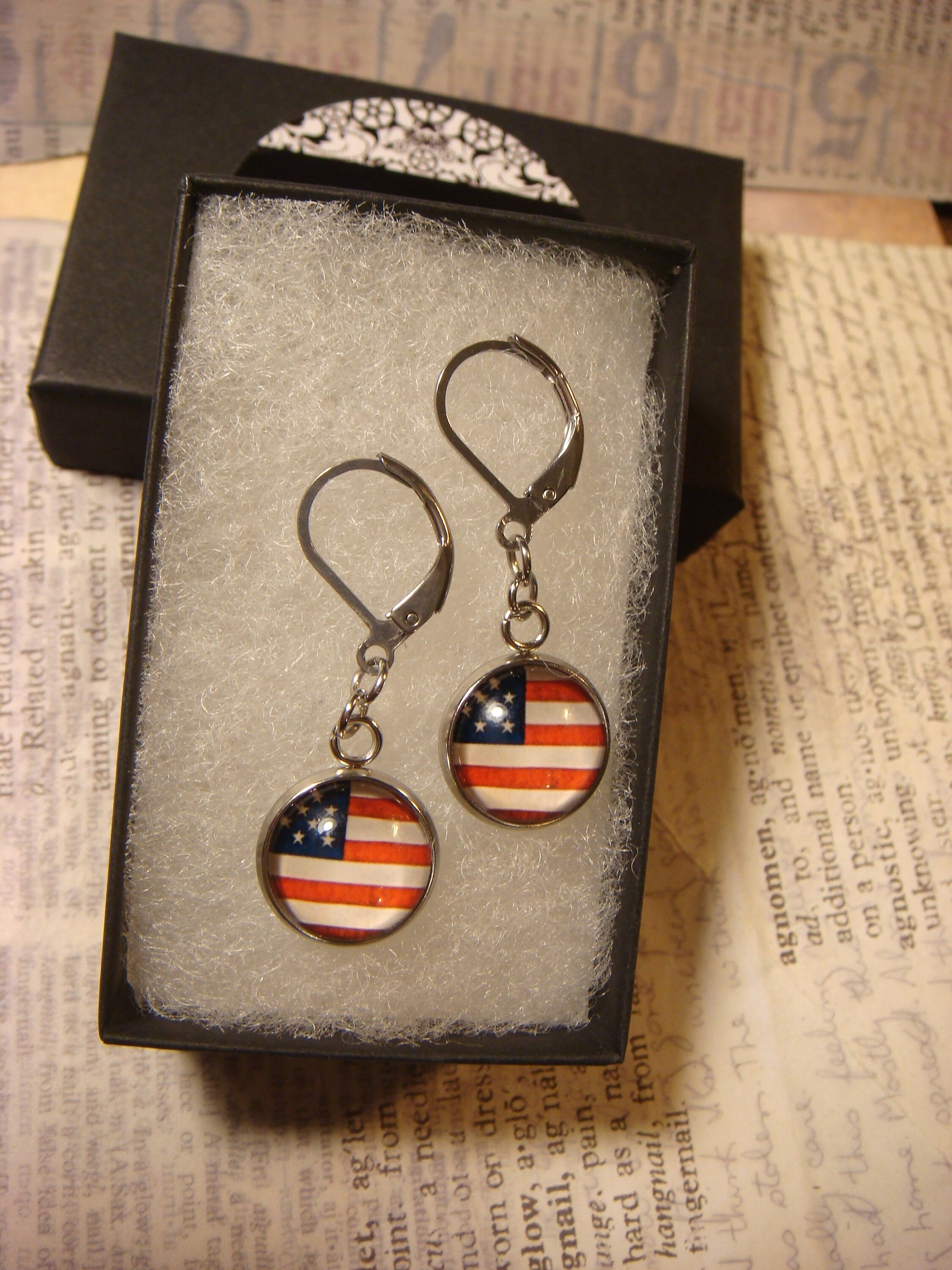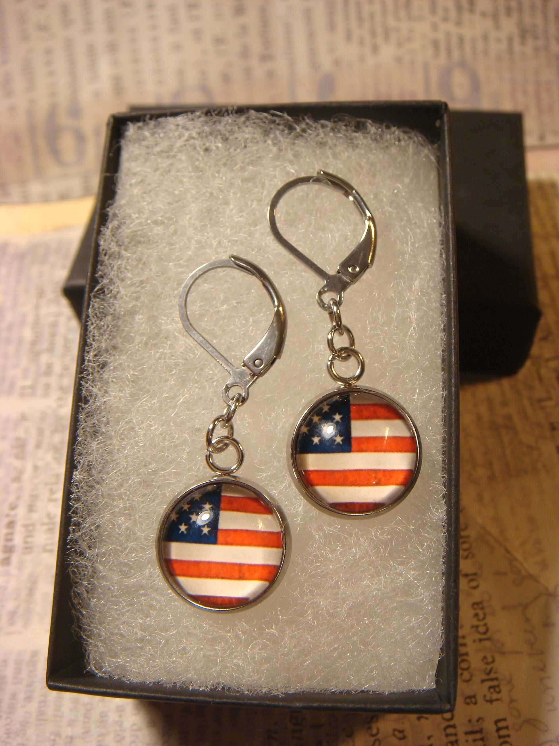 These earrings are made with American flag image cabochons on stainless steel settings hanging on stainless steel lever back earrings.