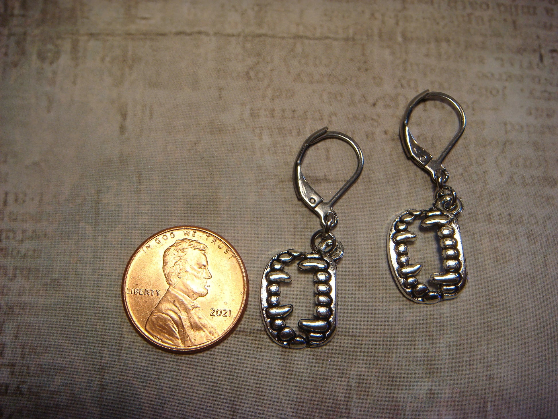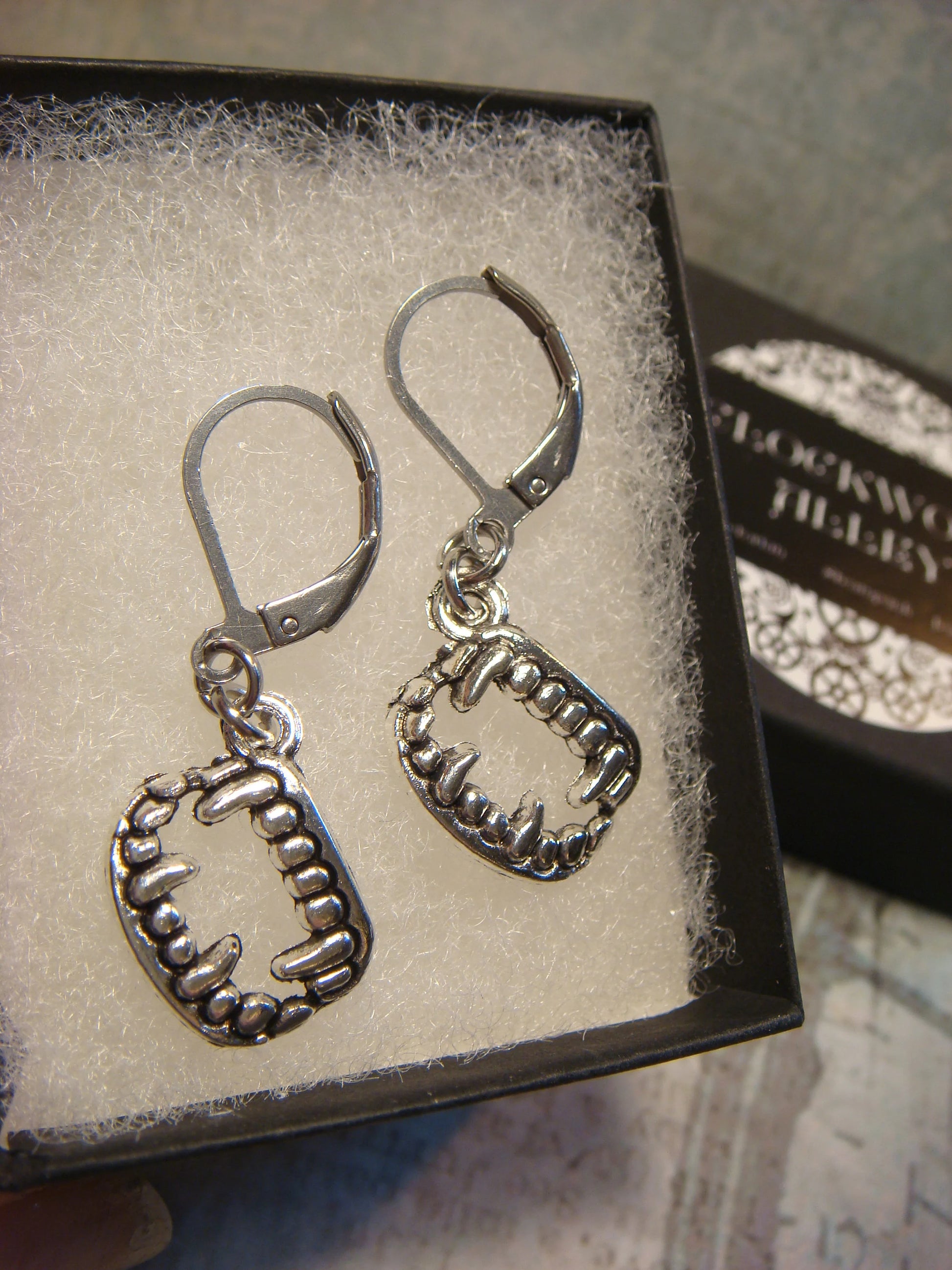These earrings are made with antique silver vampire fangs hanging on stainless steel lever back earrings.