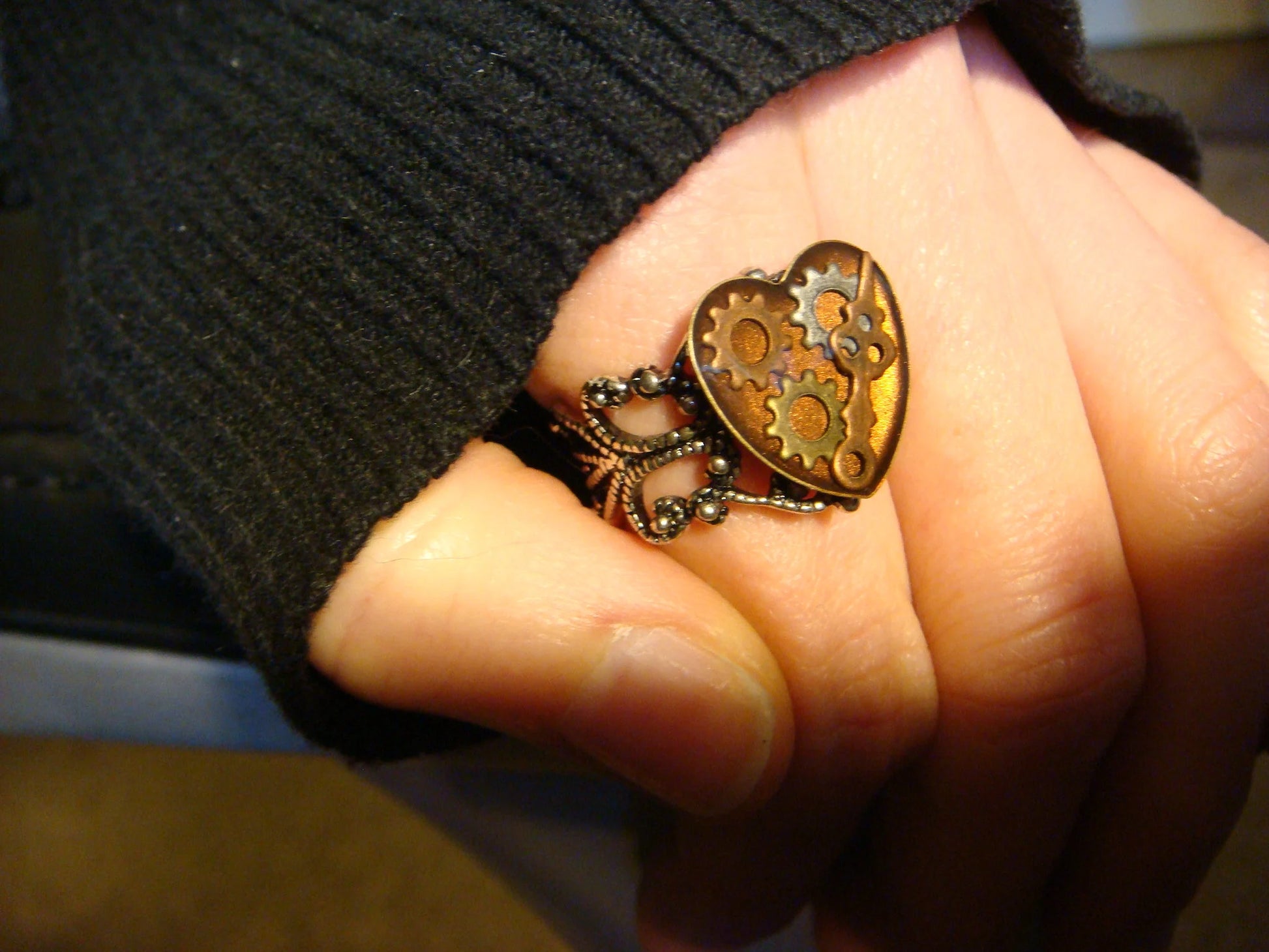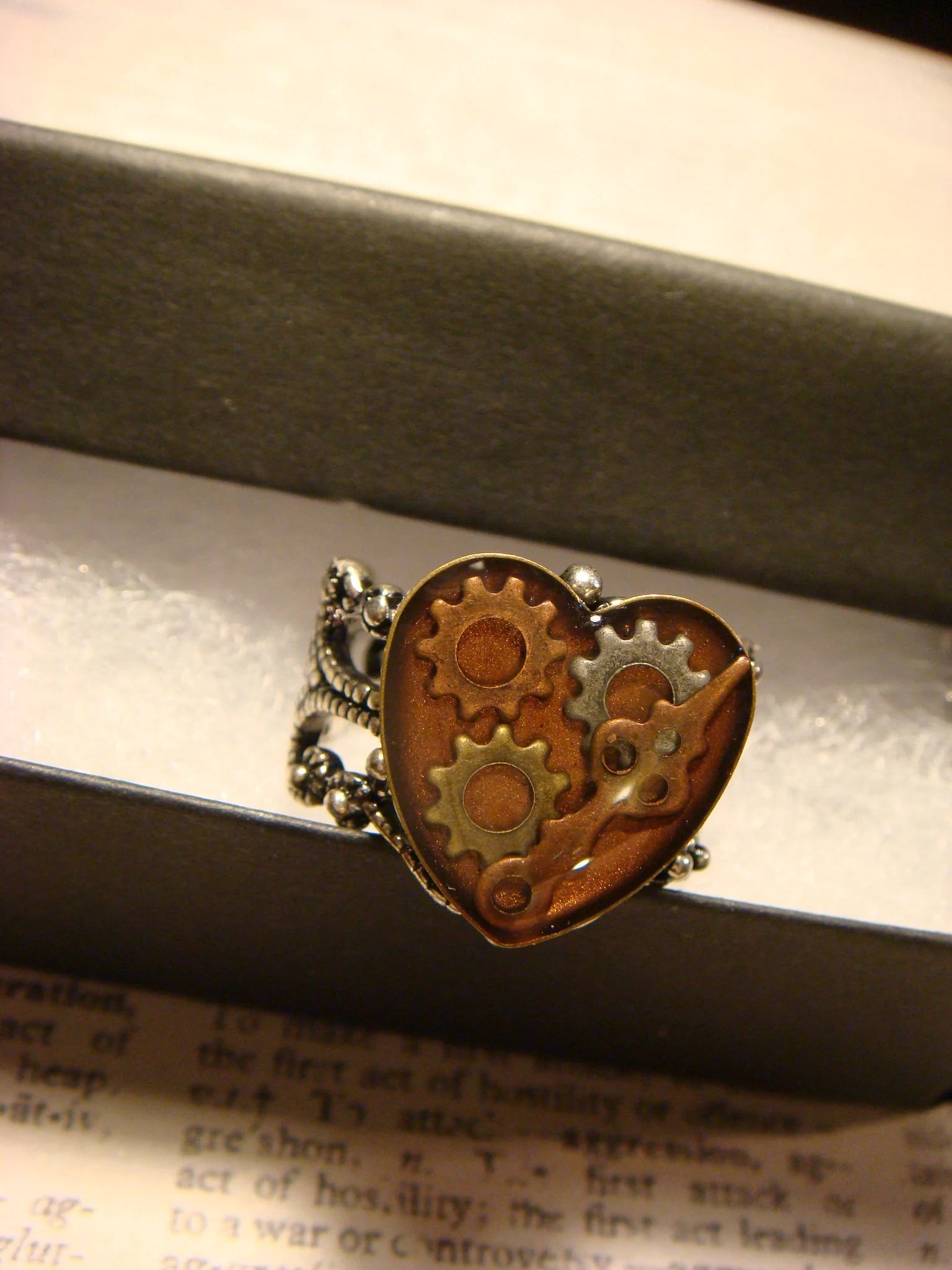 This unique ring features watch parts that are set in ice resin in a heart bezel that is attached to a sturdy adjustable antique silver ring.