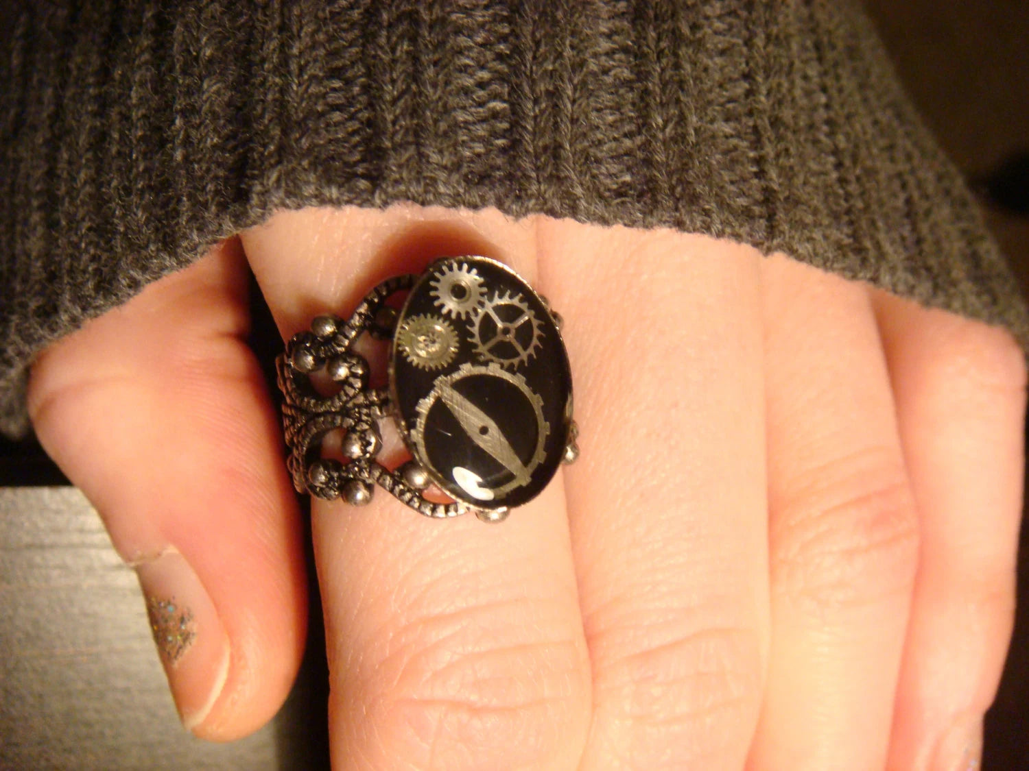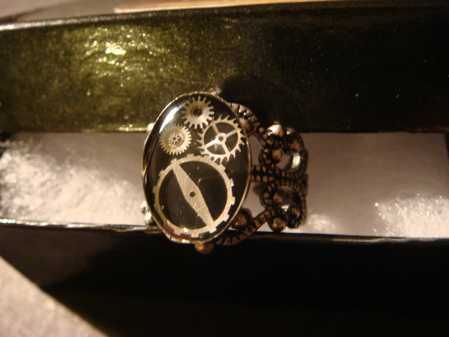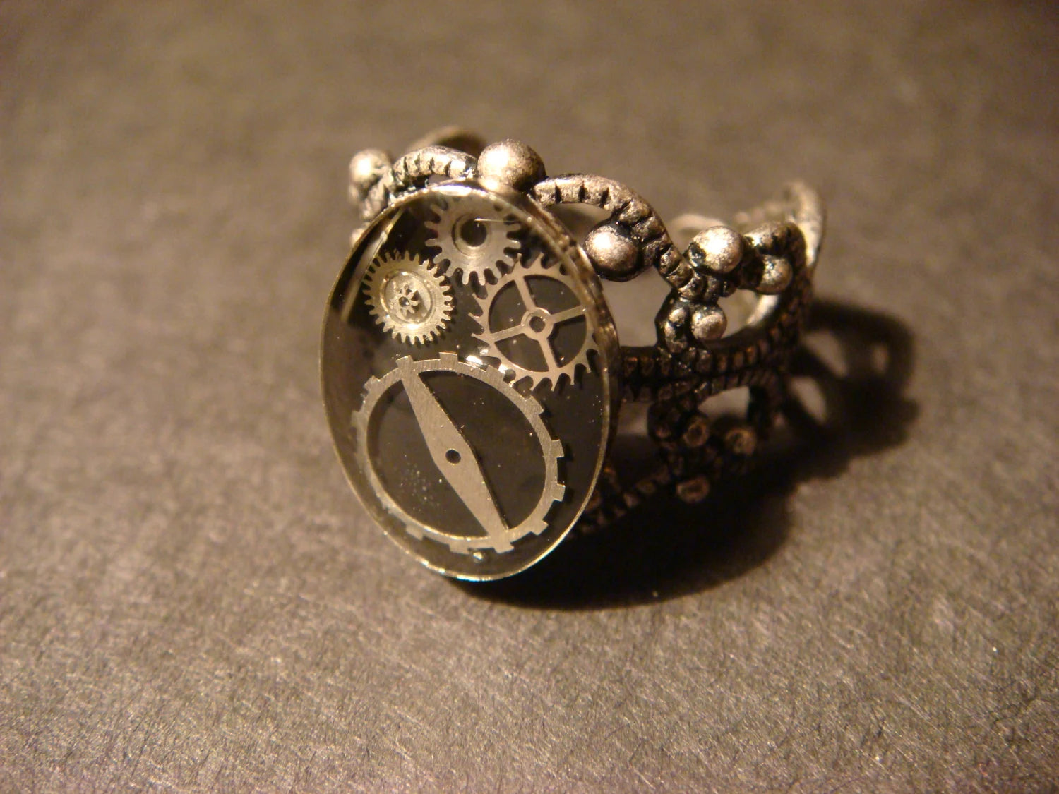 This beautiful steampunk ring features upcycled watch parts on a black background and set on a sturdy antique silver filigree Victorian style adjustable ring.